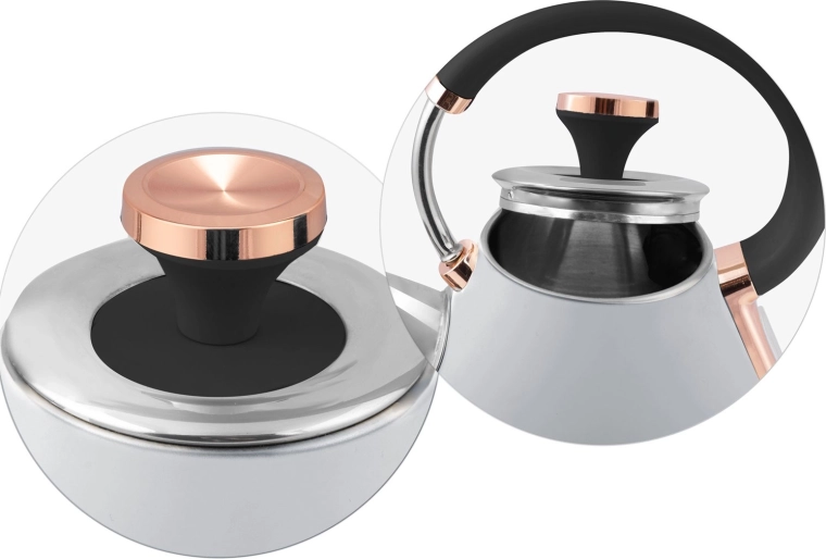 Strapabíró, matt felületű fémkivitel, könnyen levehető fedél és fém vízkőszűrő a tisztább italokért.