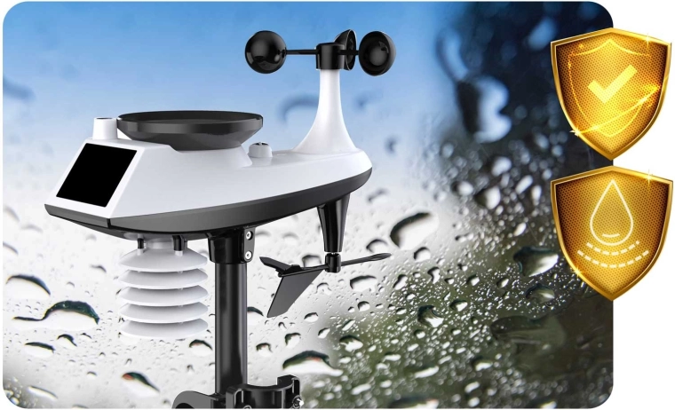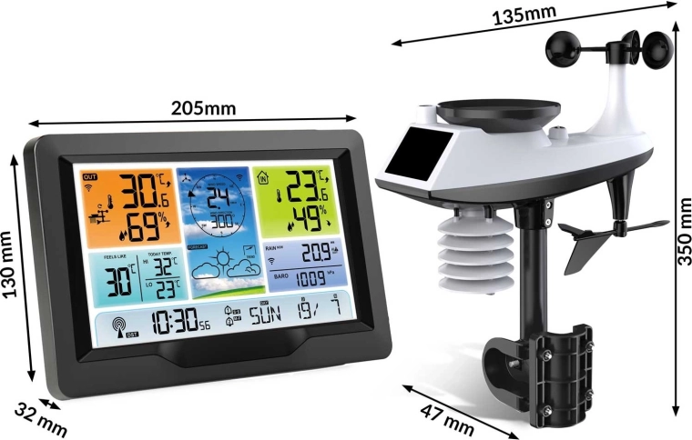 - Komplett időjárás-monitoring: hőmérséklet, páratartalom, nyomás, szél (0–180 km/h), szélirány (0–359°), csapadék (0–9999 mm), hőérzet.