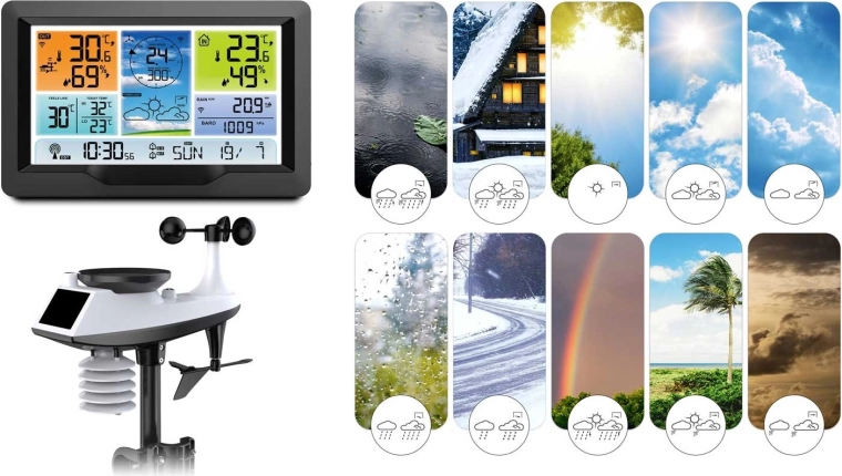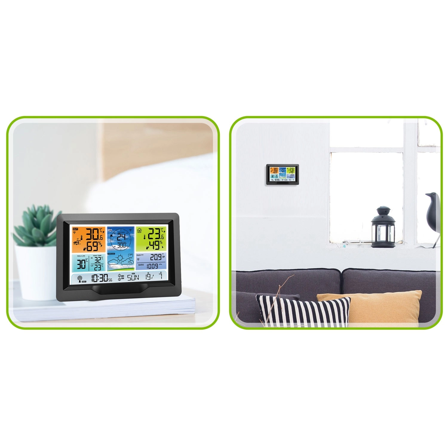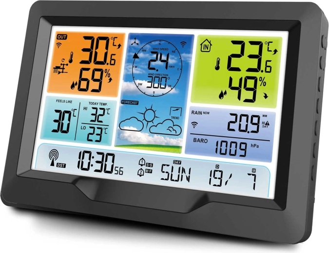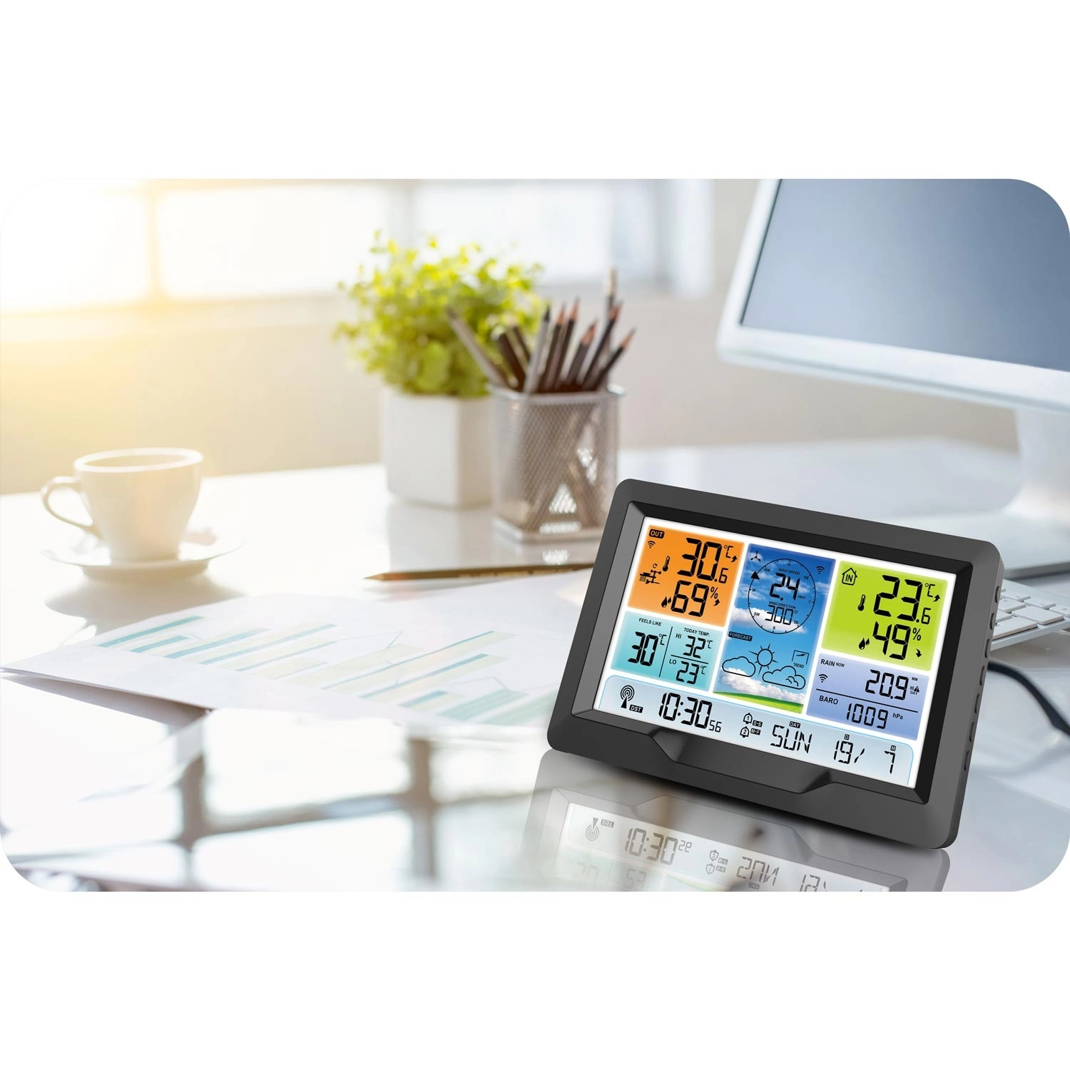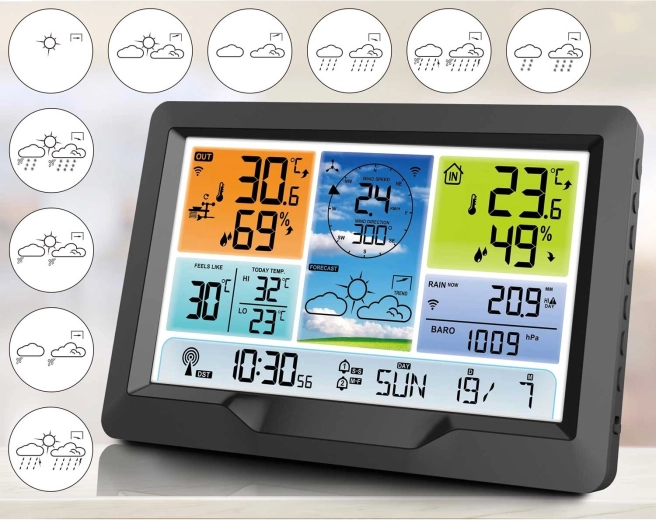 Modern vezeték nélküli meteorológiai állomás színes LCD-vel, DCF77 időszinkronizációval és nagy teljesítményű kültéri multiszenzorral, amely 12 órás előrejelzést, hőmérséklet, páratartalom, légnyomás, szél és csapadék mérését biztosítja. Kínál hőmérséklet-riasztásokat, MIN/MAX memóriát, hőérzet kijelzőt, naptárt, ébresztőt szundival és háromszintű háttérvilágítást. A vezeték nélküli szenzor hatótávolsága akár 100 m, a napelemes táplálás lehetősége pedig megkönnyíti a mindennapi időjárás-áttekintést.