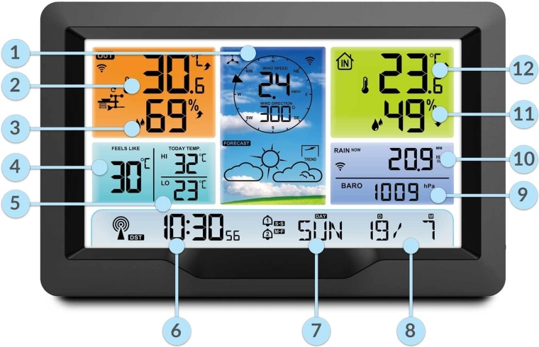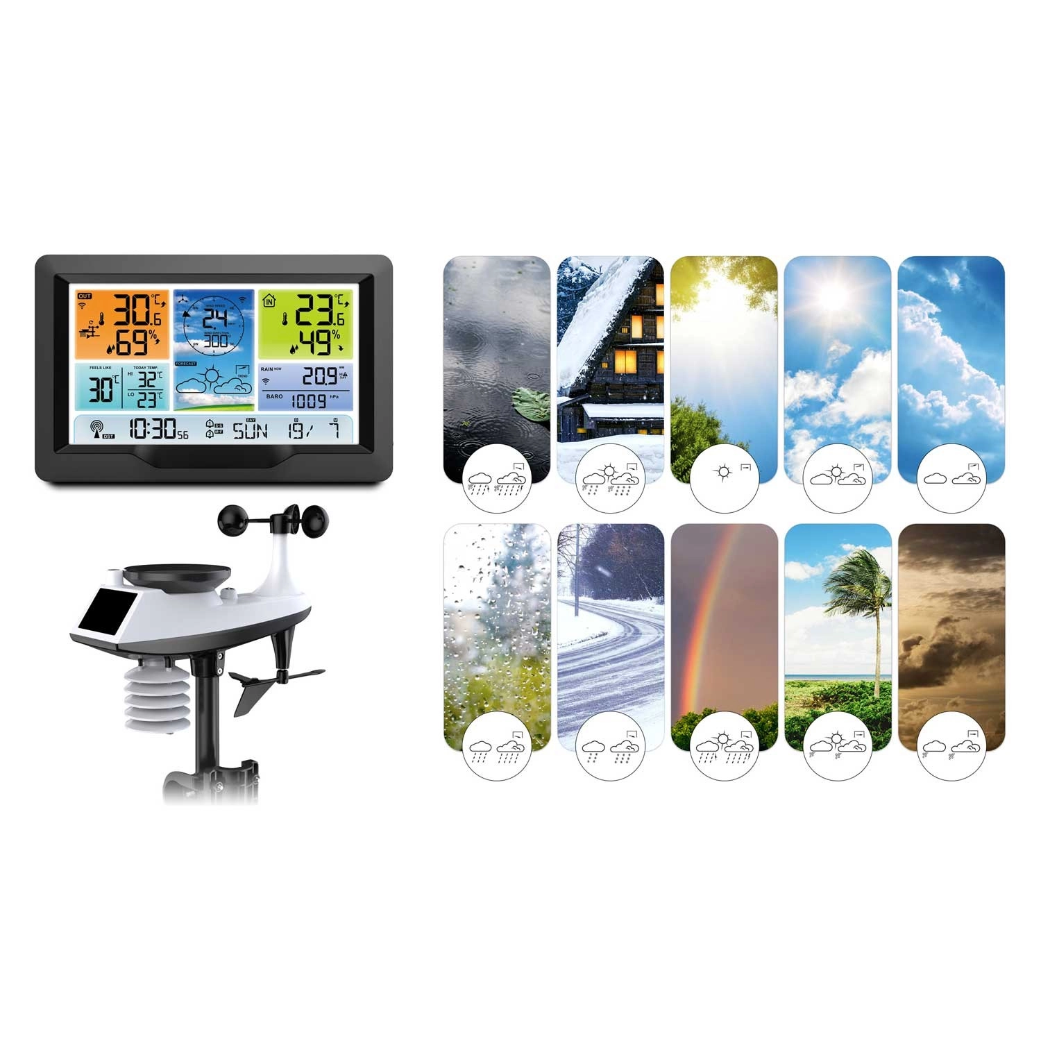 Ez az átfogó otthoni meteorológiai állomás pontos és könnyen olvasható adatokat biztosít beltérre és kültérre egyaránt. Kövesse nyomon a külső és belső hőmérsékletet és páratartalmat, a barometrikus nyomást 12 órás előzményekkel, a szélsebességet és -irányt, valamint a csapadékösszeget. Az integrált 12 órás előrejelzés és a trendjelzések segítenek a napi tervezésben.