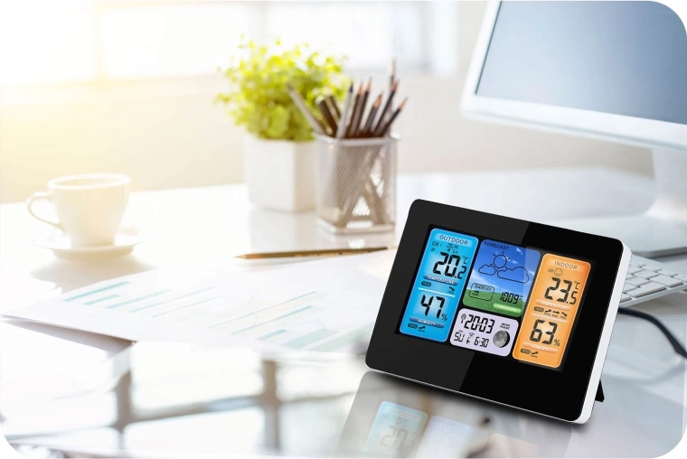 Tartsa ideális szinten a klímát otthon és a szabadban az integrált higrométernek és az áttekinthető többszínű LCD-nek köszönhetően. Az állomás folyamatosan elemzi a hőmérsékletet, a páratartalmat és a nyomást, hogy gyors és érthető időjárás-előrejelzést adjon a következő 12 órára trendikonokkal együtt. A praktikus funkciók, mint a komfortszint, a Hold fázisai, a 12/24 órás időformátum, a 2099-ig terjedő naptár és a szundi funkciós ébresztő sokoldalú segítőt csinálnak belőle a mindennapokra.