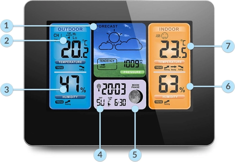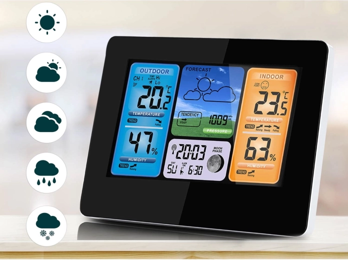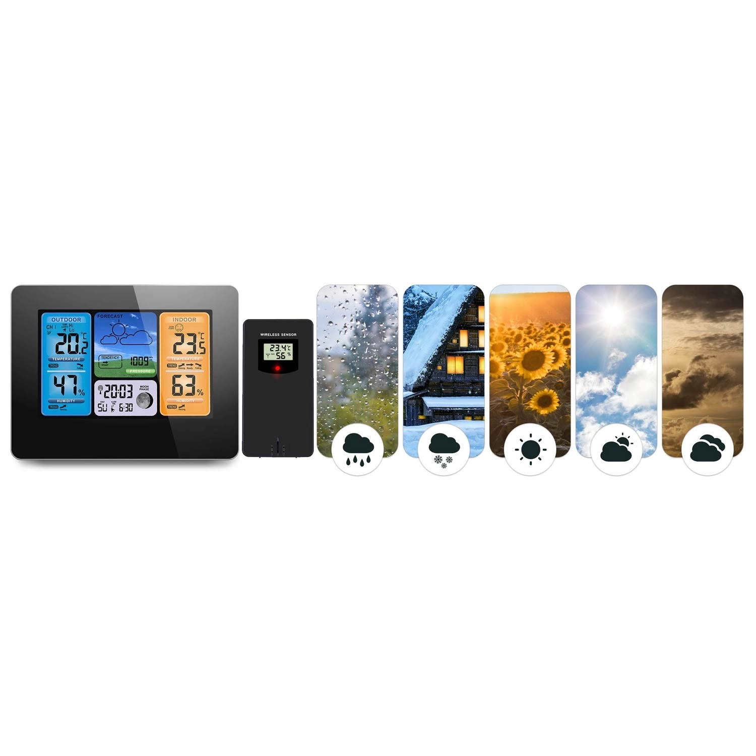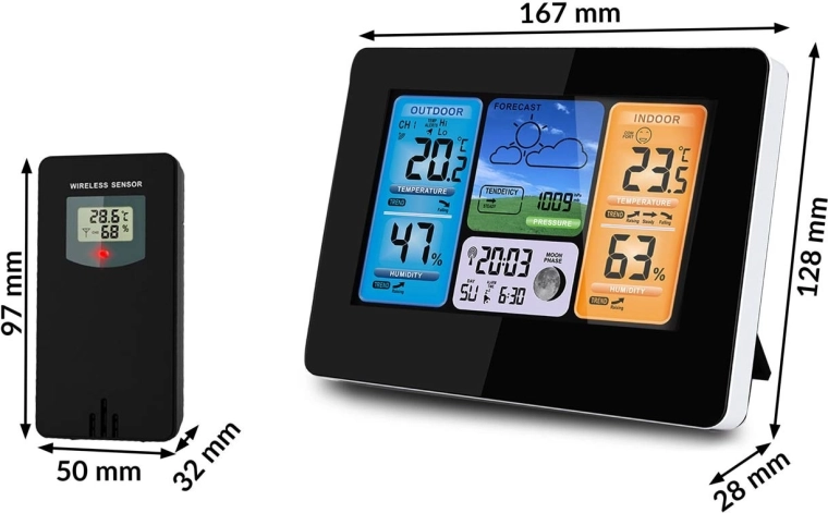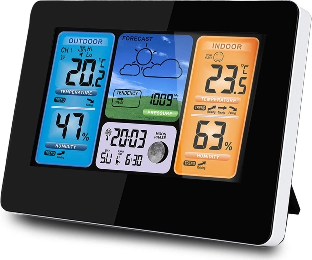 Modern vezeték nélküli meteorológiai állomás színes LCD-vel, amely pontos 12 órás előrejelzést nyújt, figyeli a benti és kültéri hőmérsékletet és páratartalmat, megjeleníti a barometrikus nyomást, a Hold fázisait, valamint a pontos időt és naptárt. Kínál fagy/hőség riasztást, ébresztőt szundi funkcióval és négyszintű háttérvilágítást az értékek könnyű olvasásához. A vezeték nélküli érzékelő akár 60 m hatótávval és további szenzorok csatlakoztatásának lehetőségével megbízható mérést biztosít otthonában és a kertben is.