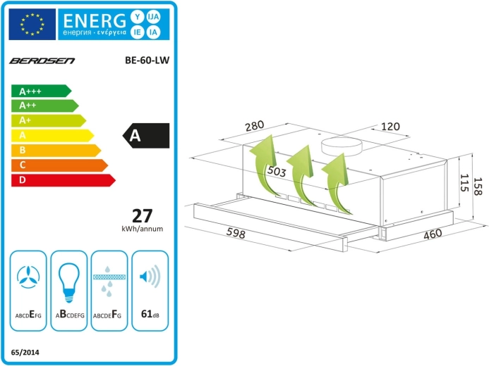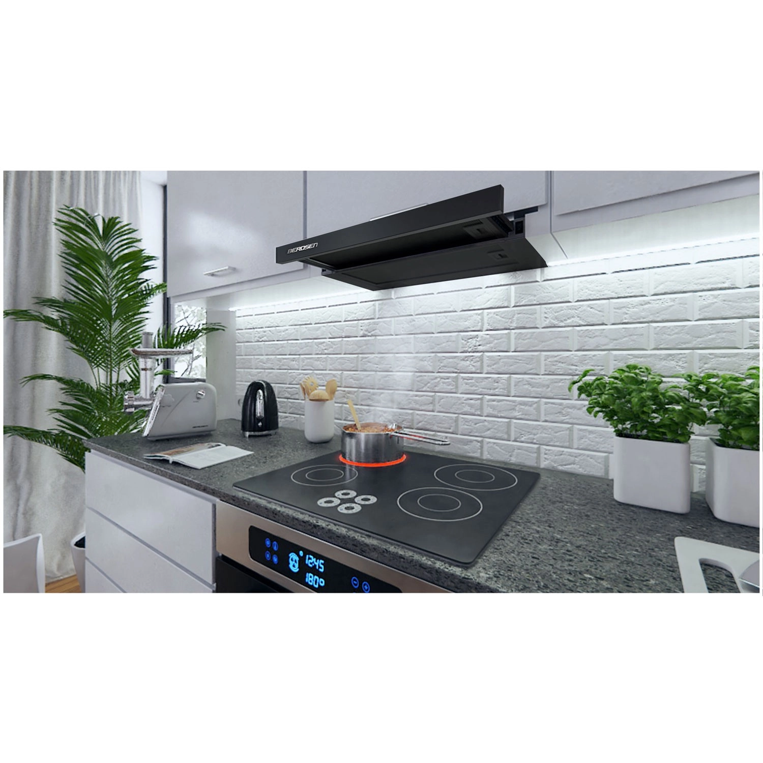 Kompakt, teleszkópos beépíthető páraelszívó 60 cm szélességgel, amely magas szívóteljesítményt, takarékos LED világítást és 2 üzemmódot – elszívást és recirkulációt – kínál. A kihúzható panelnek köszönhetően nagyobb a gőzök felfogási felülete, így főzés közben tisztább lesz a levegő, mindez elegáns fekete kivitelben és egyszerű mechanikus vezérléssel.