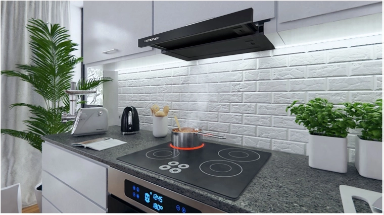 A teleszkópos kialakítás pontosan ott növeli a gőzök felfogási felületét, ahol szükség van rá. Elég kihúzni a panelt, és a páraelszívó automatikusan aktiválódik.