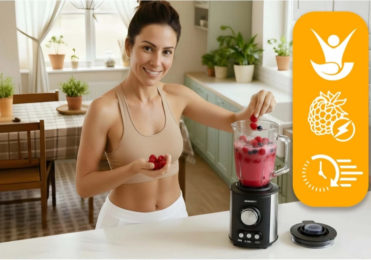 Az intuitív vezérlés háttérvilágítású gombokkal és forgókapcsolóval lehetővé teszi az ideális üzemmód gyors kiválasztását: Smoothie a krémes italokhoz, Ice Crush a jéghez és Pulse a precíz aprításhoz. A csúszásgátló lábak stabilitást biztosítanak, a biztonsági reteszek pedig védelmet nyújtanak a helytelen összeszerelés és a túlmelegedés ellen.