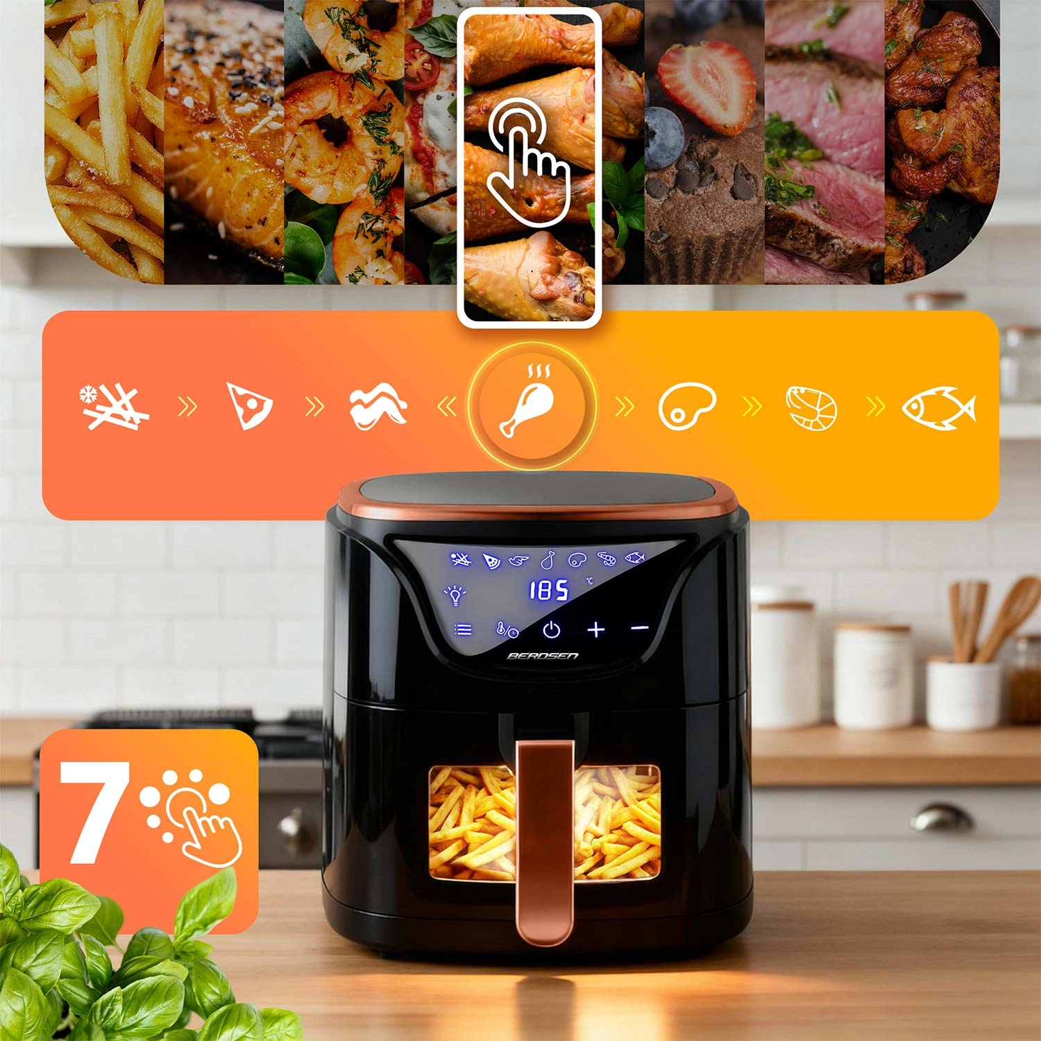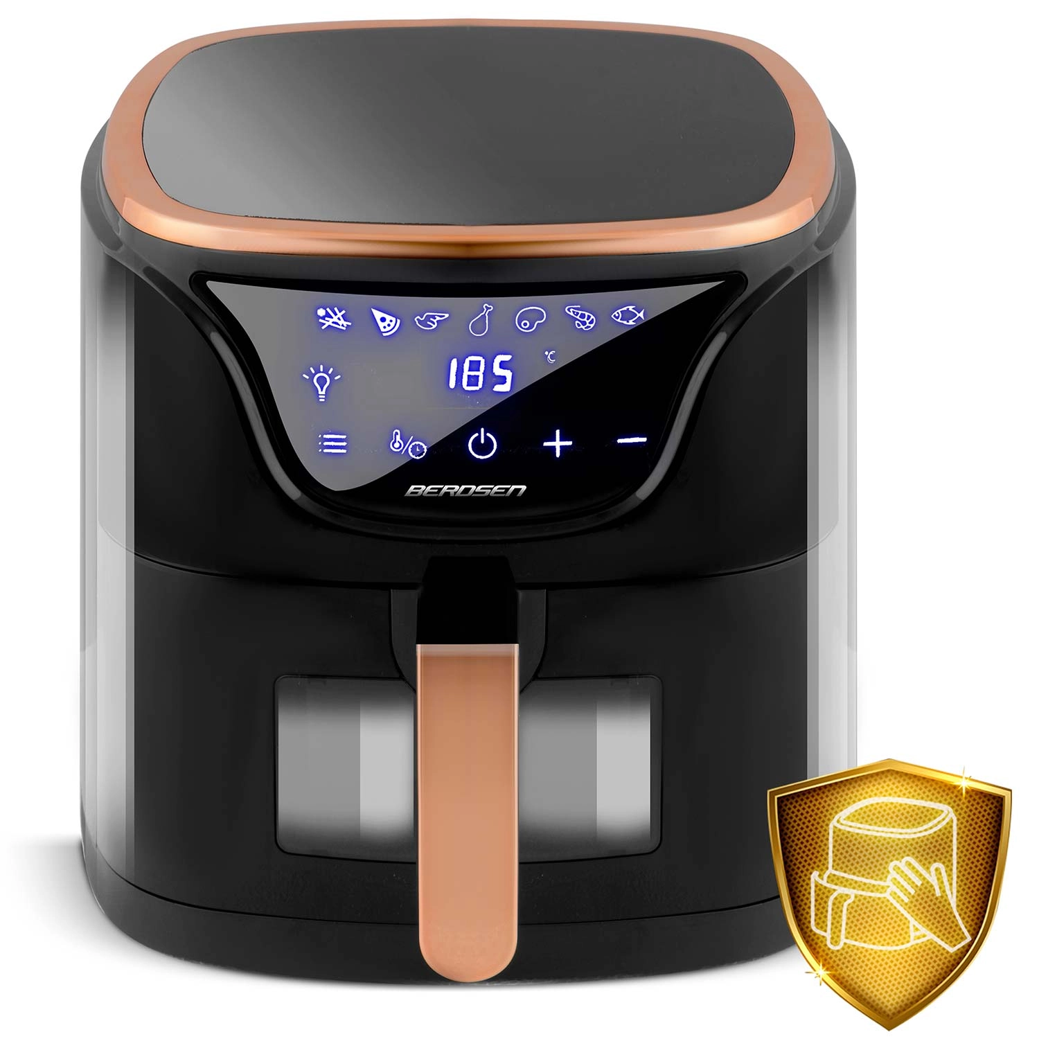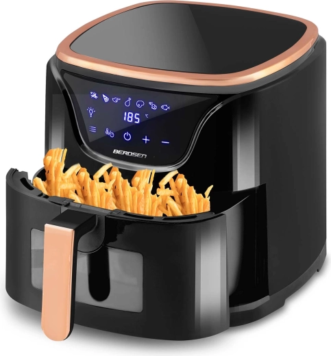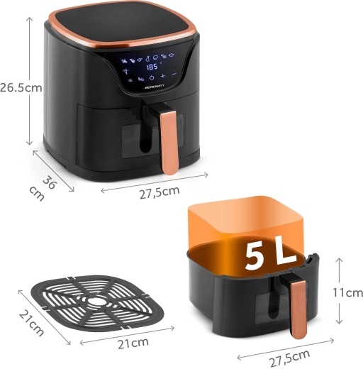 A BERDSEN BD‑1652 ötvözi az 1500 W teljesítményt, az elegáns fekete dizájnt réz/rose gold részletekkel és az okos funkciókat a mindennapi, felesleges olaj nélküli főzéshez. Az intuitív érintőpanel áttekinthető ikonokkal, valamint a LED megvilágítású betekintő ablak lehetővé teszi, hogy az ételek elkészítését folyamatosan ellenőrizze – a sütés megszakítása nélkül. A 5 l-es, tágas kosár kényelmesen elkészít egy családi ebédet vagy egy nagy adag hasábot a barátoknak.