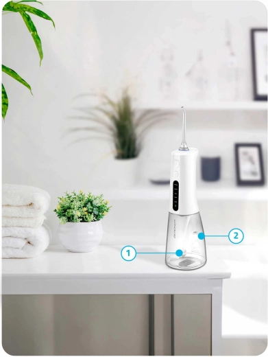 Válasszon az 5 üzemmód közül – Strong, Normal, Soft, Child és Pulse – és igazítsa a víznyomást az igényeihez. A nagy, 300 ml-es tartály megszakítás nélküli öblítést tesz lehetővé, míg a 360°-ban forgatható fúvóka megkönnyíti a hozzáférést a fogak minden felszínéhez és az ínyszél mentén. A ≤72 dB halk működés, a 2 perces időzítő és az IPX7 vízálló kialakítás megbízható társsá teszik otthon és útközben egyaránt.