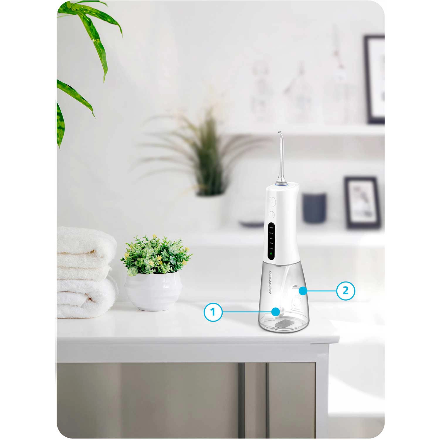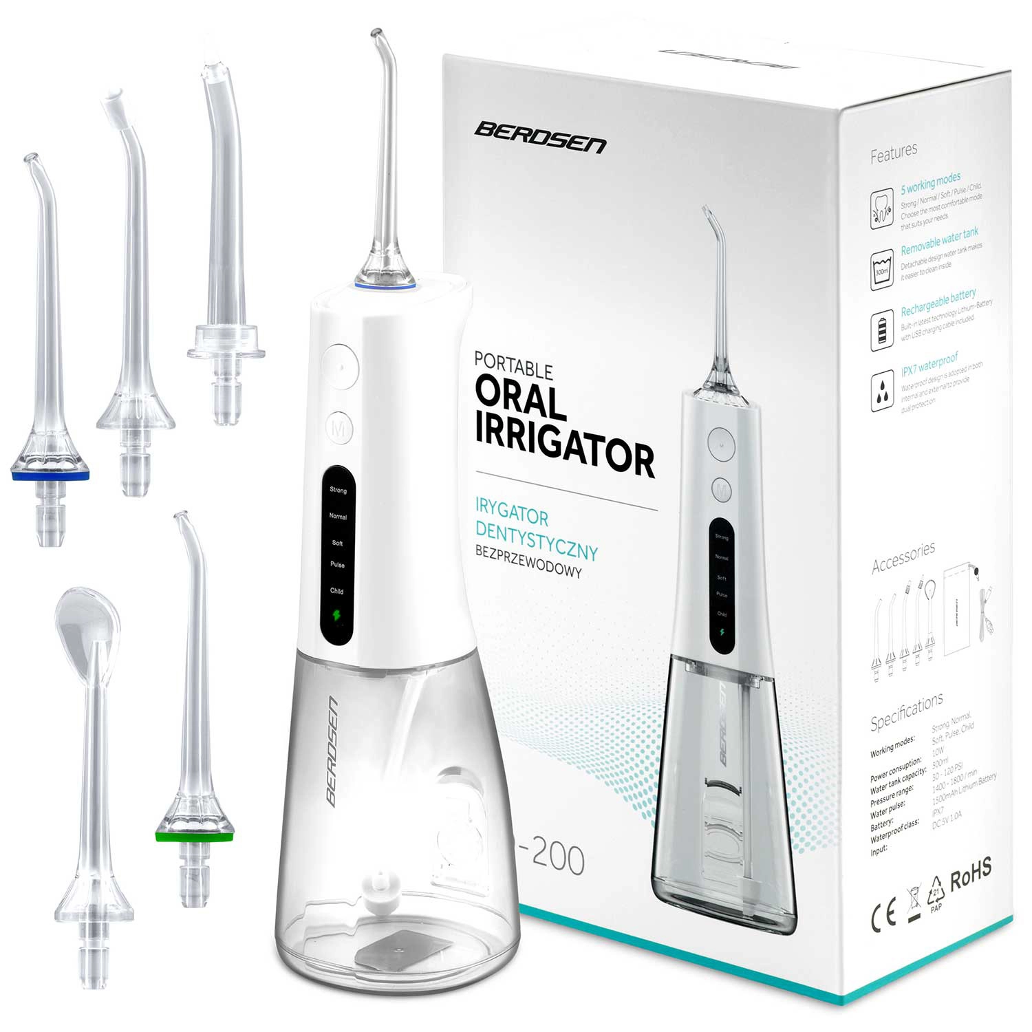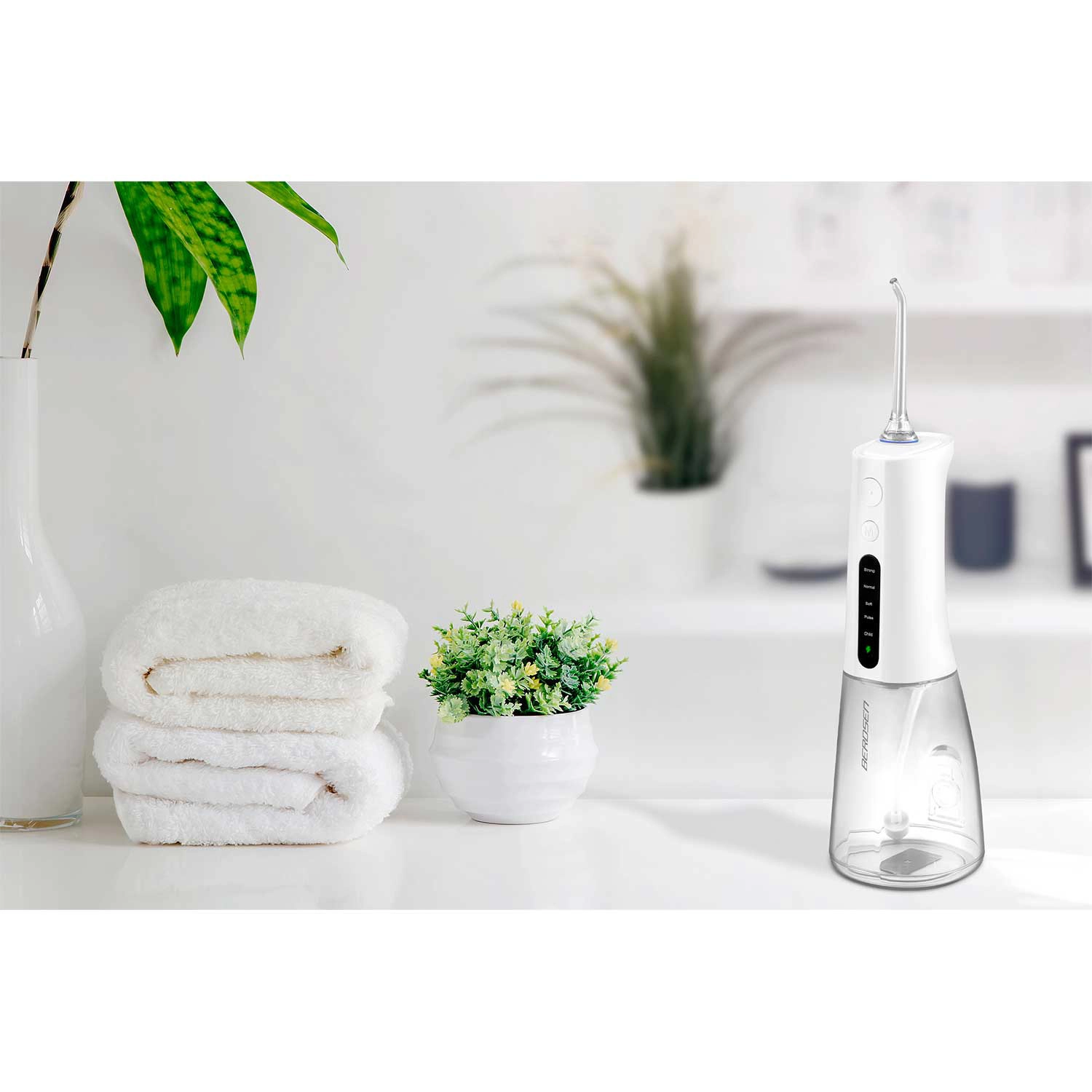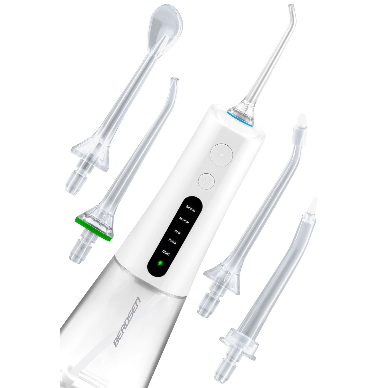 A vezeték nélküli BERDSEN szájzuhany hatékonyan távolítja el az ételmaradékokat, a lepedéket és a baktériumokat onnan is, ahova a hagyományos fogkefe nem ér el. Ideális fogközök, koronák, hidak, implantátumok és fogszabályzók tisztításához. A karcsú vízsugár, percenként akár 1800 impulzussal precíz higiéniát és egész napos friss érzetet biztosít.