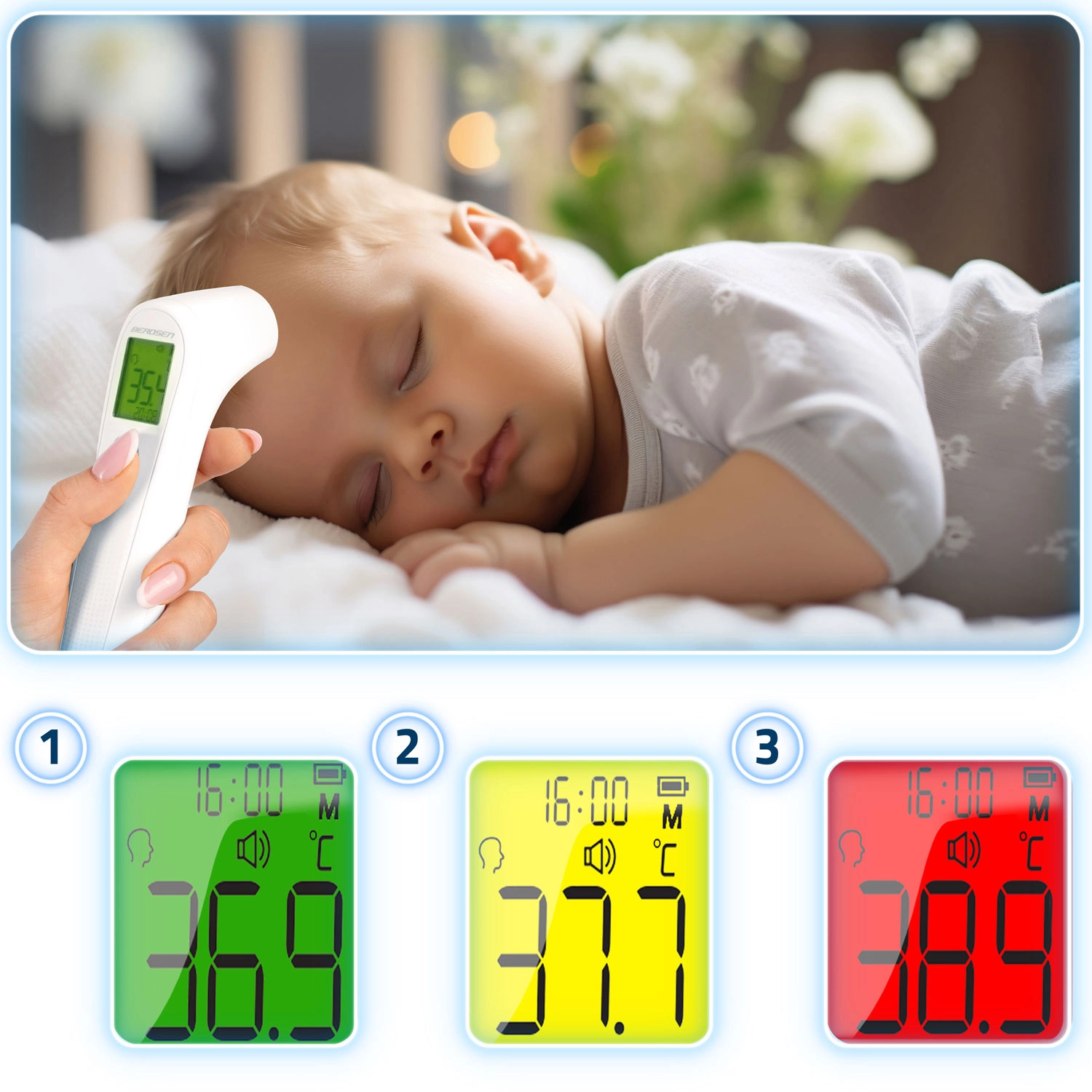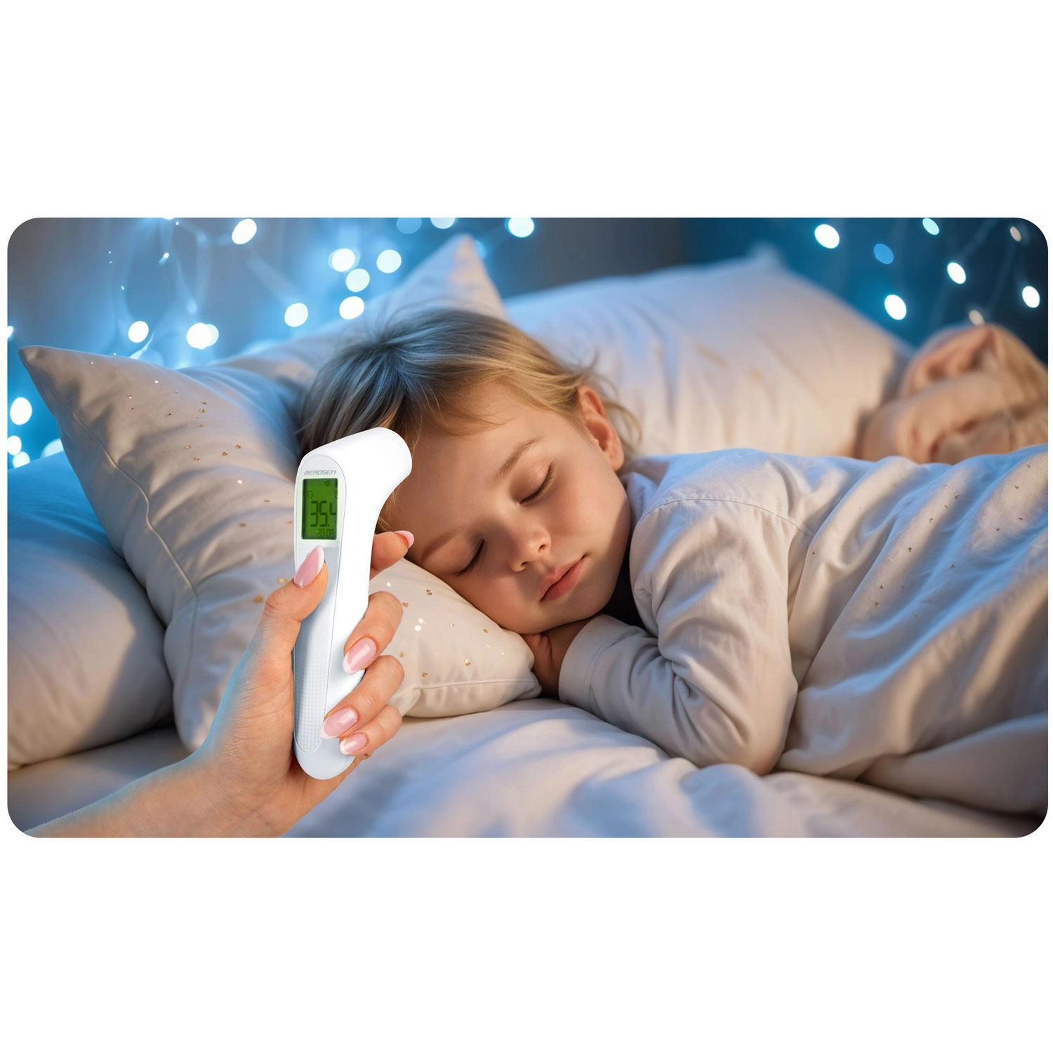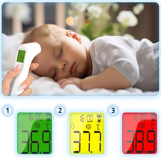 Kényelmes mérés még a gyermek alvása közben is. Gyors és higiénikus hőmérséklet-ellenőrzés bőrkontaktus nélkül, ideális otthoni használatra és gyors szűrésre.