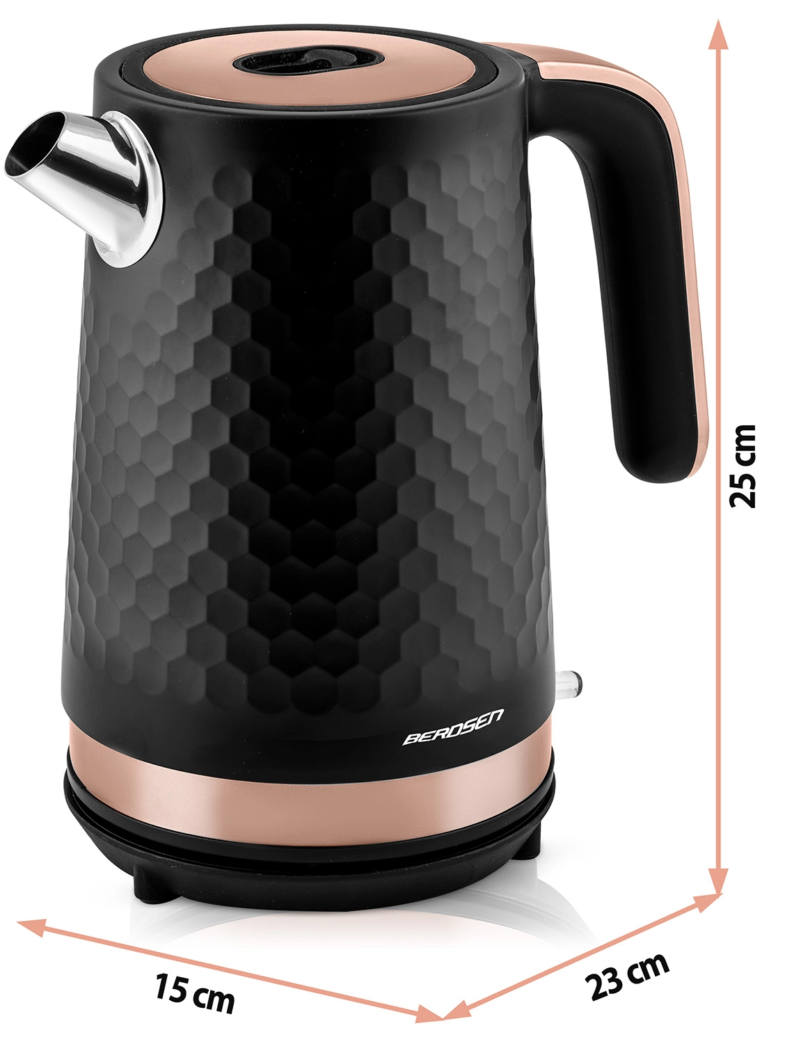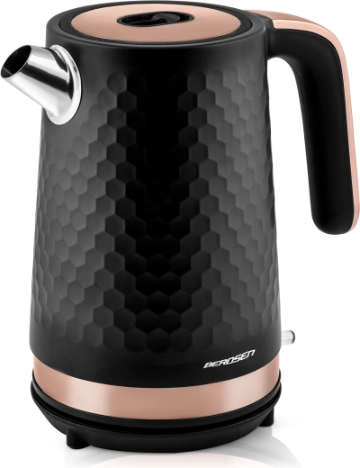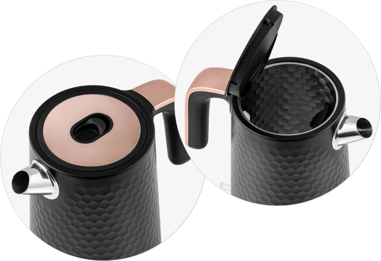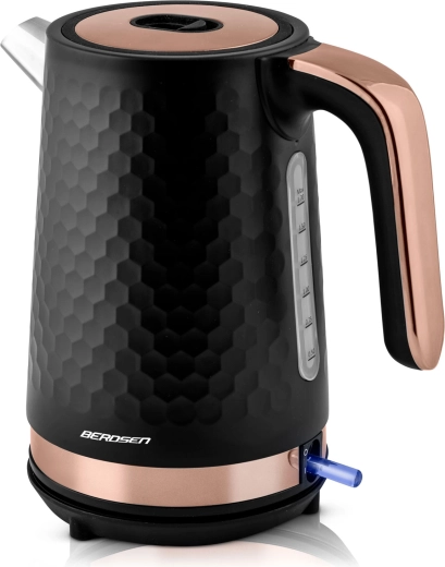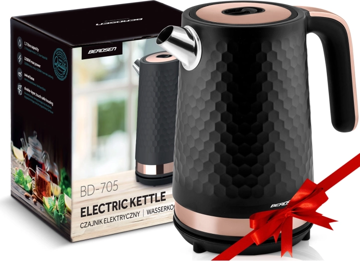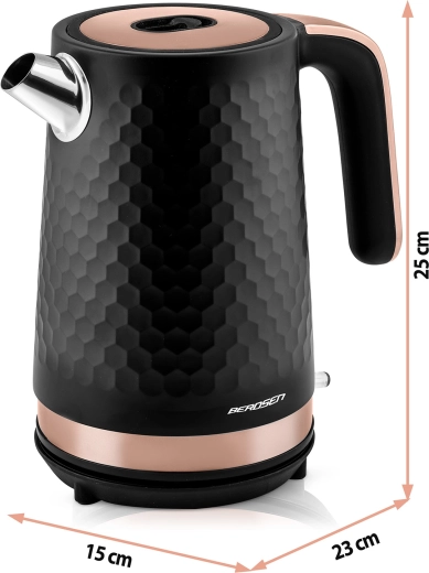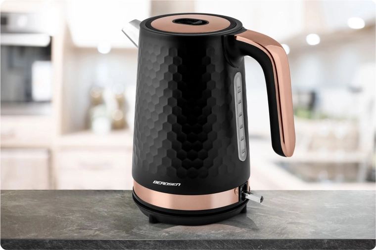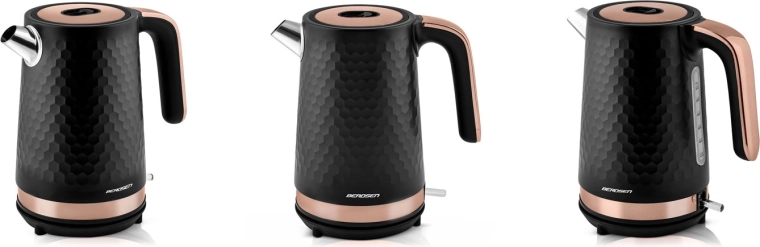 Az elegáns Berdsen vízforraló fekete–réz kialakításban a kényelmes, mindennapi használatra készült. A matt felületű fémtest tartós és könnyen karbantartható, míg az ergonomikus fogantyú érintésre hideg marad. Az 1850–2200 W teljesítménynek köszönhetően a vizet gyorsan és energiatakarékosan forralja fel.