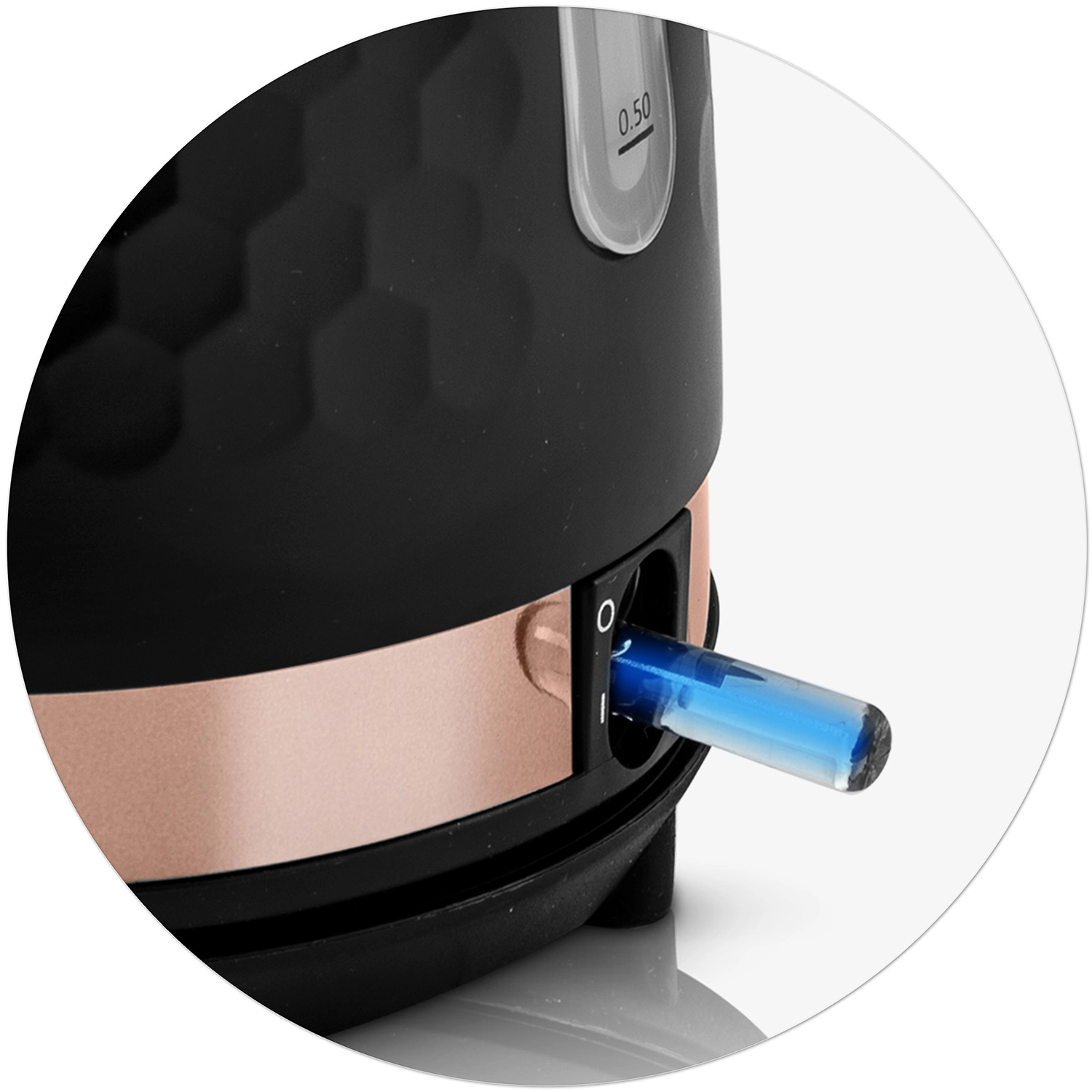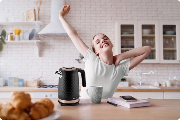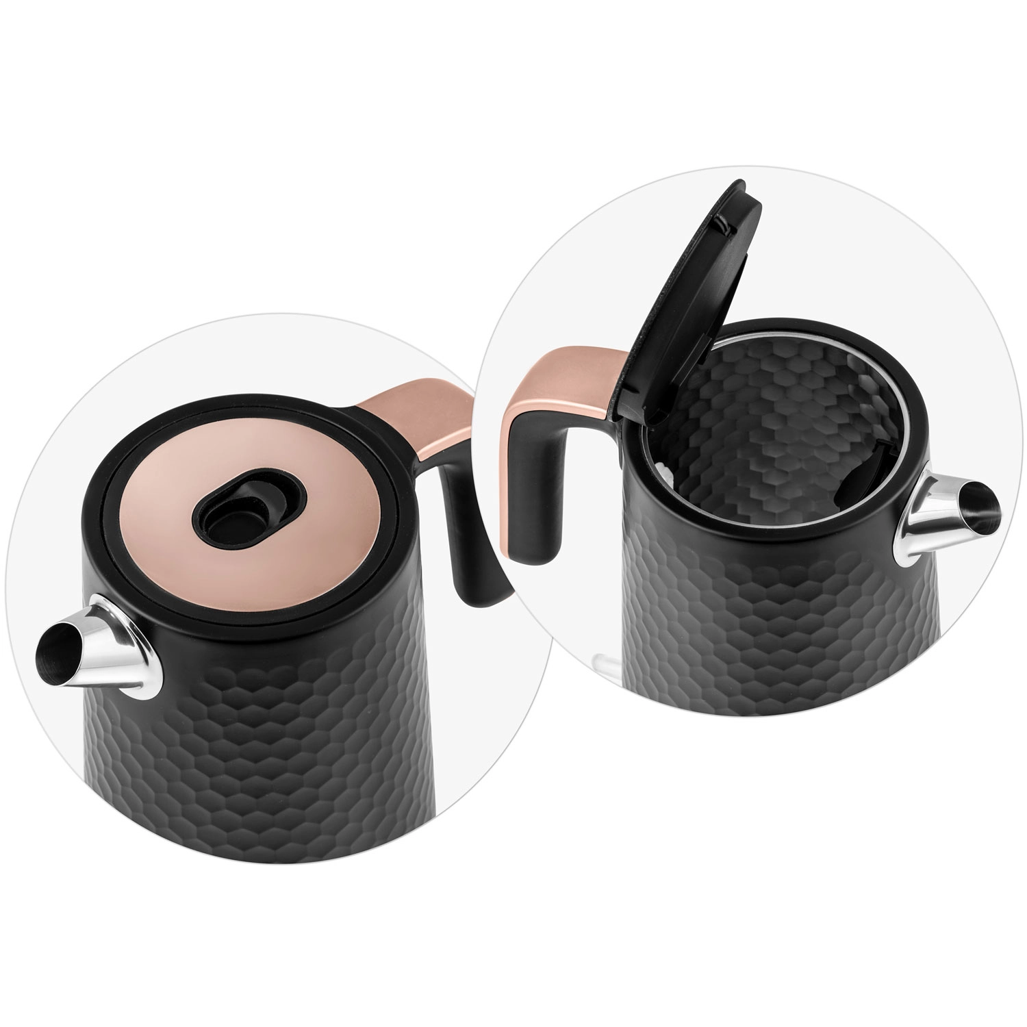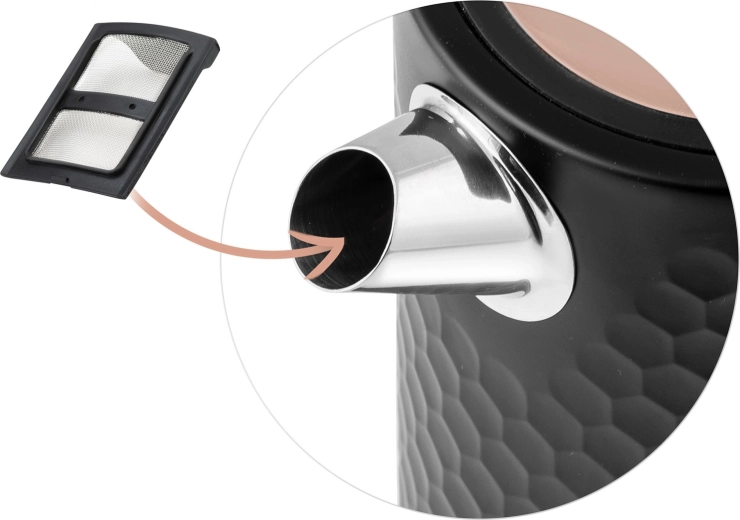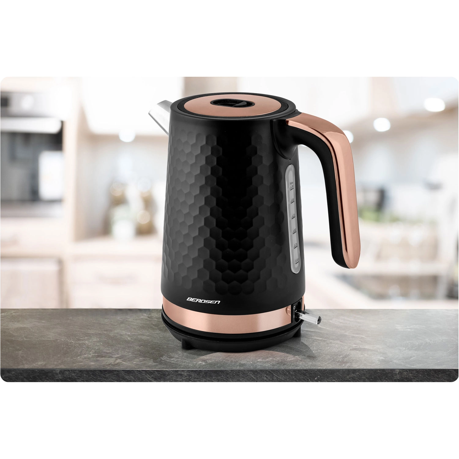 Az elegáns Berdsen vízforraló fekete–réz kialakításban a kényelmes, mindennapi használatra készült. A matt felületű fémtest tartós és könnyen karbantartható, míg az ergonomikus fogantyú érintésre hideg marad. Az 1850–2200 W teljesítménynek köszönhetően a vizet gyorsan és energiatakarékosan forralja fel.