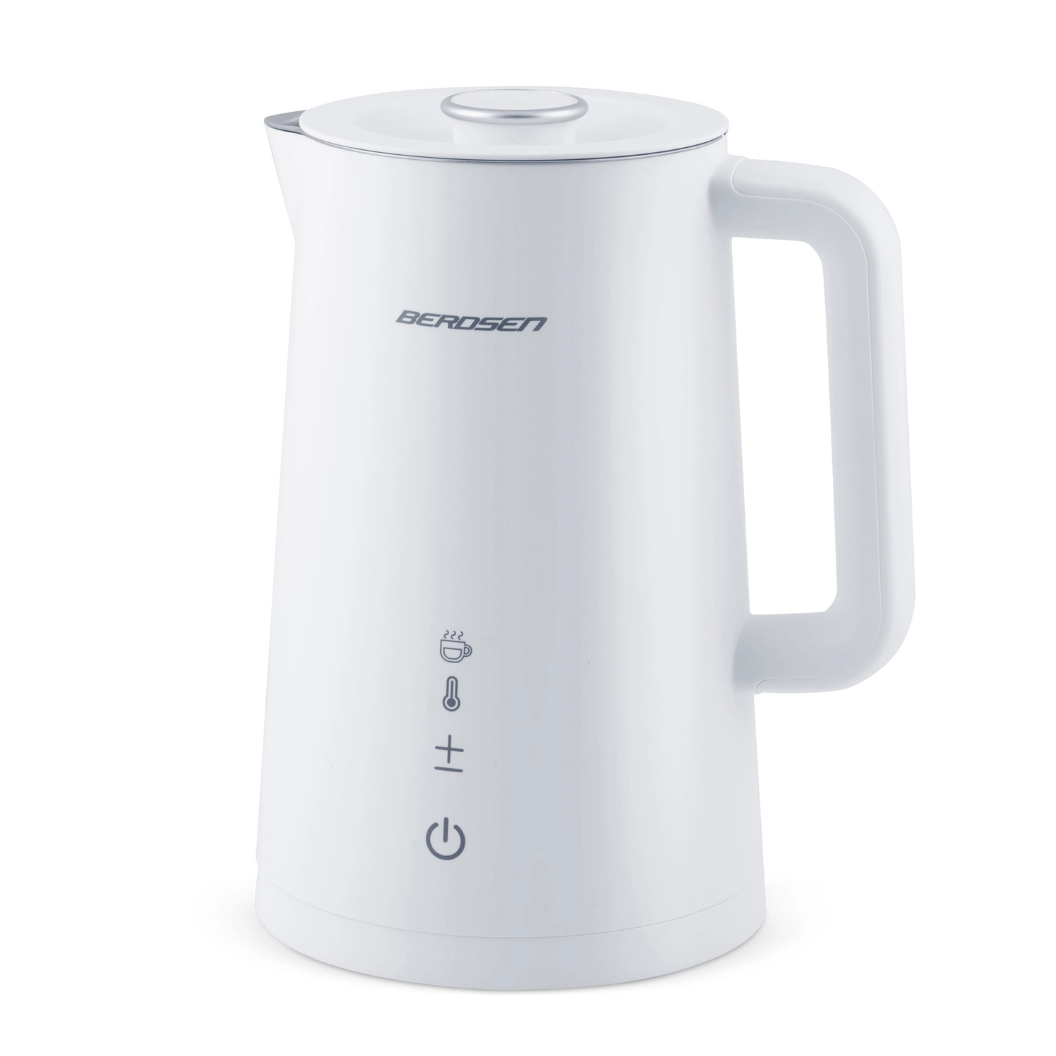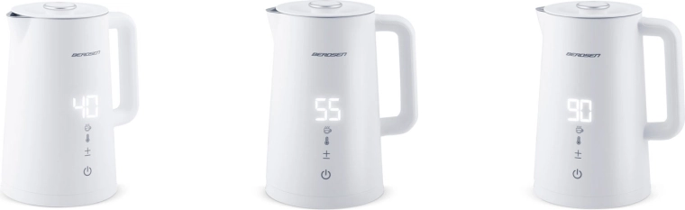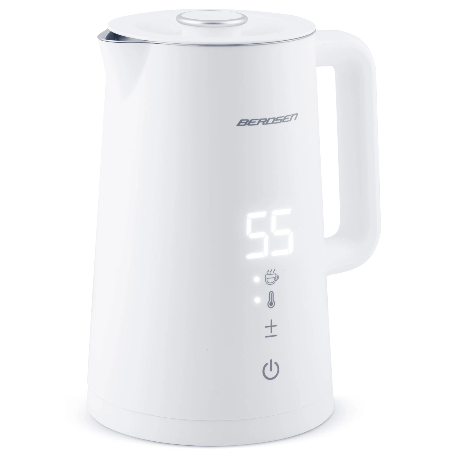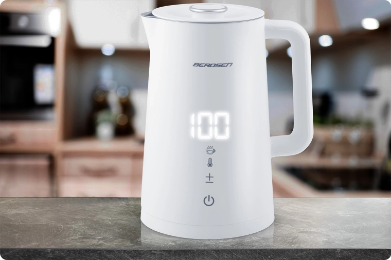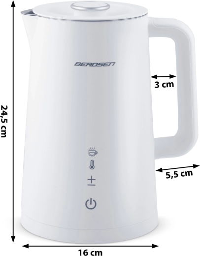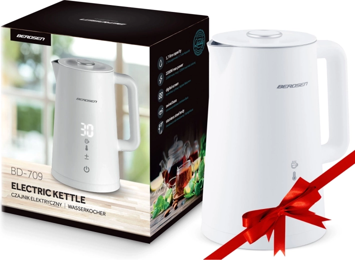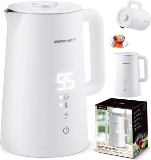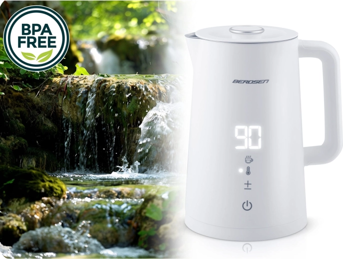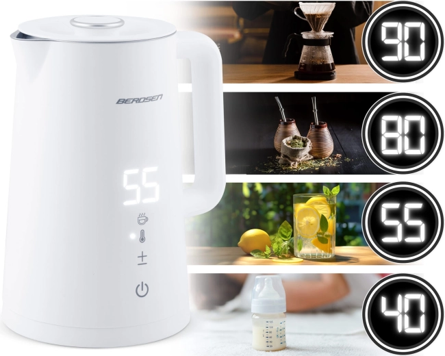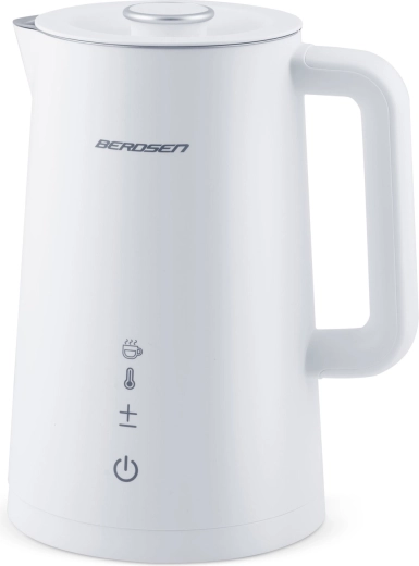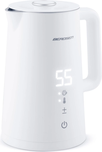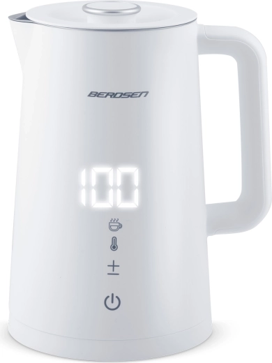 Stílusos BERDSEN elektromos vízforraló 1,7 l űrtartalommal, 5 fokozatban állítható hőmérséklettel, érintőpanellel és LED kijelzővel, akár 2 órás melegen tartás funkcióval, valamint biztonságos, dupla falú CoolTouch kivitelben. A belső SUS 304 rozsdamentes acél tiszta vízízről és hosszú élettartamról gondoskodik.