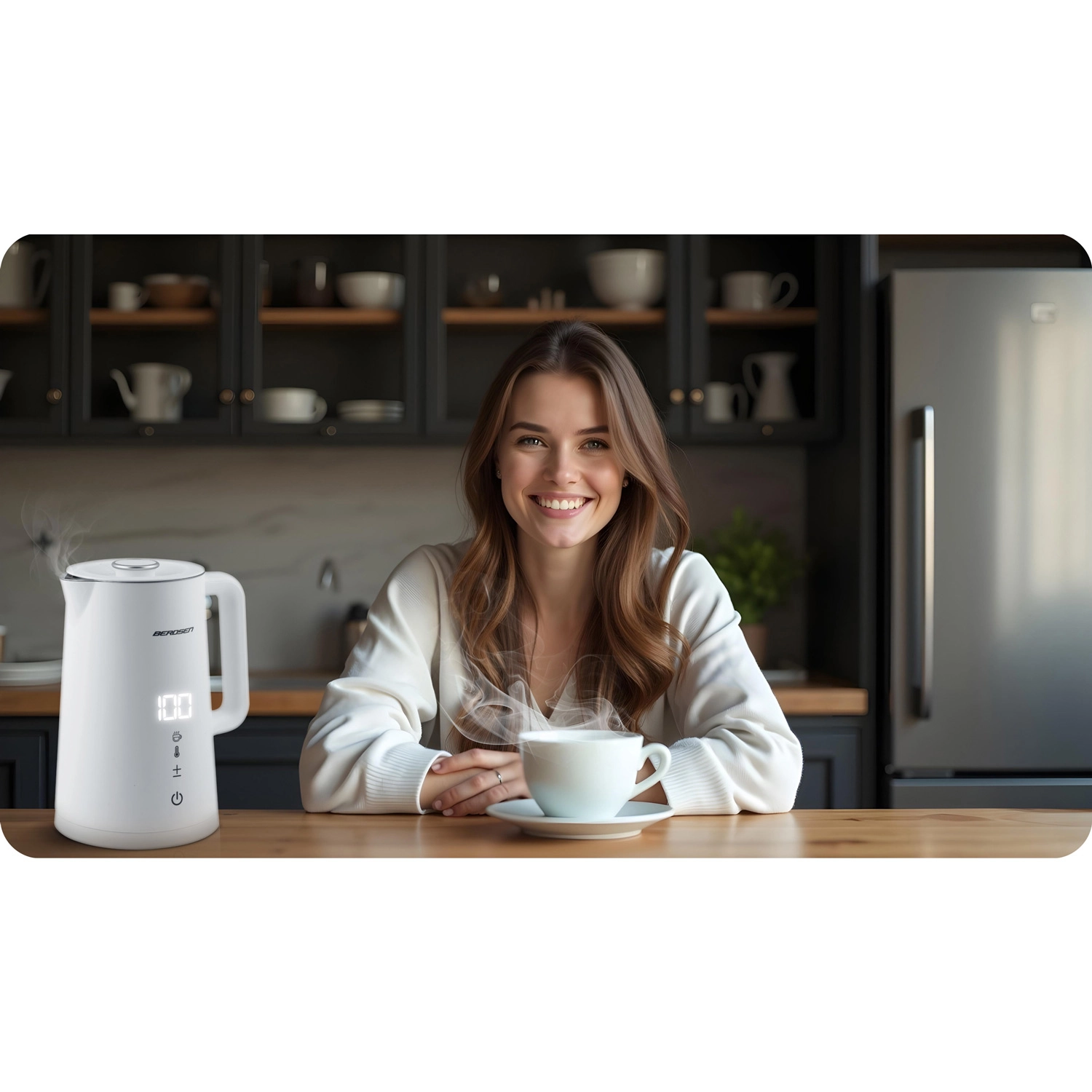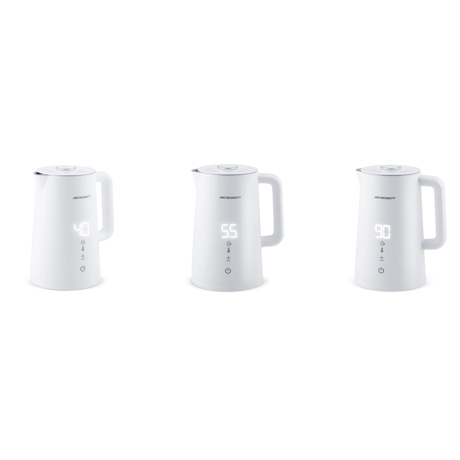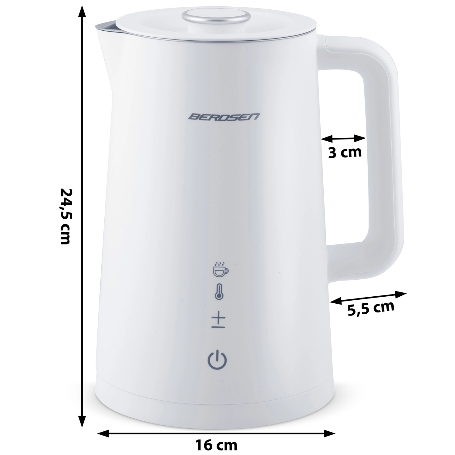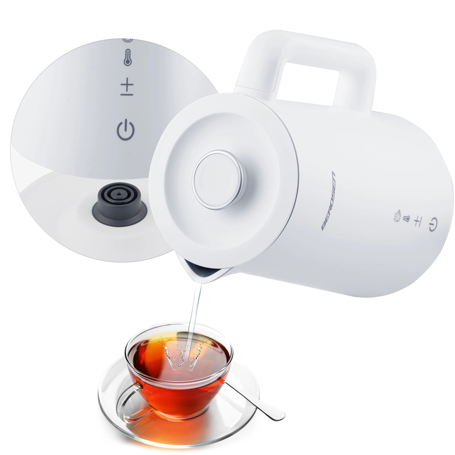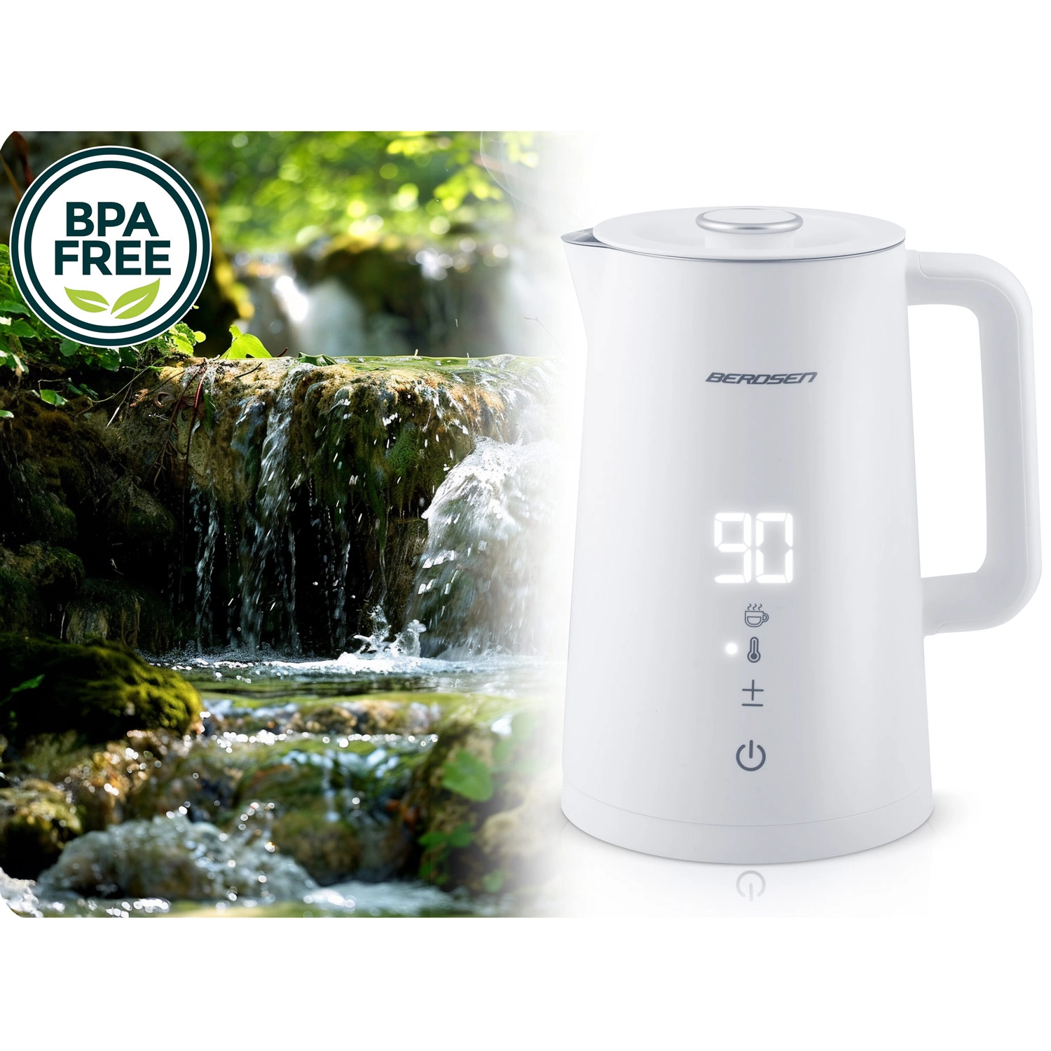Stílusos BERDSEN elektromos vízforraló 1,7 l űrtartalommal, 5 fokozatban állítható hőmérséklettel, érintőpanellel és LED kijelzővel, akár 2 órás melegen tartás funkcióval, valamint biztonságos, dupla falú CoolTouch kivitelben. A belső SUS 304 rozsdamentes acél tiszta vízízről és hosszú élettartamról gondoskodik.