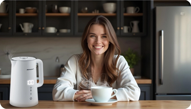 A belső tartály SUS 304 rozsdamentes acélból (BPA-mentes) készül, így egészségre ártalmatlan a vízzel való érintkezés, tiszta ízt és magas tartósságot biztosít. A vízforraló 360°-ban forgatható talppal, csúszásgátló lábakkal és praktikus kábeltárolóval rendelkezik, így bármelyik konyhába illik.