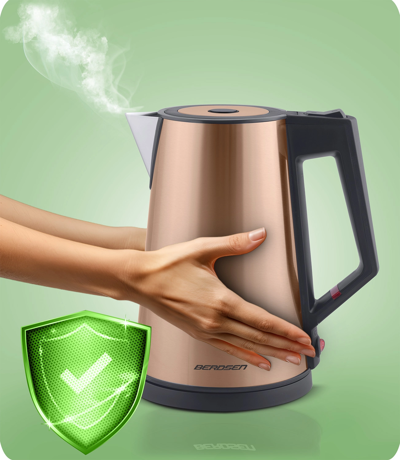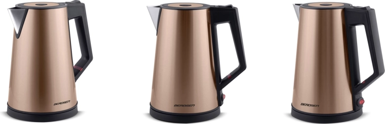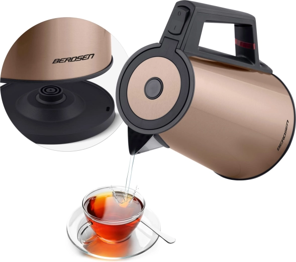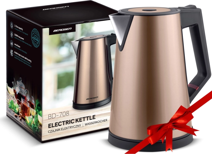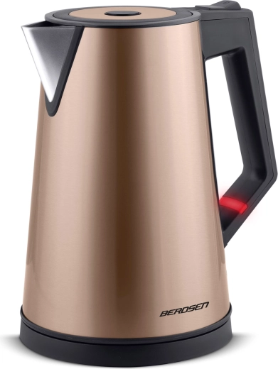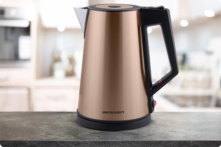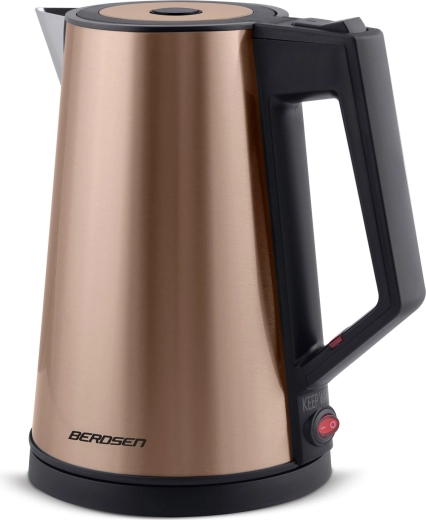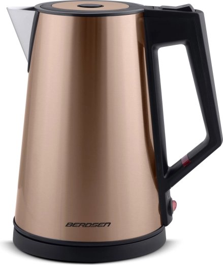 Stílusos BERDSEN elektromos vízforraló 1,7 l űrtartalommal, elegáns rézszínű kivitelben. CoolTouch szigetelt kialakítással, SUS 304 rozsdamentes acél belső térrel és praktikus, akár 2 órás melegen tartás funkcióval. A vezeték nélküli 360 talp, a megvilágított kapcsoló és a túlmelegedés elleni védelem révén ideális választás a mindennapi vízforraláshoz.