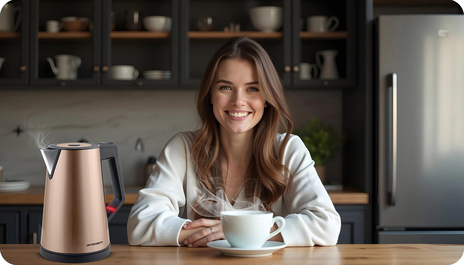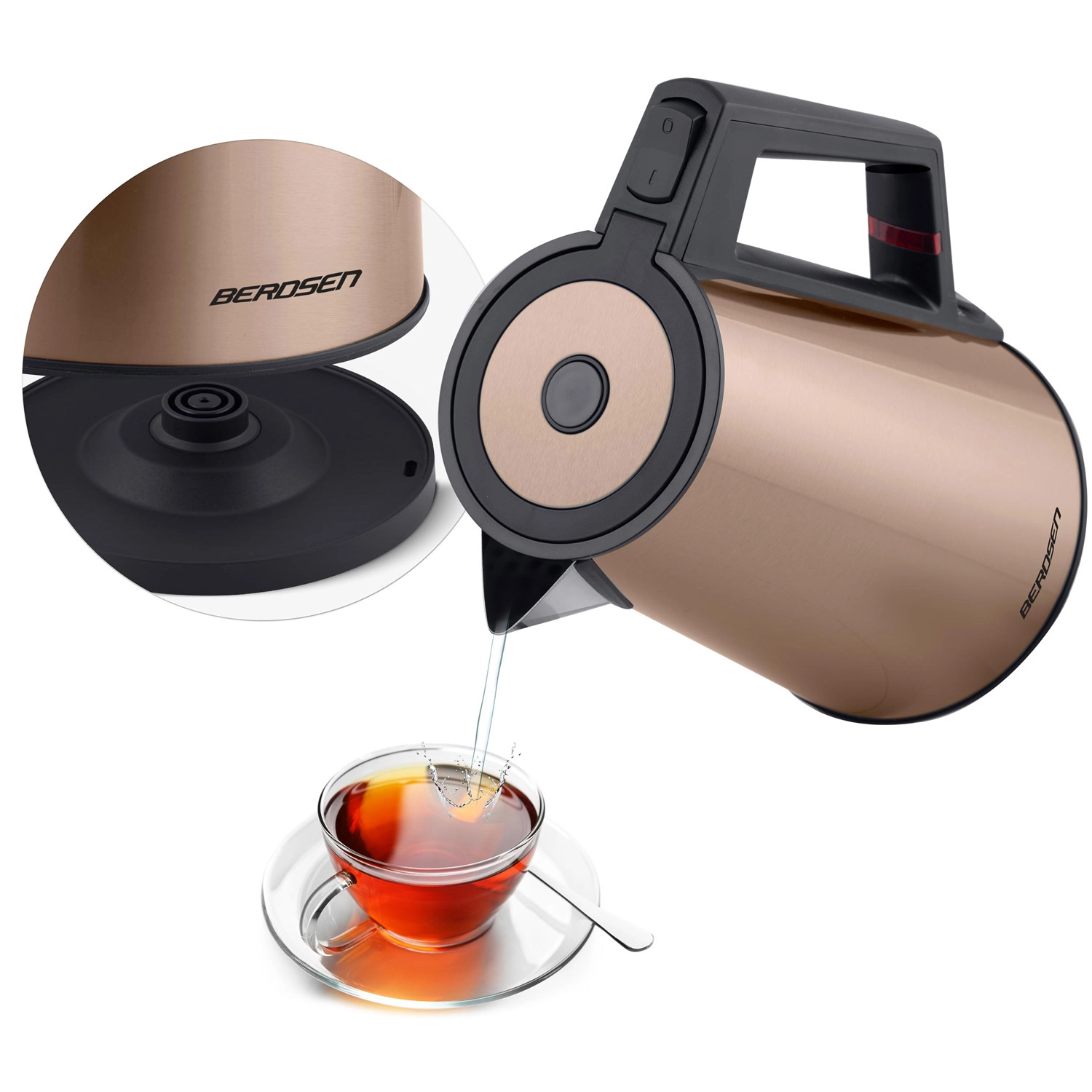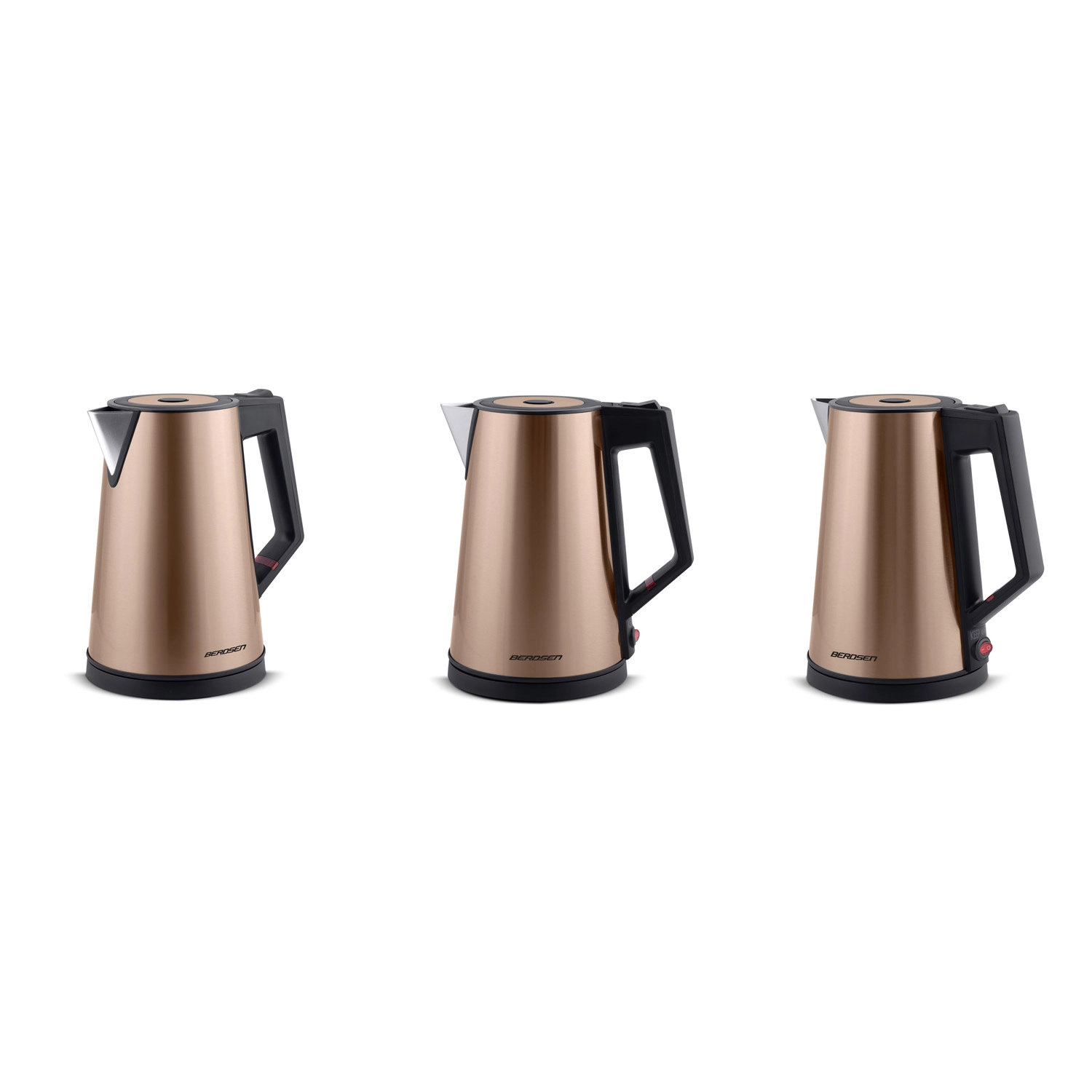 Stílusos BERDSEN elektromos vízforraló 1,7 l űrtartalommal, elegáns rézszínű kivitelben. CoolTouch szigetelt kialakítással, SUS 304 rozsdamentes acél belső térrel és praktikus, akár 2 órás melegen tartás funkcióval. A vezeték nélküli 360 talp, a megvilágított kapcsoló és a túlmelegedés elleni védelem révén ideális választás a mindennapi vízforraláshoz.