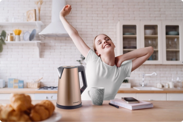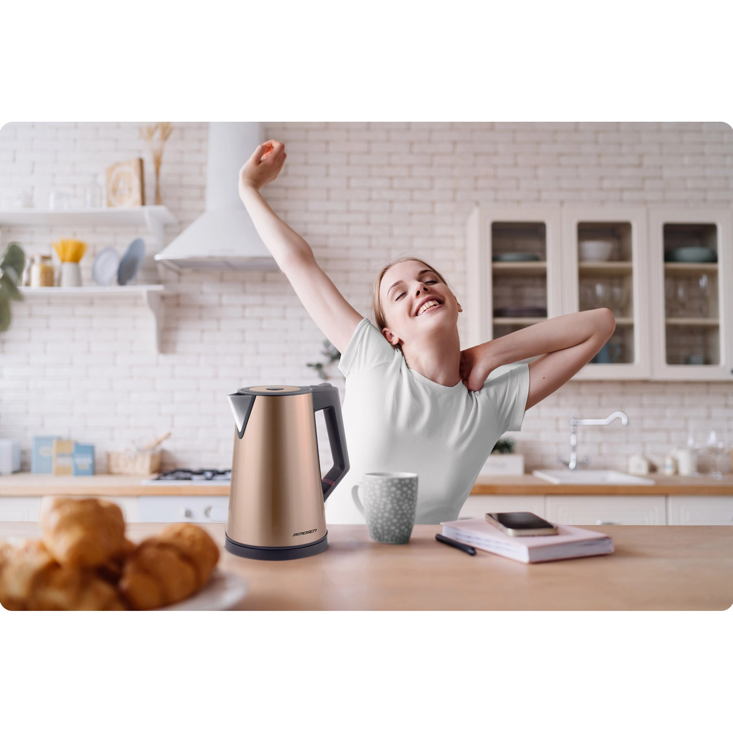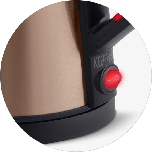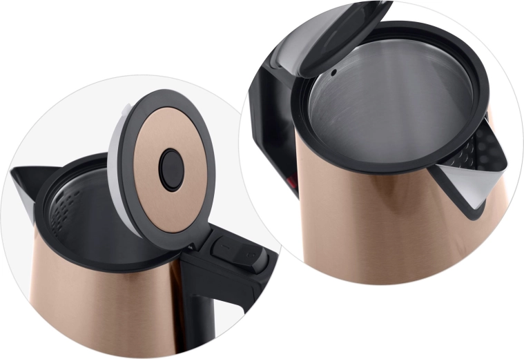 Fedezze fel a design és a funkcionalitás tökéletes egyensúlyát. A duplafalú CoolTouch kialakítás biztosítja, hogy a vízforraló külseje ne melegedjen túl, míg a belső tartályban lévő minőségi SUS 304 rozsdamentes acél garantálja a tiszta vízízét, kellemetlen mellékíz nélkül. A réz-arany szín prémium hatást kelt, és remekül illik a modern konyhákhoz.