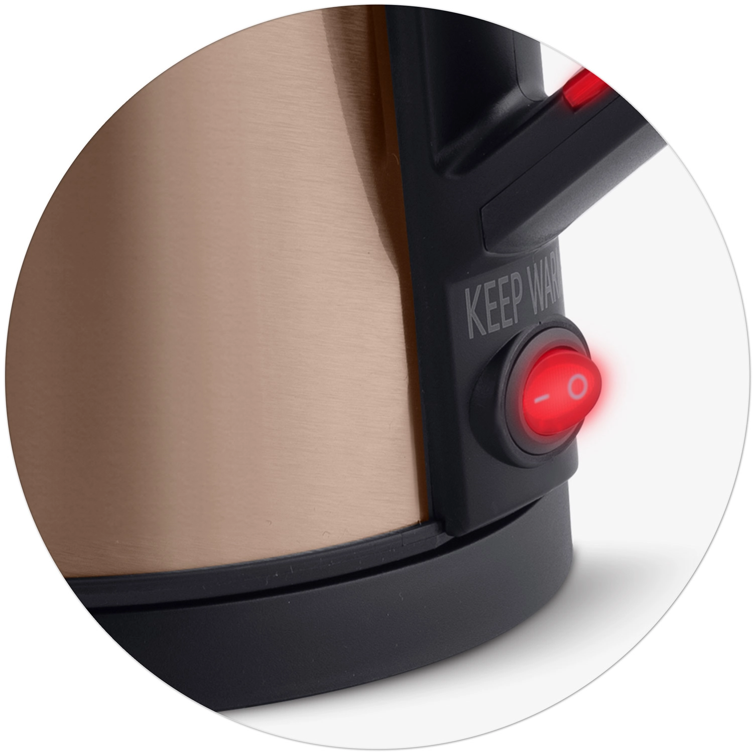 A praktikus KeepWarm funkció a vizet kb. 55 C-on akár 2 óráig tartja – ideális teához, kávéhoz és gyermekitalokhoz. A 360 vezeték nélküli talp csúszásgátló lábakkal és kábeltárolóval megkönnyíti a mindennapi használatot. Természetes a szárazjárat- és túlmelegedés elleni védelem, valamint a megvilágított kapcsoló az egyértelmű működési visszajelzéshez.