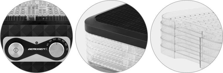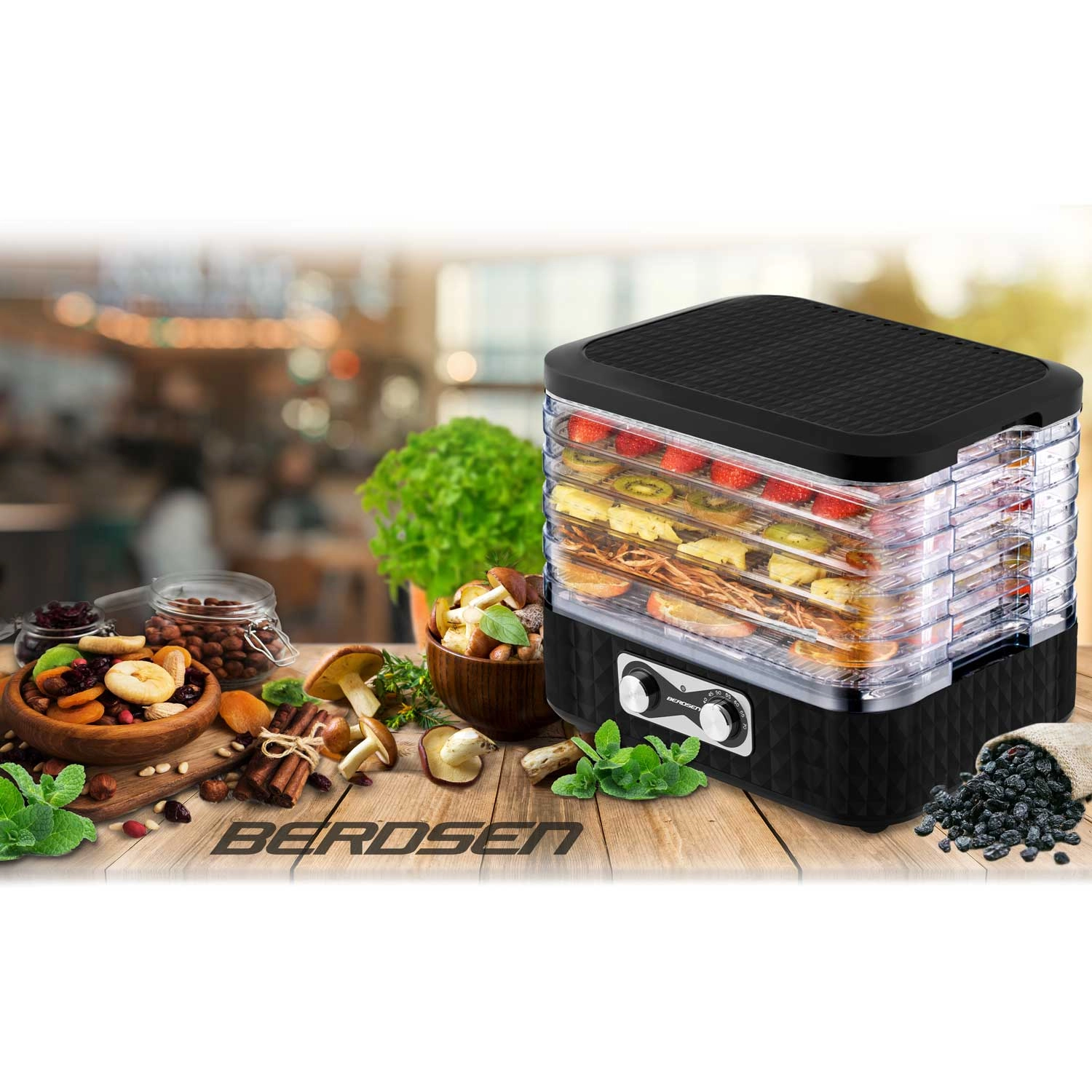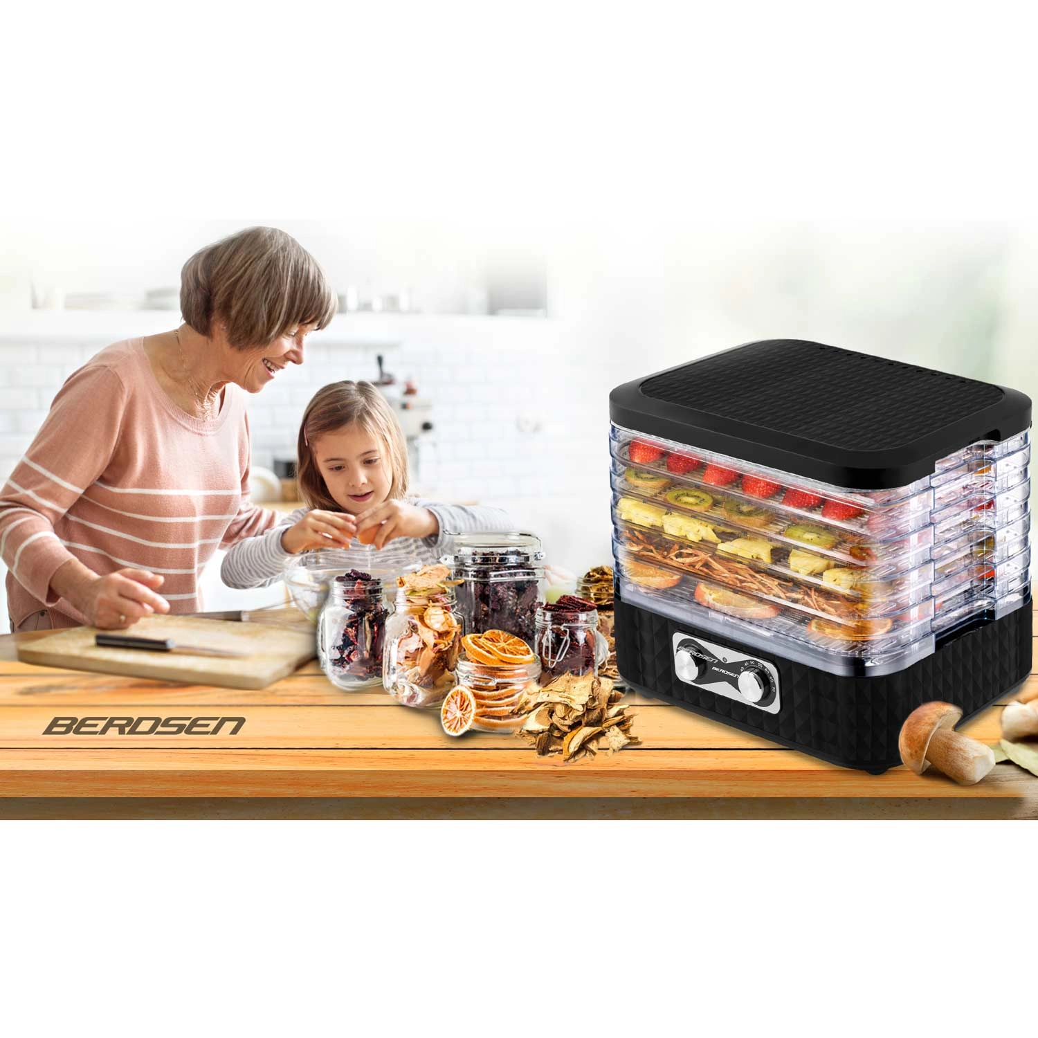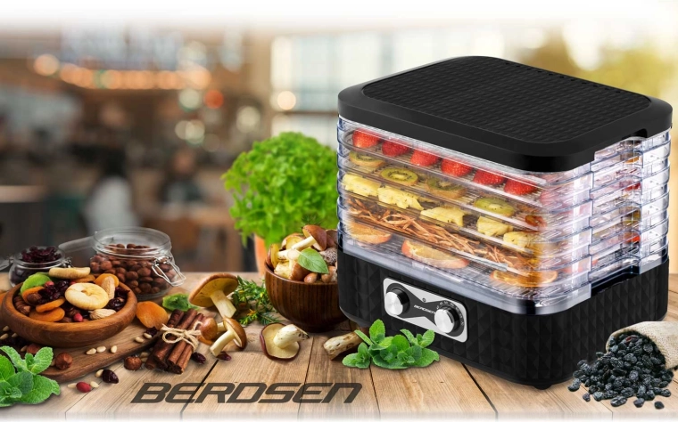 Készítsen egész szezonra elegendő készletet. A BERDSEN szárító egyszerű kezeléssel és átlátszó tálcákkal egyenletes szárítást biztosít odaégés nélkül. Az öt finom háló megakadályozza az apró darabok áthullását, így gond nélkül száríthat fűszernövényeket, erdei gombát, valamint eper- és almaszeleteket is.