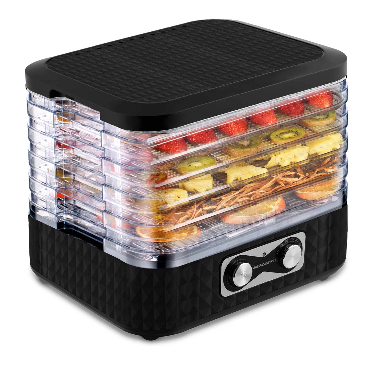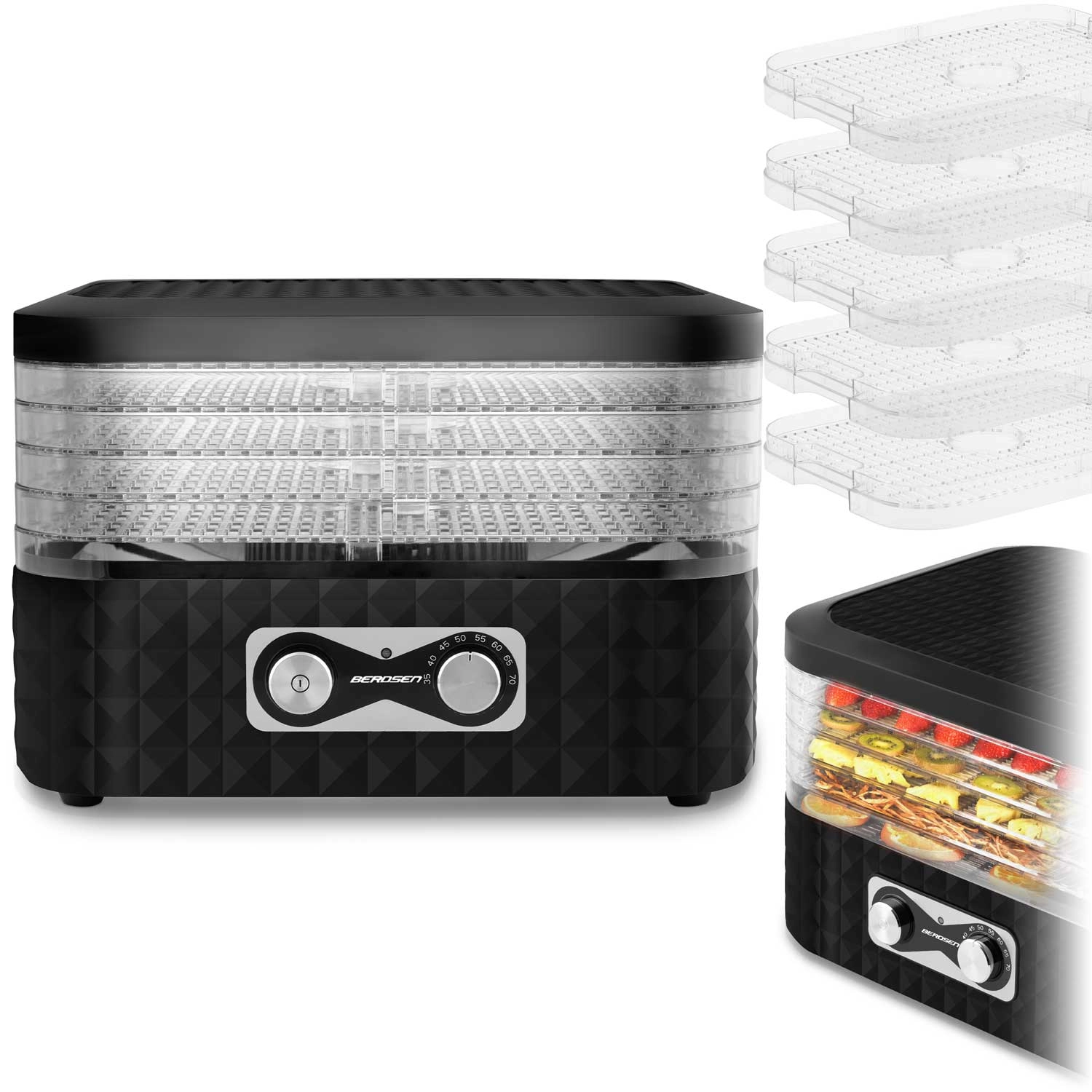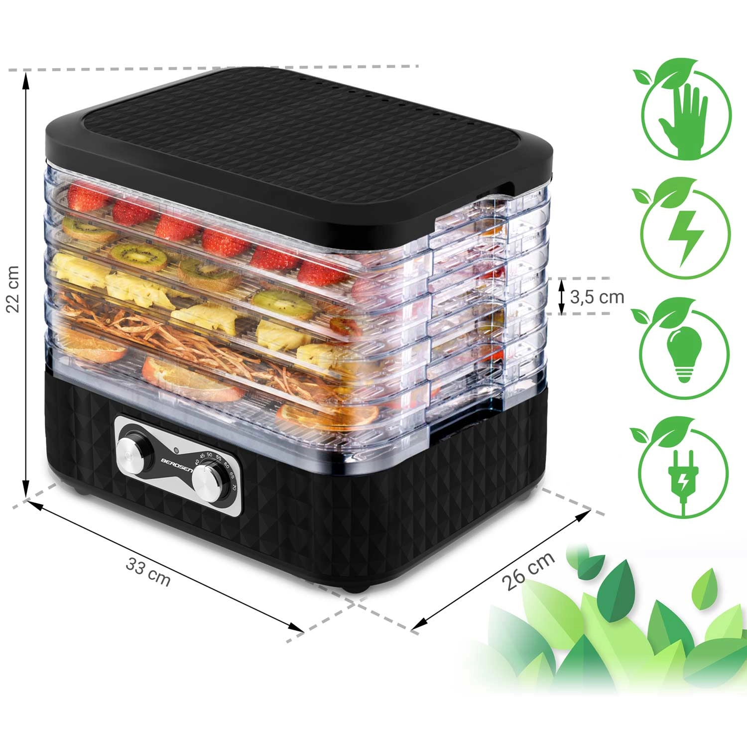 Készítsen egész szezonra elegendő készletet. A BERDSEN szárító egyszerű kezeléssel és átlátszó tálcákkal egyenletes szárítást biztosít odaégés nélkül. Az öt finom háló megakadályozza az apró darabok áthullását, így gond nélkül száríthat fűszernövényeket, erdei gombát, valamint eper- és almaszeleteket is.