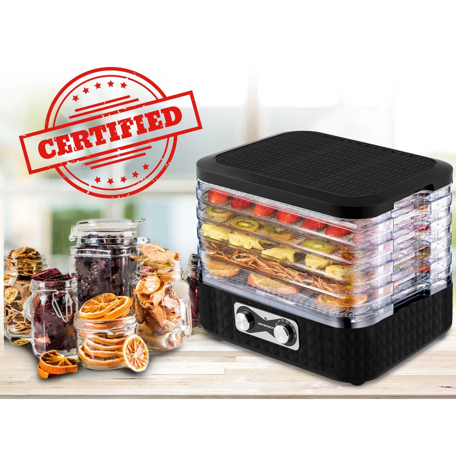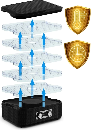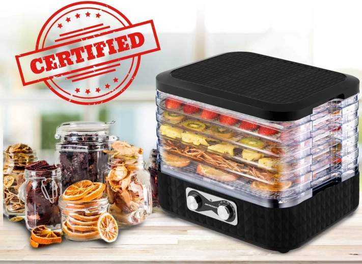 A 35–70 °C közötti hőmérséklet-beállításnak köszönhetően az adott alapanyaghoz igazíthatja a szárítást – a kíméletes gyógynövényszárítástól a intenzívebb zöldség- és hússzárításig. A biztonságos működést a CE és RoHS tanúsítványok, valamint a beépített hőbiztonsági elemek támogatják.