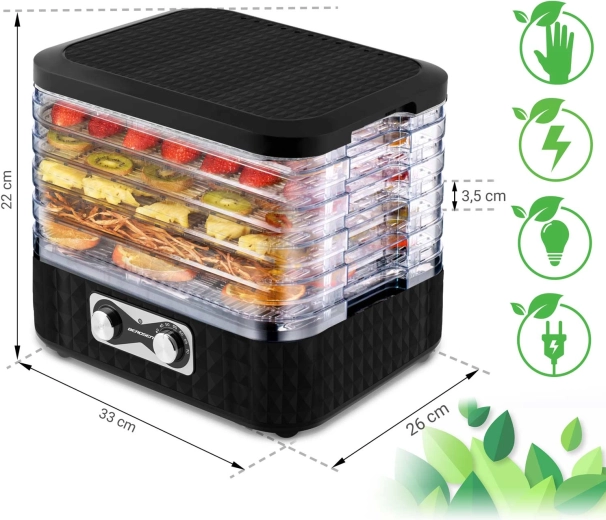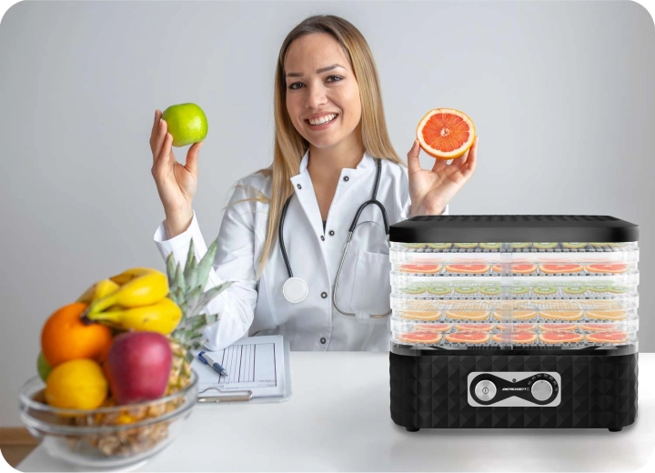 Állítsa be az ideális hőmérsékletet gyümölcsökhöz, fűszernövényekhez, zöldségekhez és húshoz, és érjen el tökéletes állagot és ízt az egyenletes légáramlásnak köszönhetően.