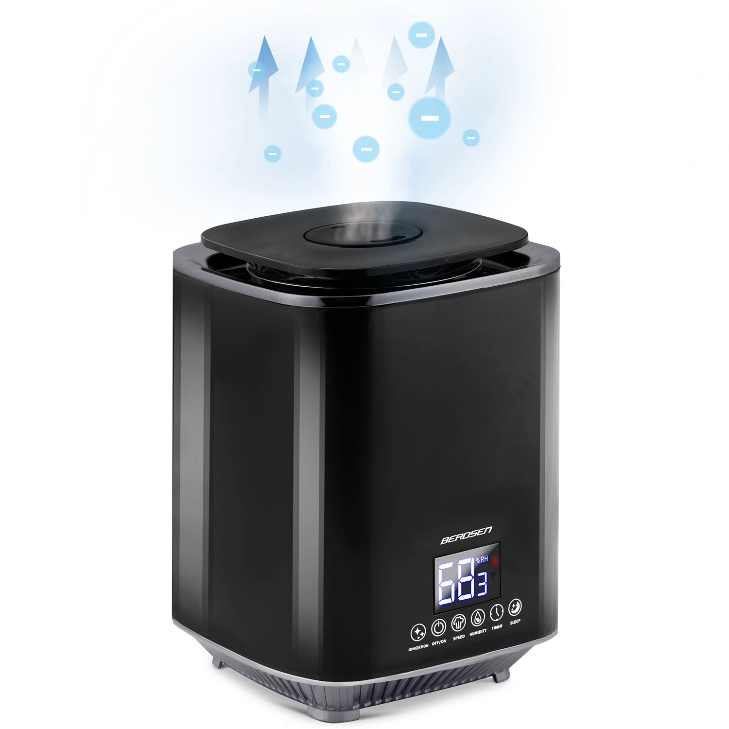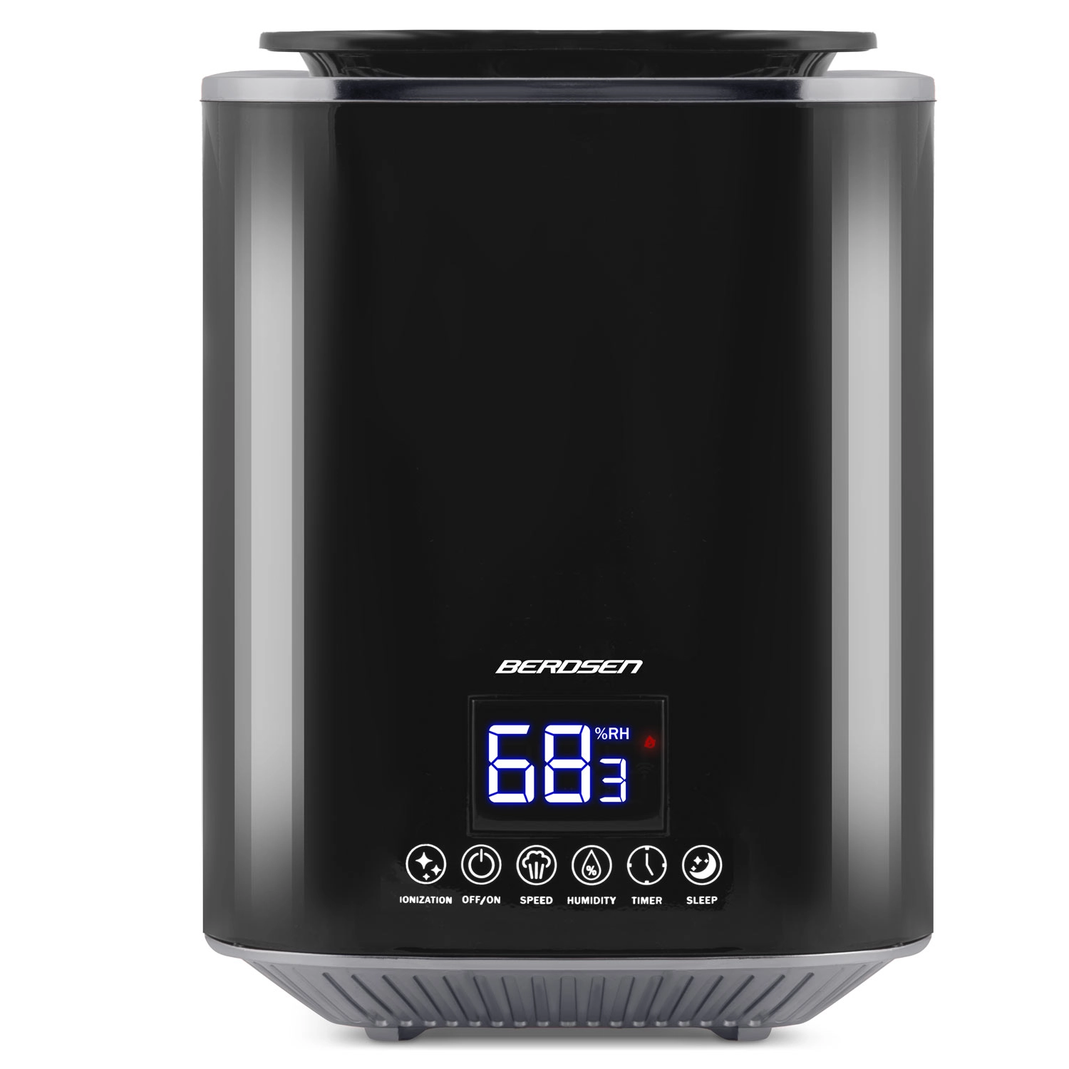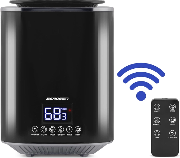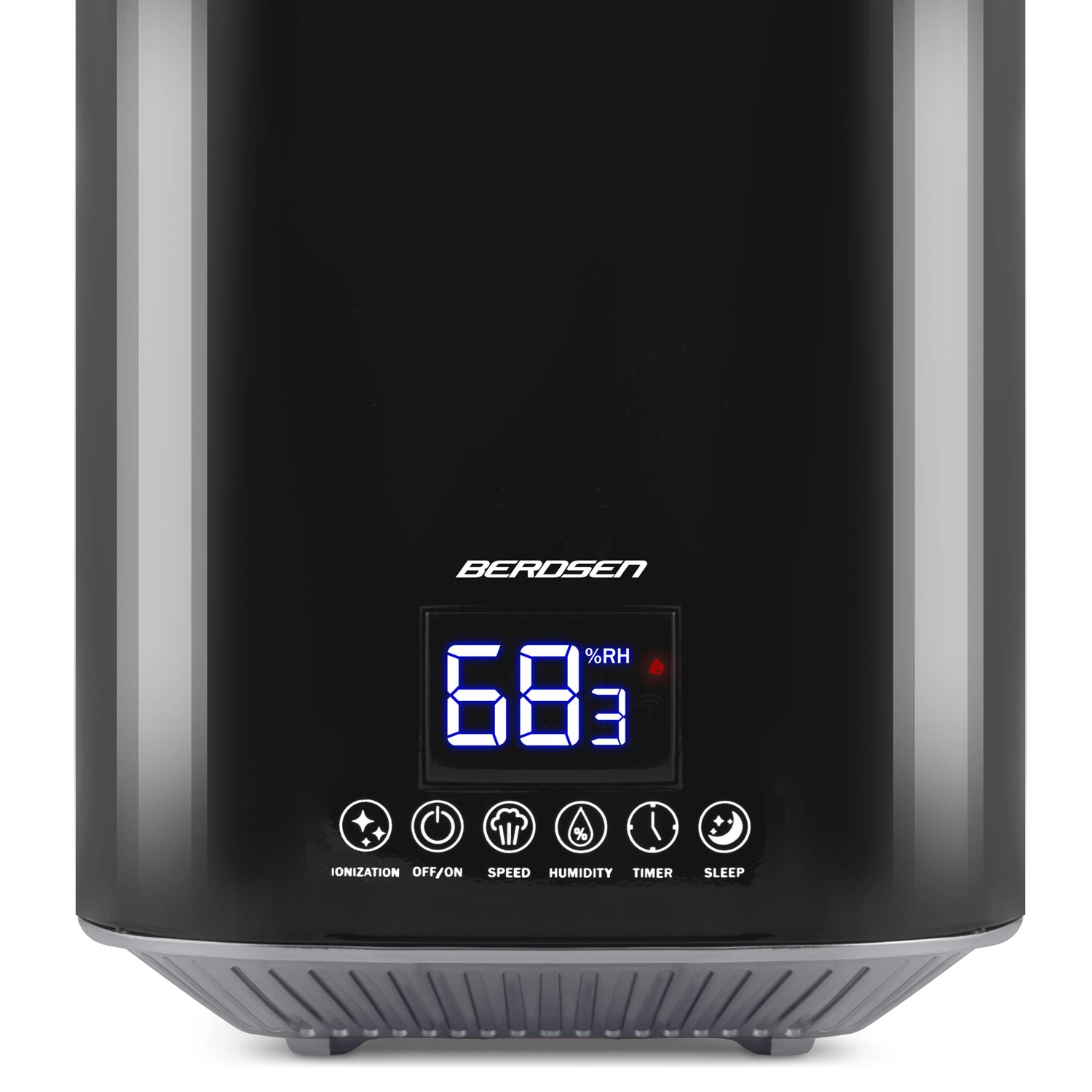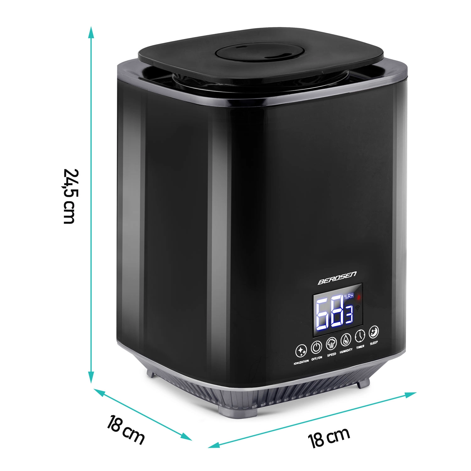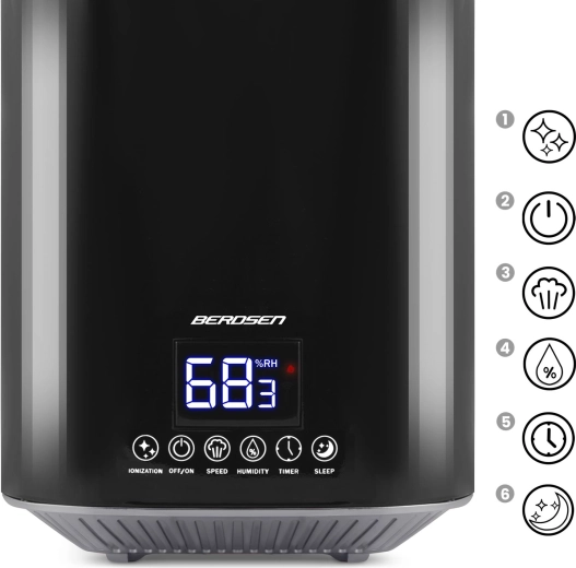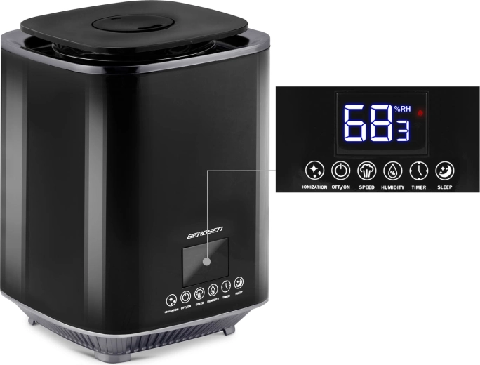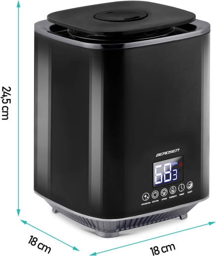 Modern ultrahangos BERDSEN légnedvesítő ionizációval és aromaterápiával, amely egészséges klímát biztosít otthon és az irodában. Akár 250 ml/óra teljesítményt, nagy, 2,6 l-es tartályt, a páratartalom pontos szabályozását 45–90% közötti higrosztáttal és beépített higrométert kínál. A kényelmes vezérlést érintős LED-panel és távirányító biztosítja, valamint időzítő, éjszakai mód és automatikus kikapcsolás is rendelkezésre áll a tartály kiürülésekor.