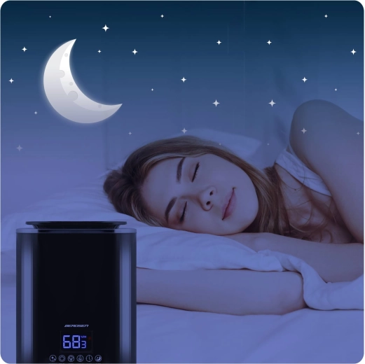 Az okos higrosztát (45–90%) tartja a beállított páratartalmat, és annak elérésekor készenléti módba kapcsol. Az éjszakai mód tompítja a kijelzőt, a készülék pedig csendesen folytatja a működést. Az intuitív érintésvezérléset 1–9 órás időzítő és praktikus automatikus kikapcsolás egészíti ki vízhiány esetén.