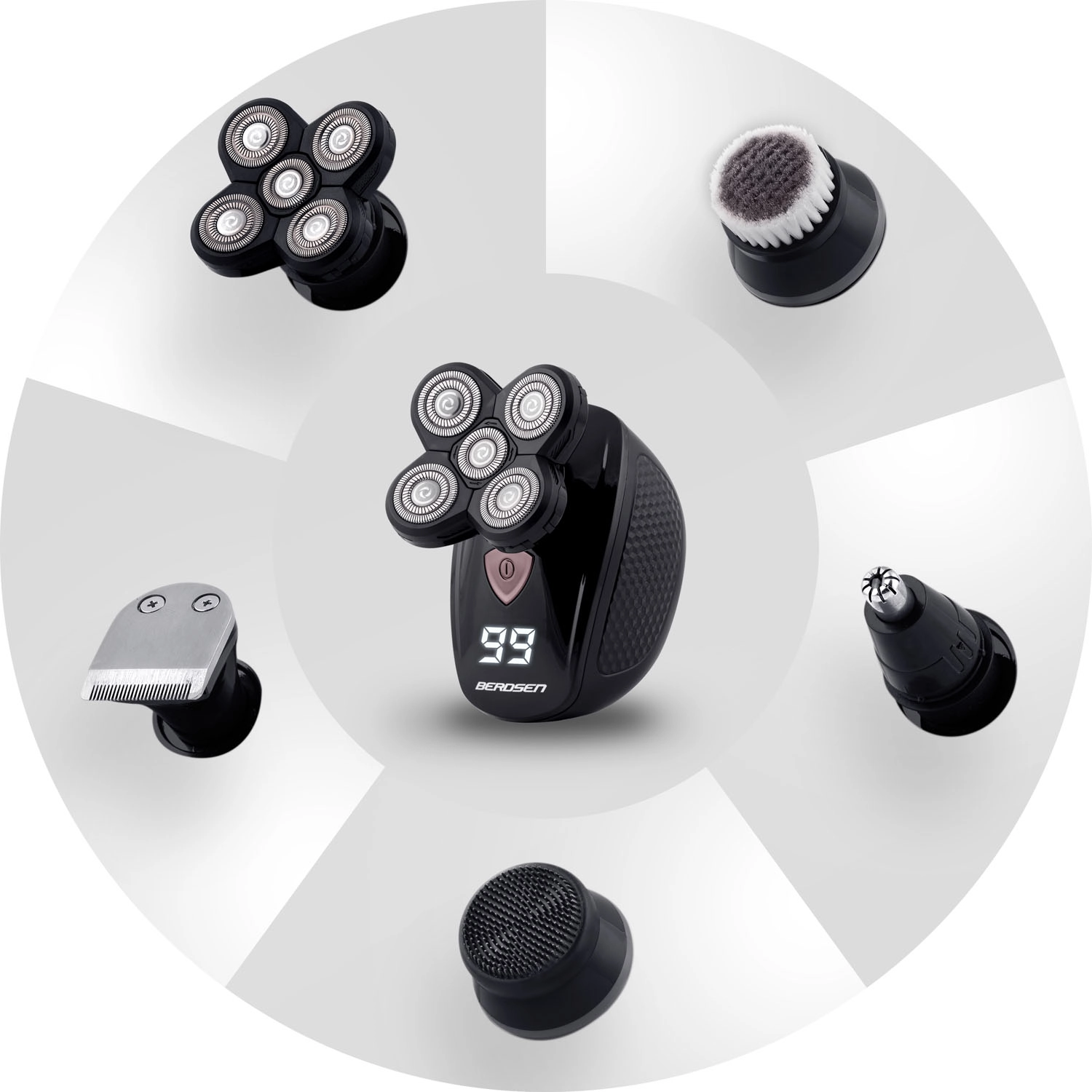 - 5 db: forgófej, precíziós fej/trimmelő, orr/fül trimmelő, szivacsos fej, kefés fej