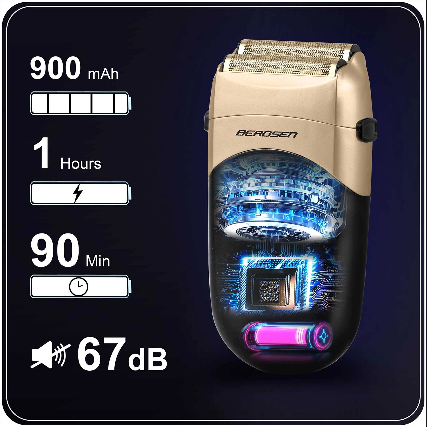 6500–7000 RPM fordulatú motor és áttekinthető LCD kijelző akkumulátor‑ és fordulatszám‑jelzéssel a teljes kontrollért borotválás közben.
