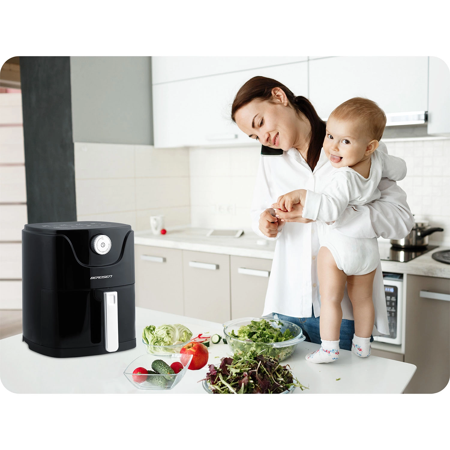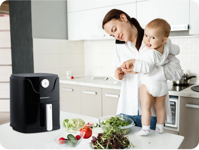 A BERDSEN forrólevegős sütő az egészségesebb ételkészítést maximális kényelemmel ötvözi. A modern forrólevegő-áramlás kívül aranybarna, ropogós kérget, belül szaftos állagot biztosít – szinte olaj, szag és fröcskölés nélkül. A 2,5 l-es kompakt űrtartalom ideális a gyors ebédhez, esti falatokhoz és a hétköznapi könnyű fogásokhoz.