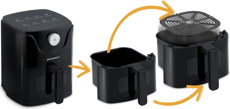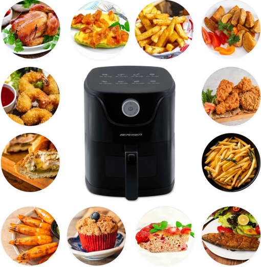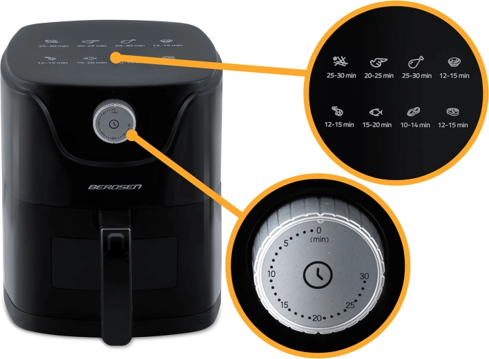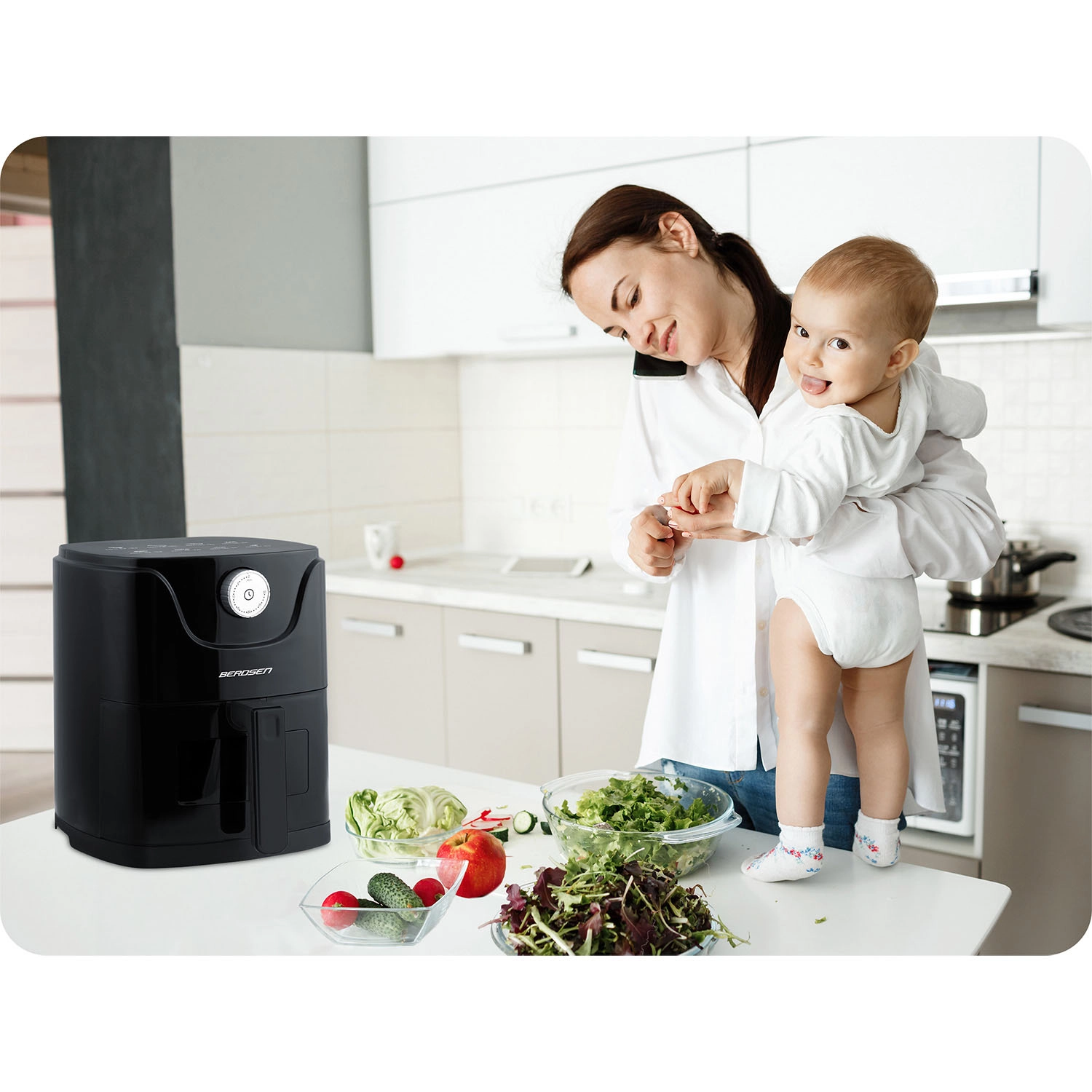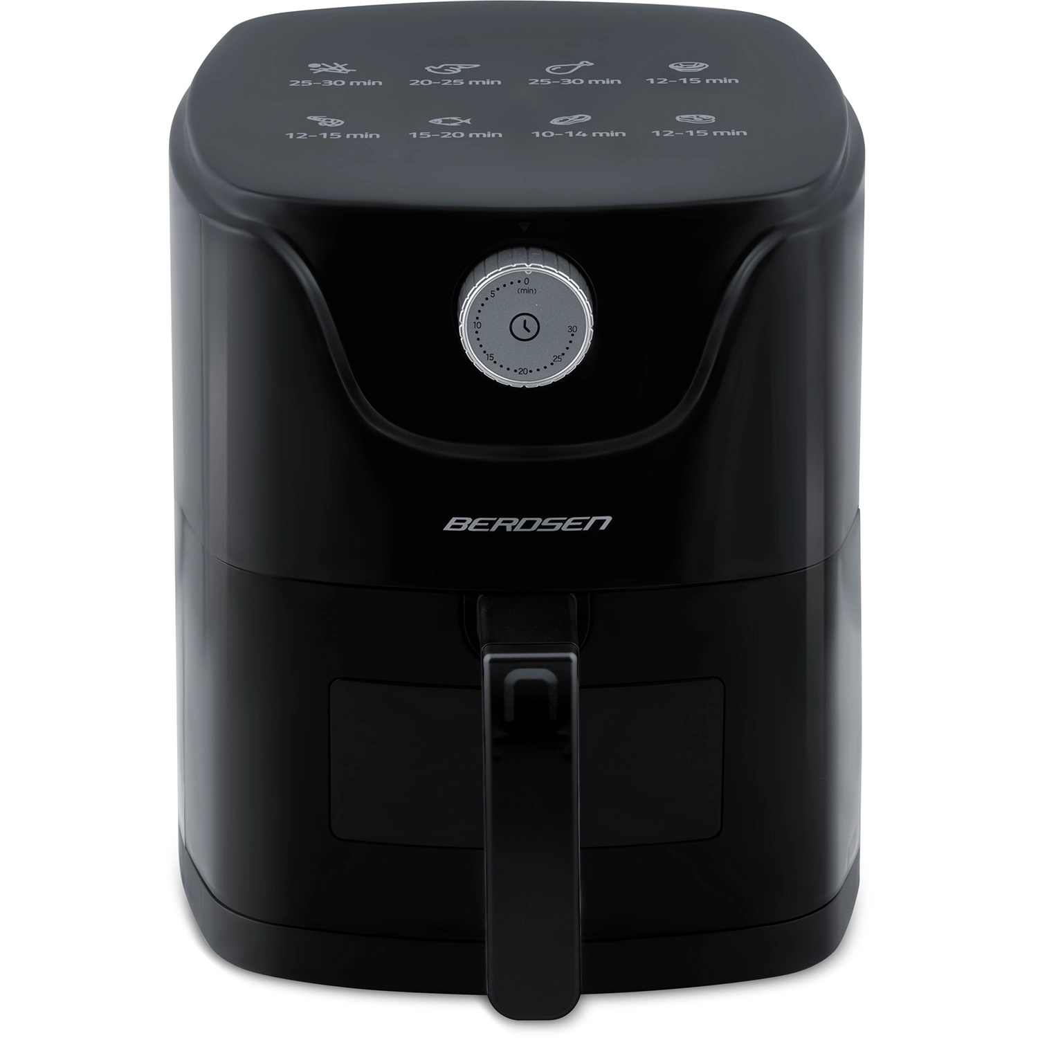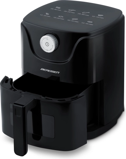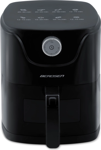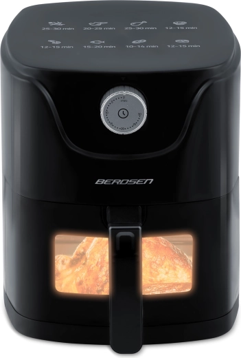 Fedezze fel a gyorsabb és egészségesebb főzést a BERDSEN forrólevegős sütővel, 1000 W teljesítménnyel és kompakt, 2,5 l kapacitással. A forró levegő keringetésének köszönhetően ropogós hasábburgonyát, szaftos csirkét vagy zöldségeket készíthet akár 90%-kal kevesebb zsírral – szag és rendetlenség nélkül. 8 automatikus programot, ablakos, LED-világítású kosarat kínál a nyitás nélküli ellenőrzéshez, valamint egyszerű kezelést a forgótárcsa segítségével.