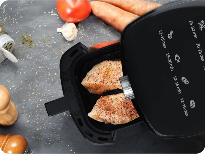 A forró levegő keringtetésének technológiája ropogós kérget és szaftos belsőt biztosít égett olaj, szag és felesleges kalóriák nélkül.