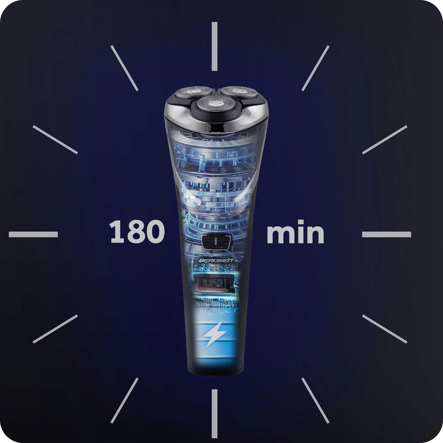 Élvezze a sima és kényelmes borotválkozást minden nap. A kiváló minőségű acél forgó borotvafejek követik az arc kontúrjait, és precíz borotválást biztosítanak húzás nélkül. Az integrált LCD kijelző áttekinthetően megjeleníti az akkumulátor állapotát és a sebességet, így teljes irányítást kap a borotválkozás felett.