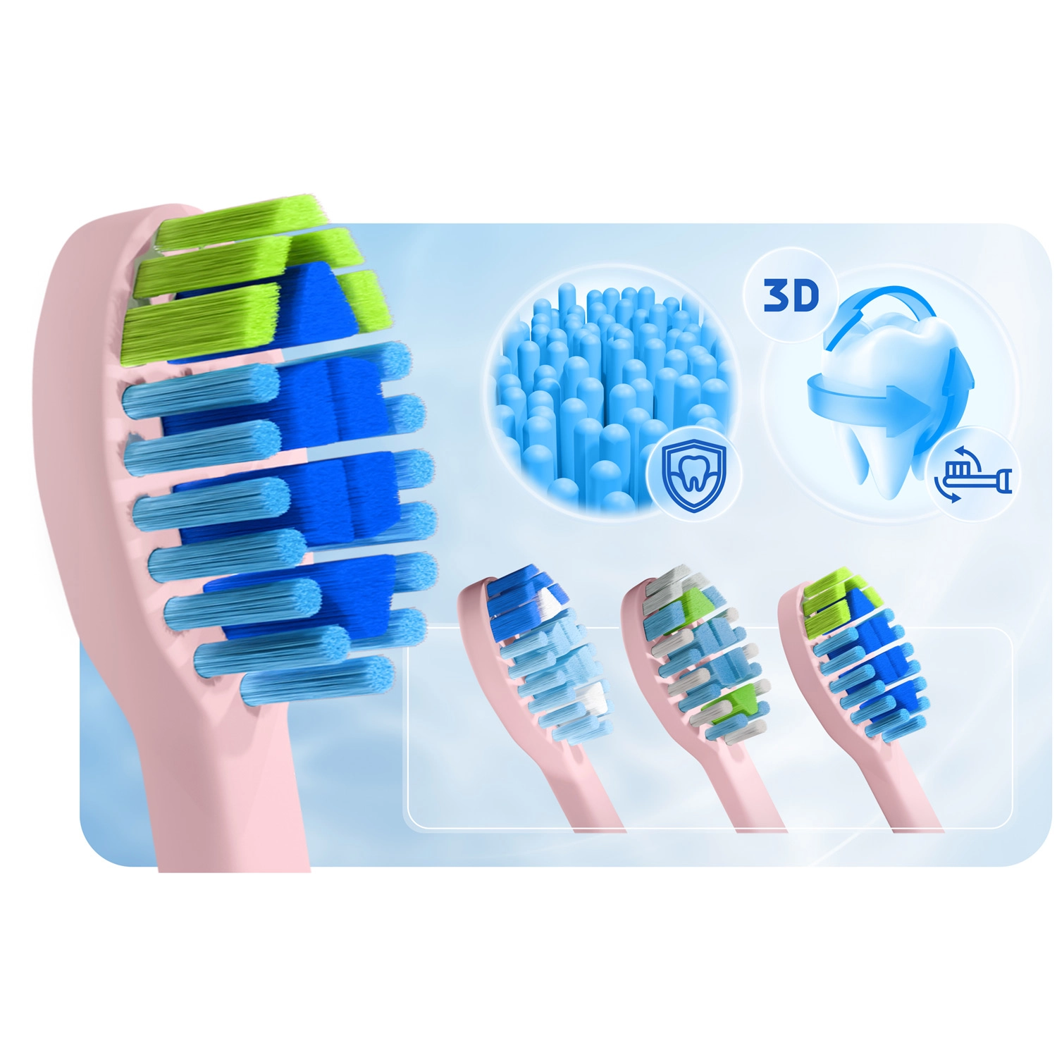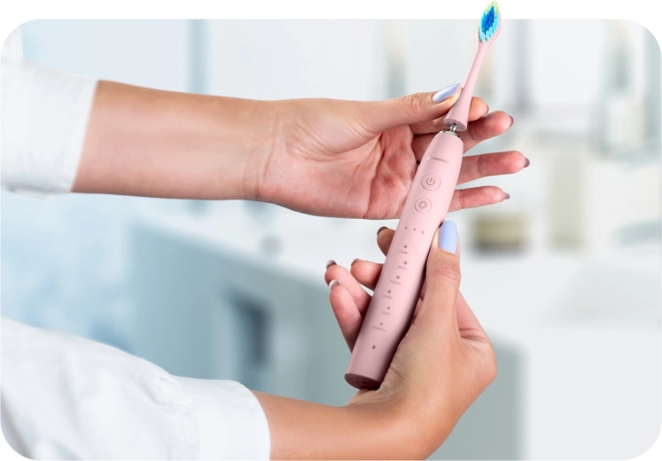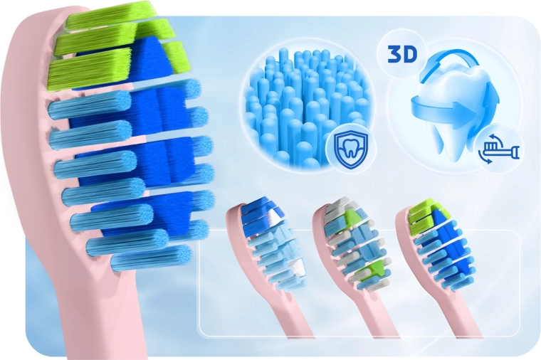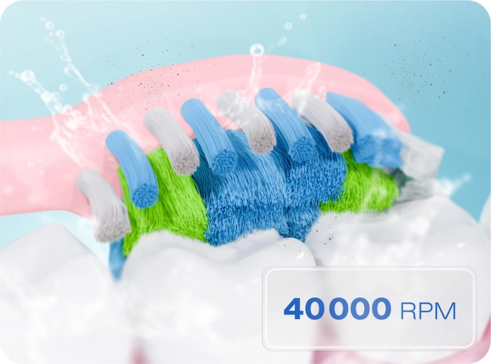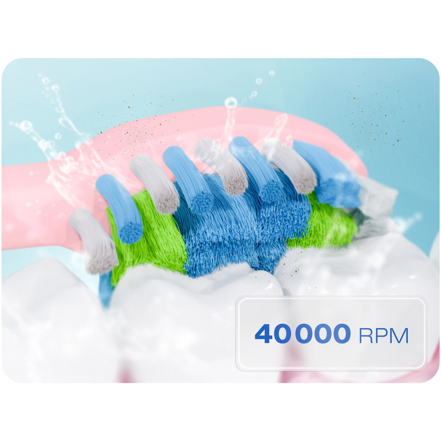 Hatékony szónikus tisztítás akár 40 000 rezgéssel percenként, amely gyorsan eltávolítja a lepedéket és az elszíneződéseket, miközben a finom sörték kíméletesen ápolják a zománcot és az ínyt. Az innovatív sörtekiosztású fej alkalmazkodik a fog formájához, a hátoldal pedig nyelvtisztítóként szolgál a hosszan tartó friss leheletért.