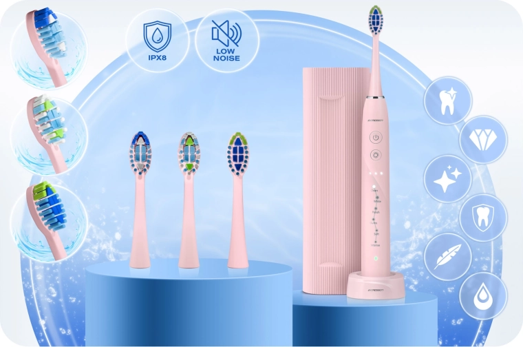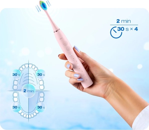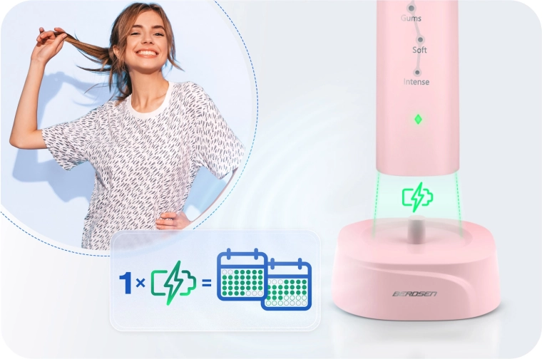 Fedezze fel a BERDSEN Galaxy szónikus fogkefét elegáns rózsaszín színben a mindennapi, professzionális szájhigiénéhez. Akár 40 000 mozdulat percenként, 6 tisztítási mód és 3 intenzitási szint a tökéletes személyre szabáshoz. A csomagban 3 cserélhető fej, akár 50 napos üzemidő erős akkumulátorral, 2 perces időzítő 30 mp-es szakaszokkal és IPX8 vízállóság – ideális otthonra és utazáshoz a mellékelt utazótokkal.