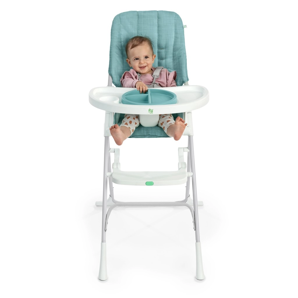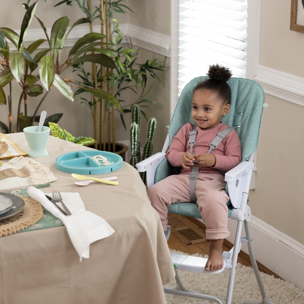 A kompakt és könnyű INGENUITY Sun Valley etetőszék helytakarékos, miközben kényelmes és biztonságos étkezést biztosít a gyermeknek. A laposra csukható kialakításnak köszönhetően önmagában megáll, levehető és mosható huzattal, 5 pontos biztonsági övvel, valamint egy egyedi, háromrekeszes Twist & Dine tányérral rendelkezik rögzítéssel és mikrohullámú sütőben melegíthető kivitelben. A 3 fokozatban állítható tálca és a stabil fém váz 6 hónapos kortól 15 kg-ig kényelmet nyújt.