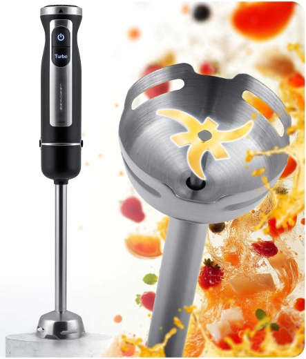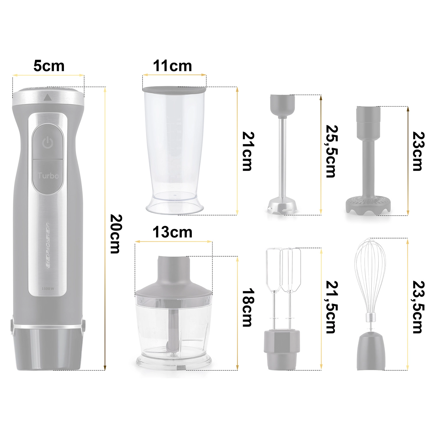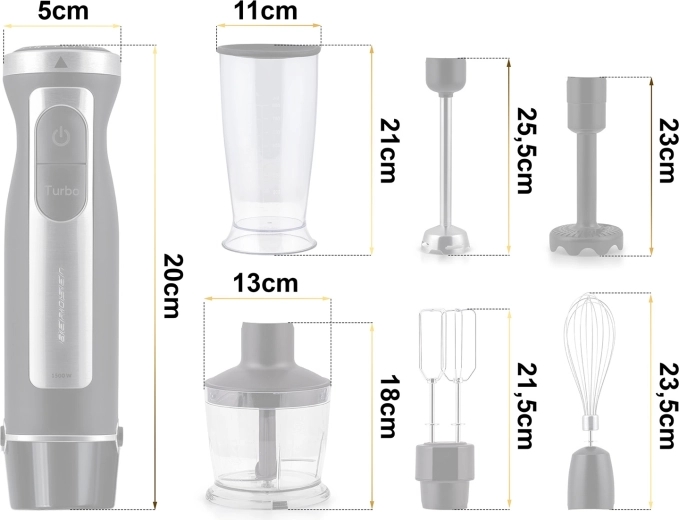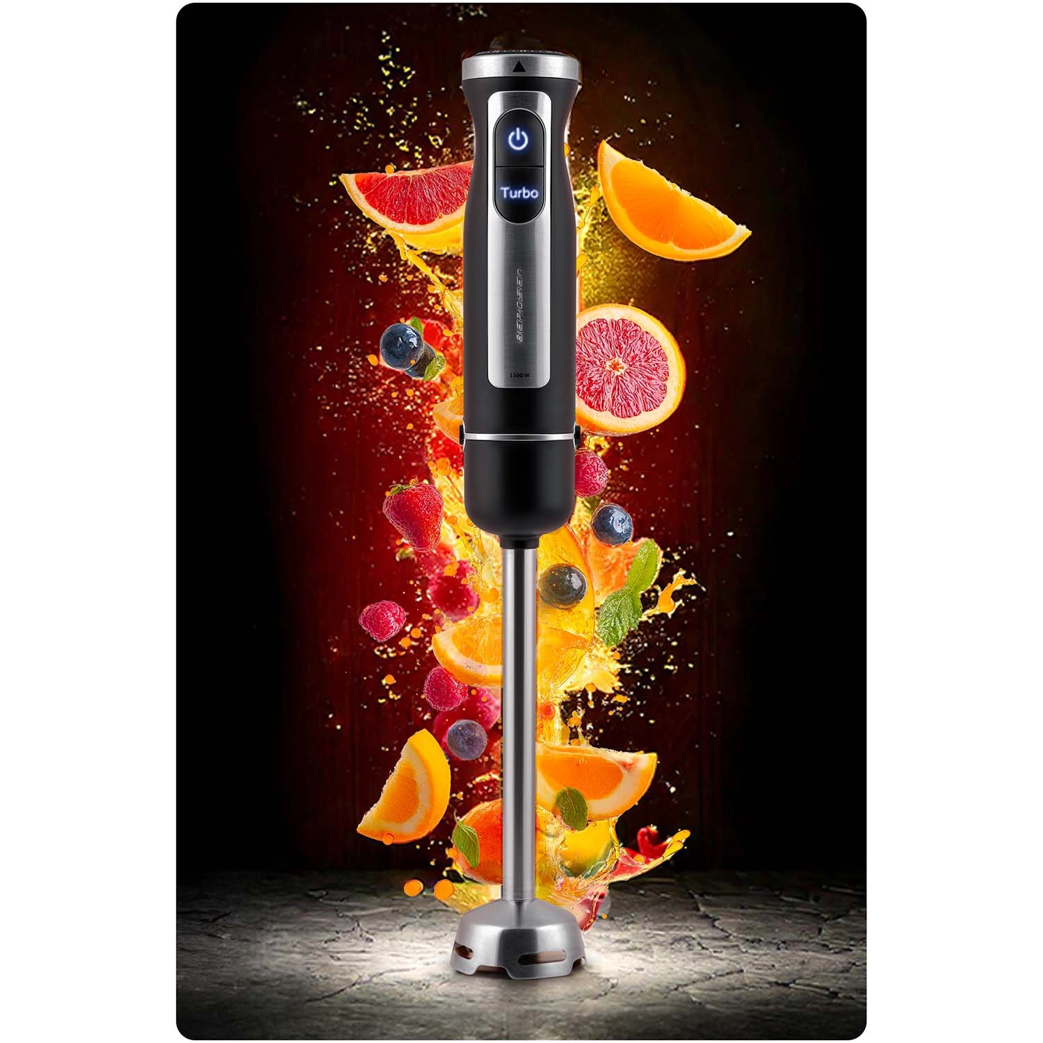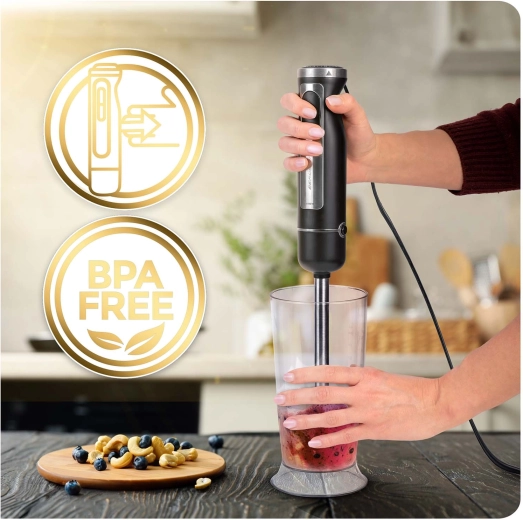 Fedezze fel az erőt és a pontosságot a konyhában a BERDSEN botmixerrel. A masszív 1500 W-os motor és a TURBO üzemmód villámgyors eredményt biztosít még kemény hozzávalóknál is, míg az arany színű titán él hosszú élettartamot, kiváló korrózióállóságot és könnyű tisztítást nyújt. A 25 fokozatban finoman szabályozható sebességnek köszönhetően teljes kontrollt kap a levesek, mártások, smoothie-k és tészták állaga felett.
