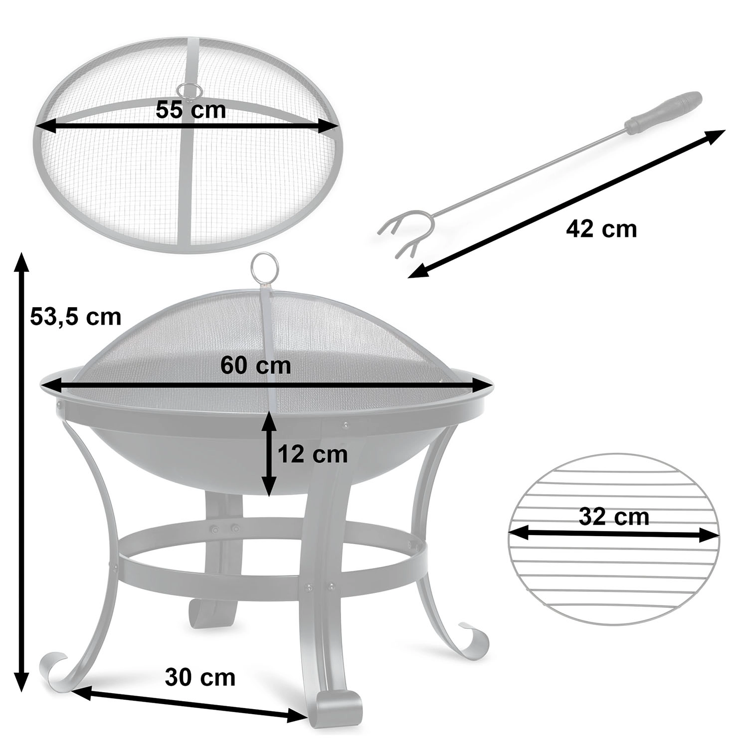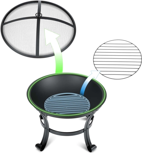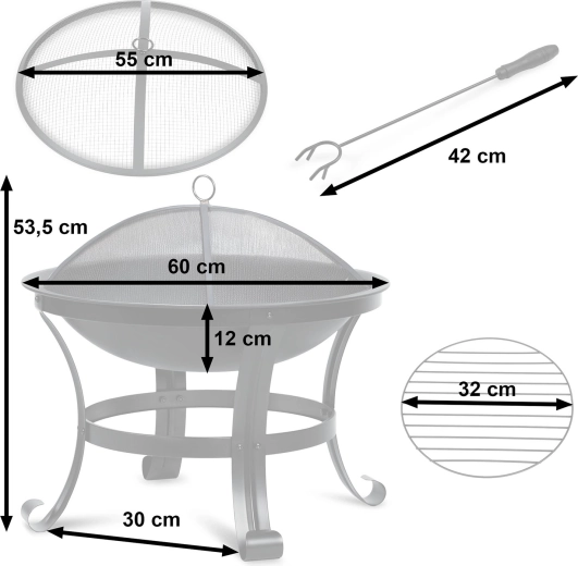 A átgondolt szellőzésnek és a megfelelő tálmélységnek köszönhetően a tűz gyorsan fellobban, és stabilan, szép lánggal ég. A tűzrakóhely masszív lábakkal rendelkezik a stabilitásért teraszon és gyepen egyaránt, praktikus fogantyúkkal a hordozáshoz, a csomagban pedig piszkavas/poker is található a könnyű rakodáshoz.