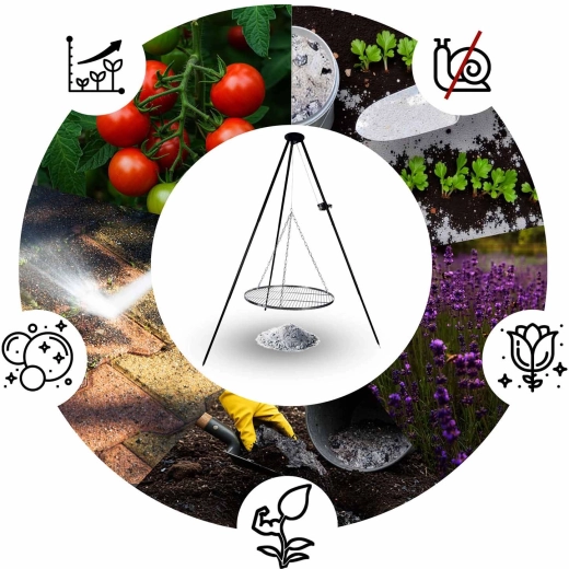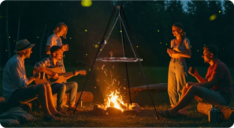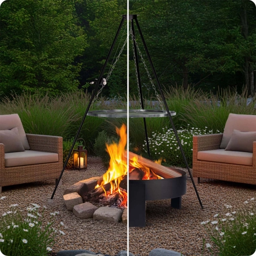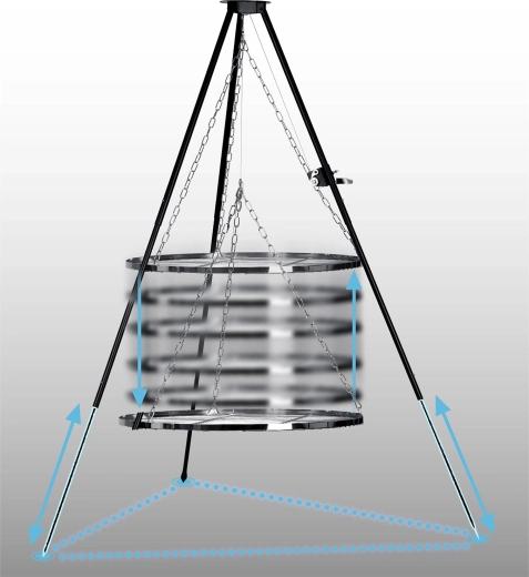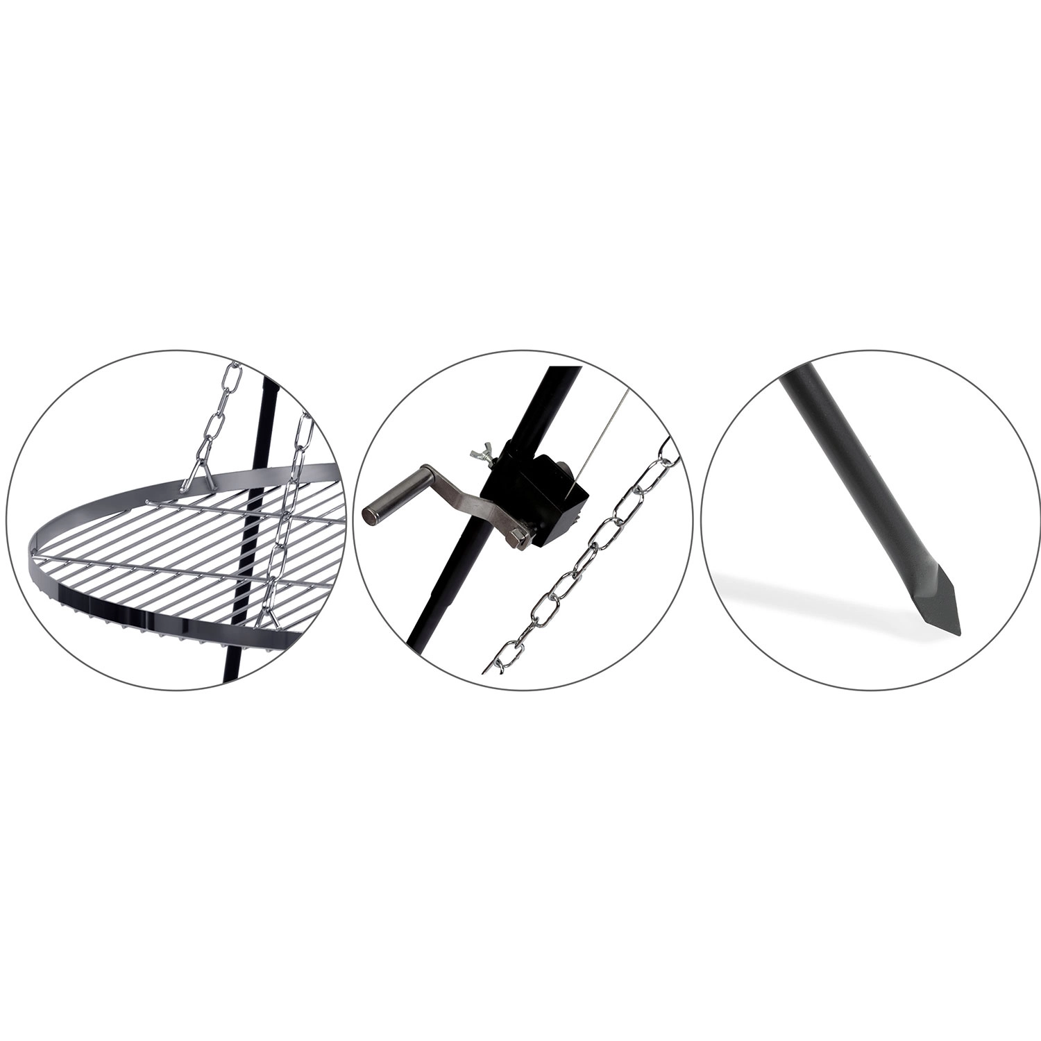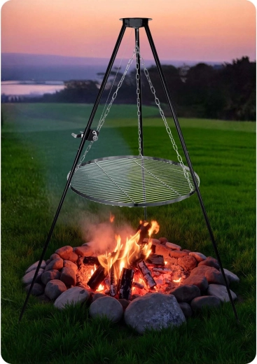 A stabil, hegyes lábak a földbe szúrhatók, a megbízható emelőmechanizmus reteszeléssel pedig biztonságos működést garantál. Kertekbe, táborhelyekre és tűzrakók mellé egyaránt kiváló – a nyílt tűz hangulatát és az ételek egyedi ízét hozza el.