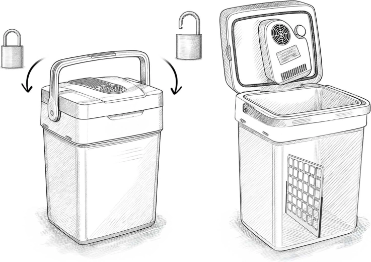 - Biztonságos szállítás – a fogantyú zárt helyzetben rögzíti a fedelet.