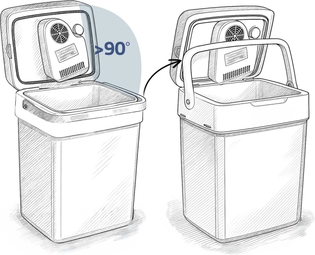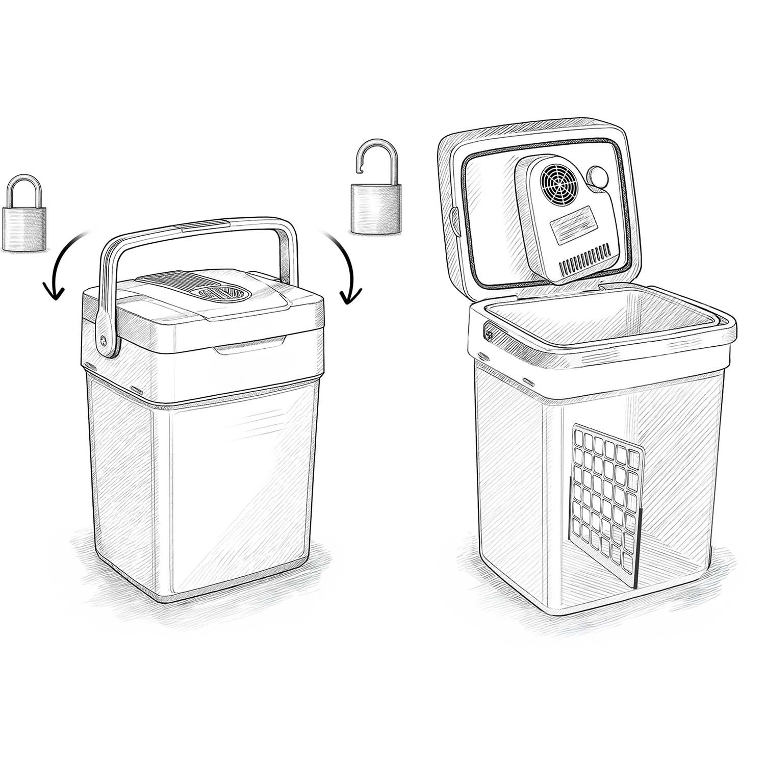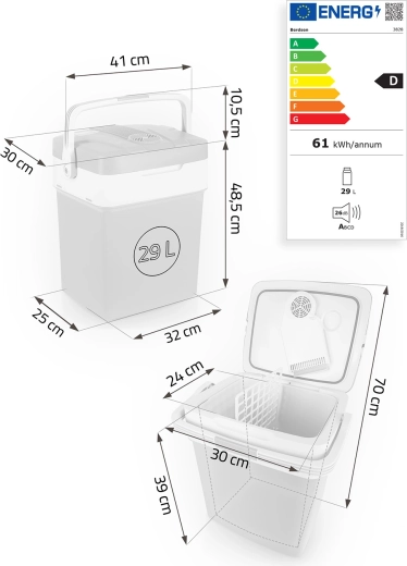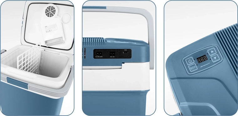 Akár 18 °C-kal a környezeti hőmérséklet alá hűt, melegítő üzemmódban pedig 65 °C-ig tartja melegen az ételeket. A praktikus összecsukható fogantyú a fedél támaszaként is szolgál, a függőleges fogantyúállásban működő zár megakadályozza a fedél véletlen kinyílását szállítás közben, a belső válaszfal pedig segít a tartalom rendszerezésében. ECO módban a rendkívül halk működés (26 dB) még éjszaka sem zavaró.