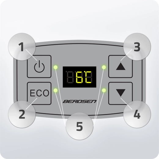- Elektronikus panel, hőmérséklet-beállítás, ON/OFF gomb, jelzőfények