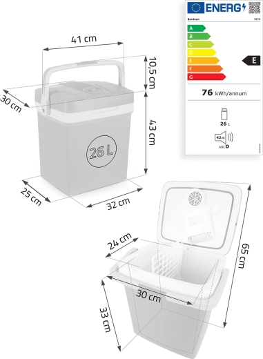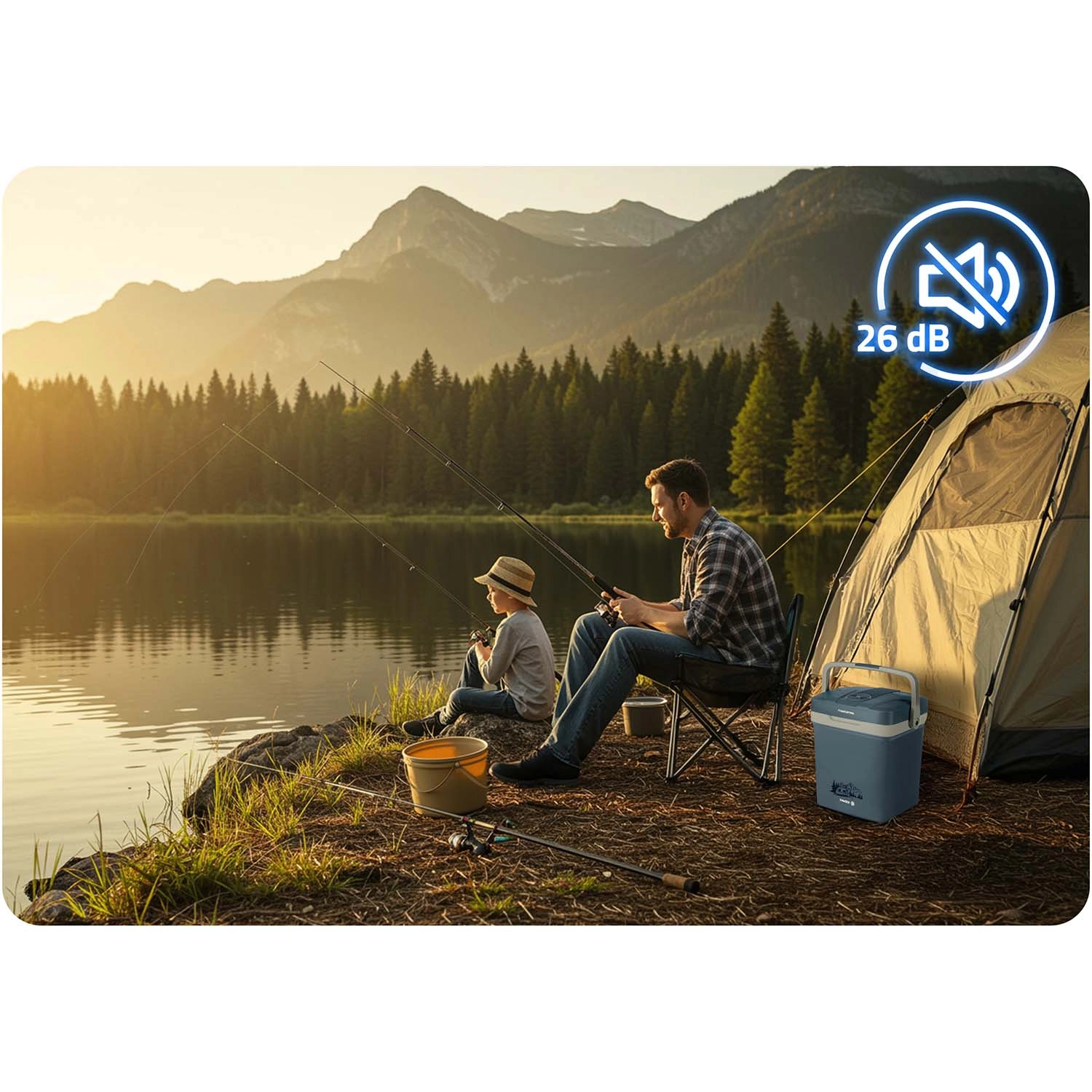 A 12 V-os (autó) és 230 V-os (hálózati) tápellátásnak köszönhetően tökéletes utazáshoz, piknikhez és hosszabb nyaralásokhoz. A fedél biztonsági reteszt kapott a fogantyú függőleges helyzetében, a fogantyú pedig fedéltámaszként is használható töltés közben. Rendkívül csendes működés ECO módban (mindössze 26 dB) a nyugodt pihenésért.