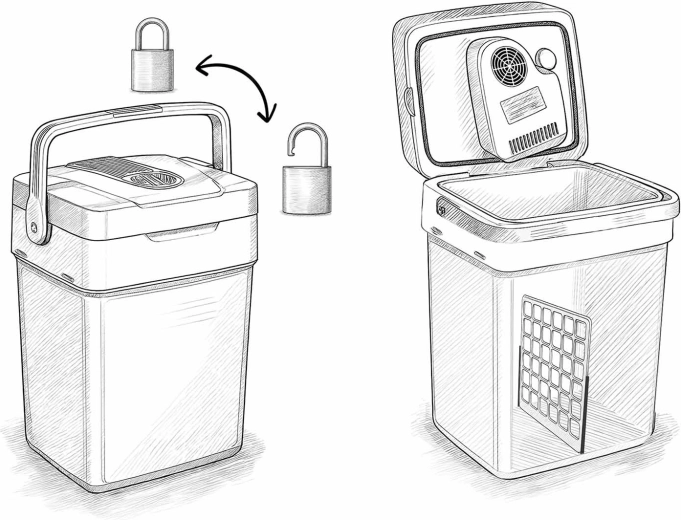Zárható fedél szállítás közben, összecsukható fogantyú, amely megtámasztja a fedelet töltéskor, valamint strapabíró elválasztó a rendezett élelmiszertároláshoz.