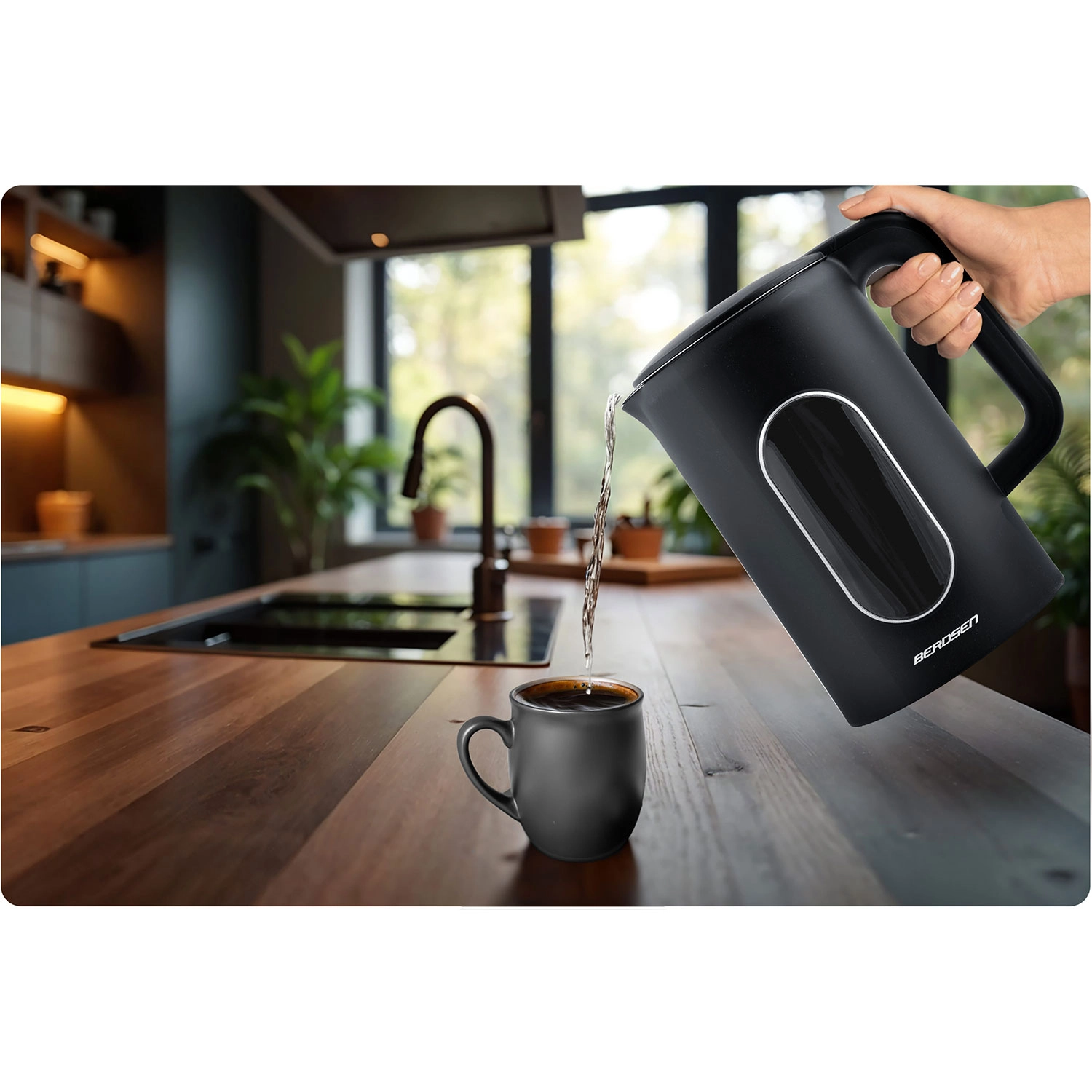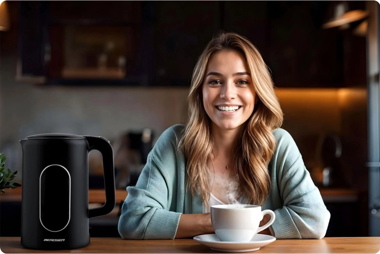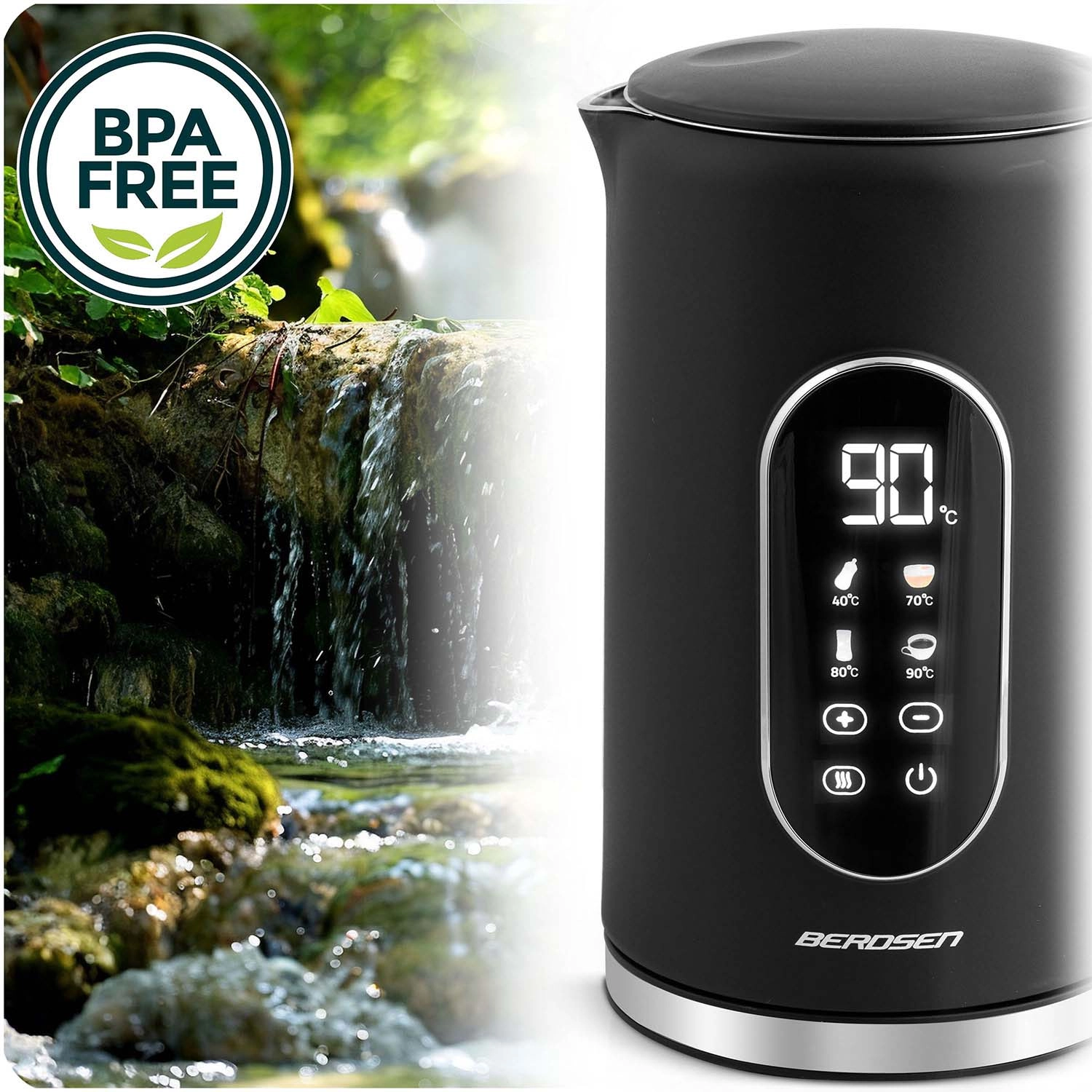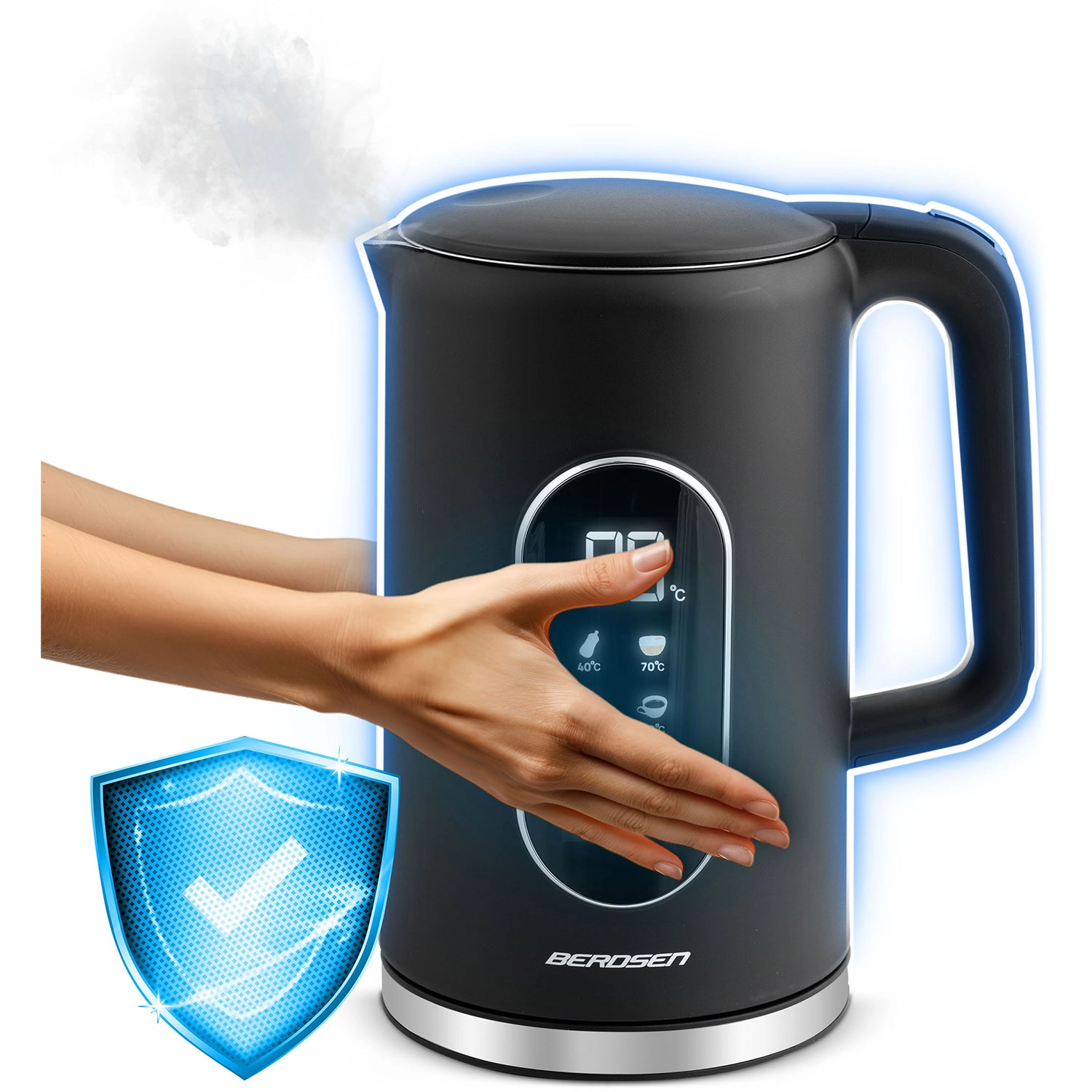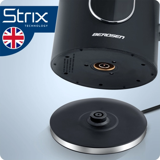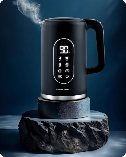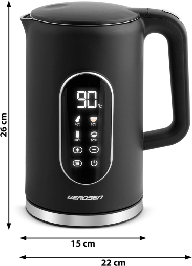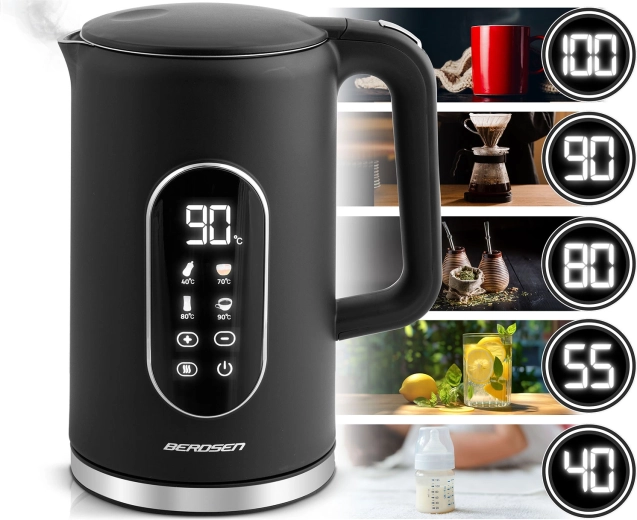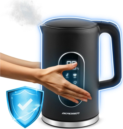 Modern BERDSEN vízforraló 1,7 l űrtartalommal, érintőpanellel, pontos, 5 °C-os lépésekben állítható hőmérséklettel és akár 2 órás hőmérséklet-tartás üzemmóddal. A kétrétegű CoolTouch kialakításnak köszönhetően kívül hűvös marad, gyors és halk melegítést kínál akár 2200 W teljesítménnyel, valamint SUS 304 rozsdamentes acél belső felépítést a tiszta vízízért. Az elegáns, megvilágított kijelző stílust kölcsönöz konyhájának.
