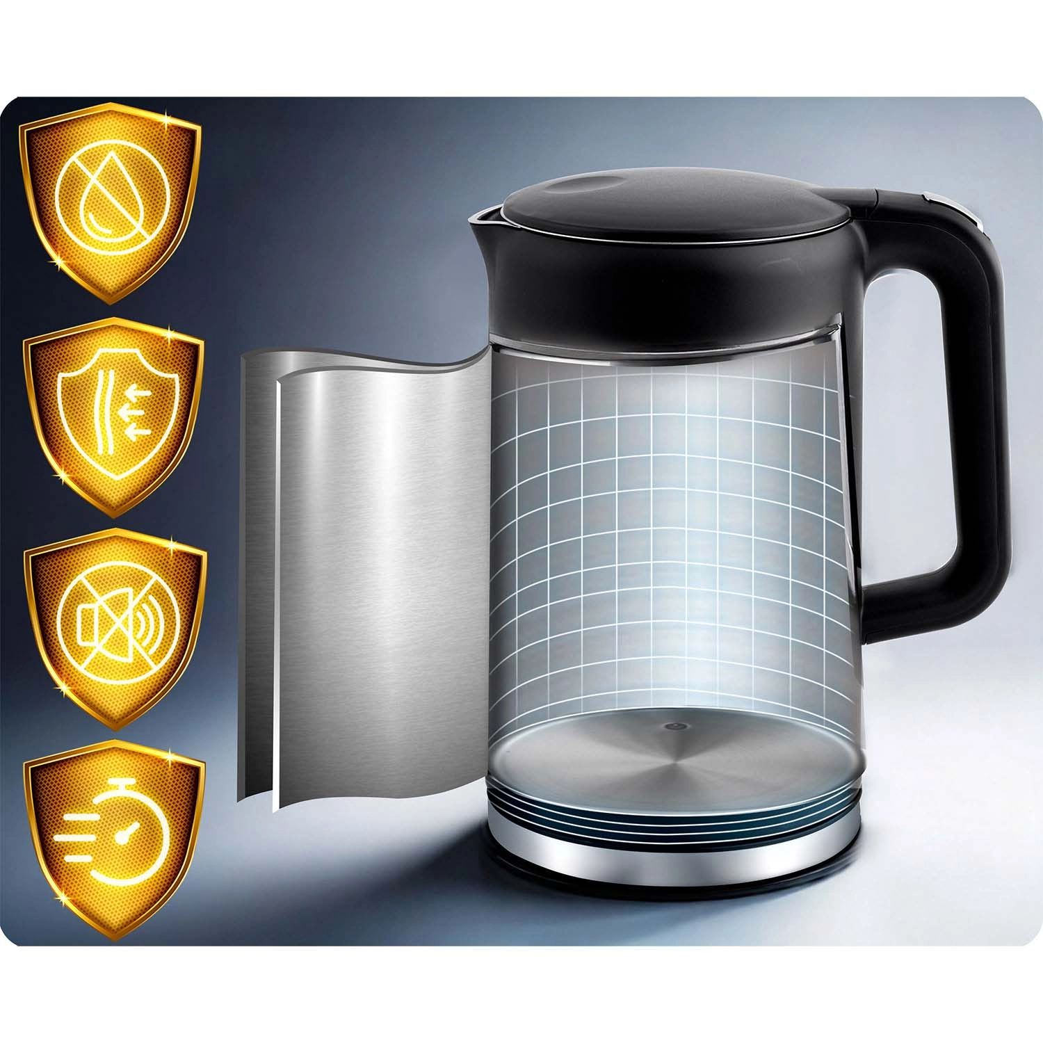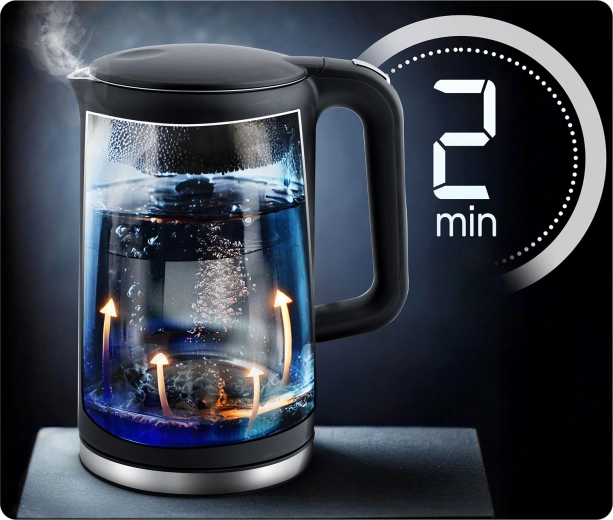 2–5 perc alatt felforralja a vizet. Halk működés, automatikus kikapcsolás forrás után és szárazonfutás elleni védelem a biztonságos használatért.