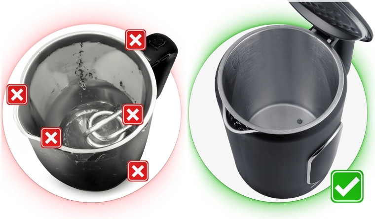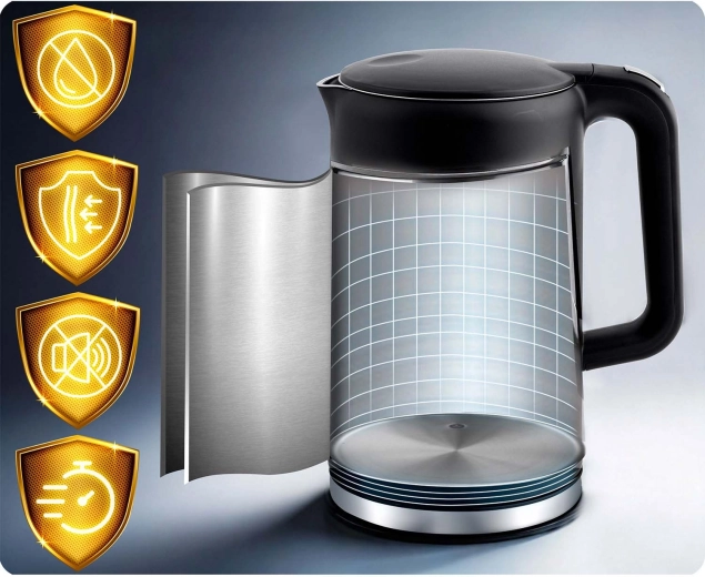 Biztonságos és tartós kialakítás: a kétrétegű CoolTouch ház rozsdamentes acélt és minőségi műanyagot kombinál a jobb szigetelésért, hűvös felületért és alacsonyabb hőveszteségért. A SUS 304 rozsdamentes belső higiénikus, könnyen tisztítható és nem befolyásolja a víz ízét. A vízforraló gyors és halk (akár 2200 W), szárazonfutás elleni védelemmel és automatikus kikapcsolással forrás után.