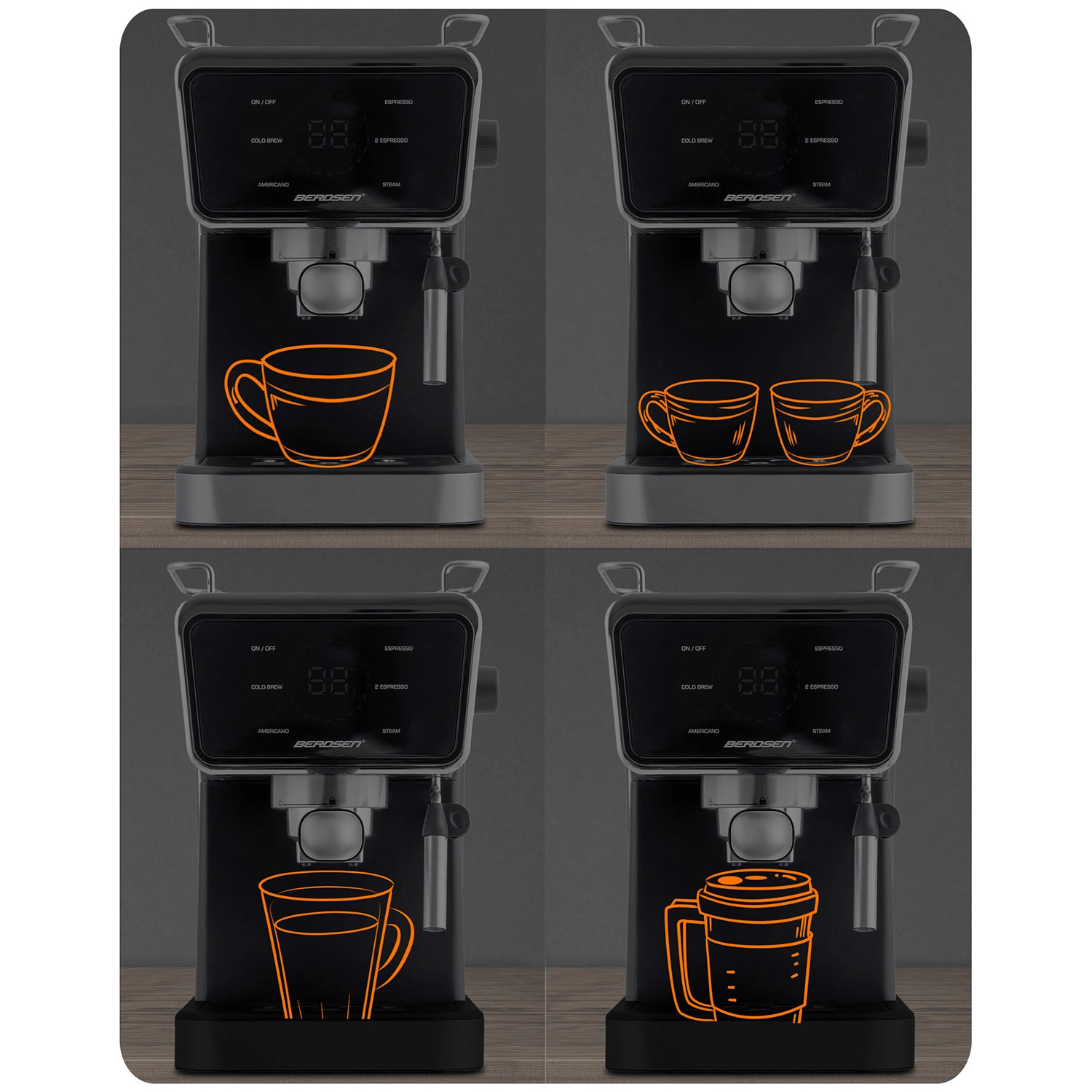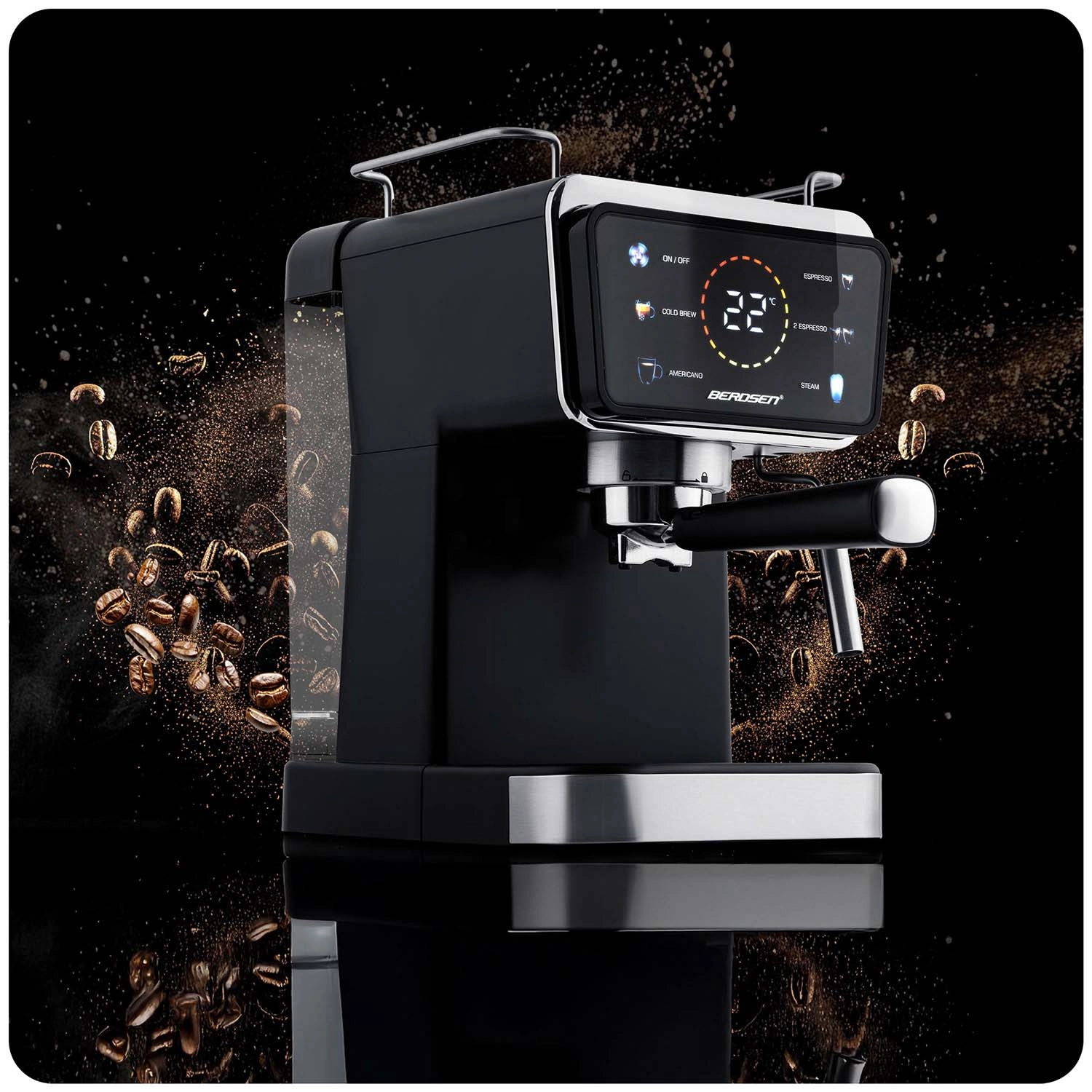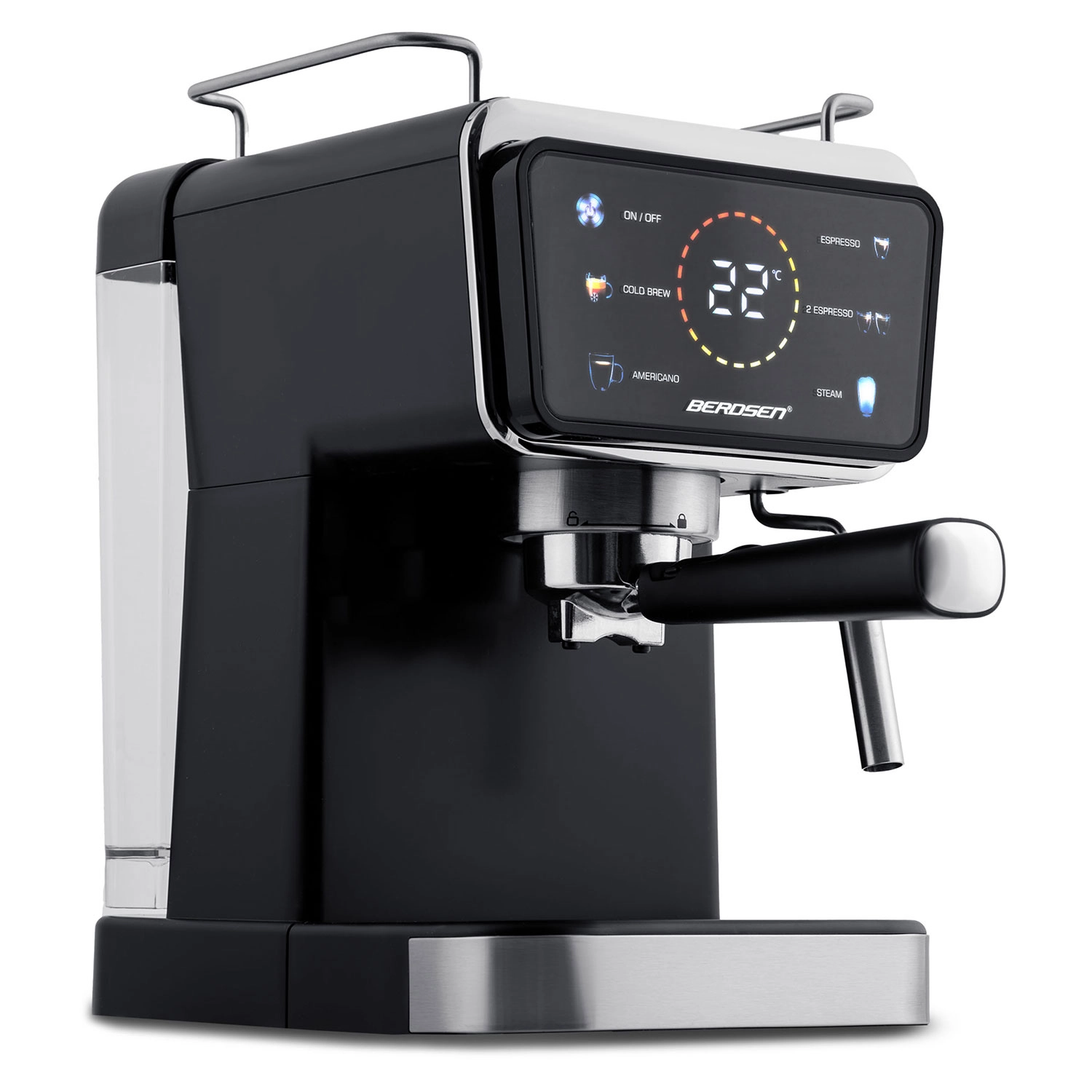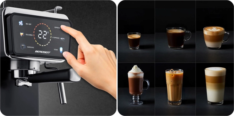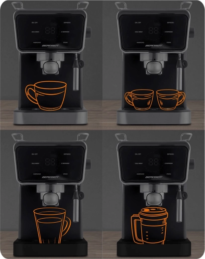 Változtassa konyháját otthoni kávézóvá. A Berdsen karos kávéfőző nagy teljesítményű, 20 baros pumpát és precíz extrakciós rendszert kombinál az intenzív aromáért, telt ízért és tökéletes cremáért. Az érintőpanel gyorsan elérhető funkciókat kínál: espresso, gőz és hideg espresso, míg a professzionális gőzkar sűrű, bársonyos habot készít cappuccinóhoz, lattéhoz vagy flat white-hoz.