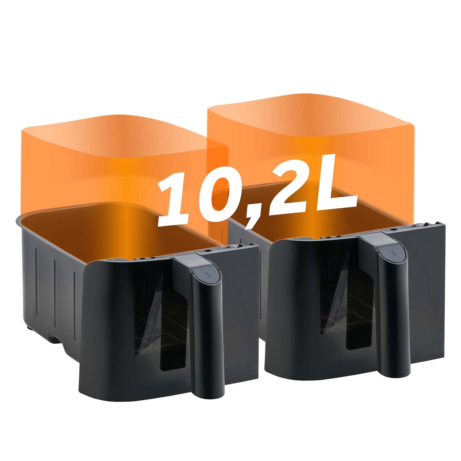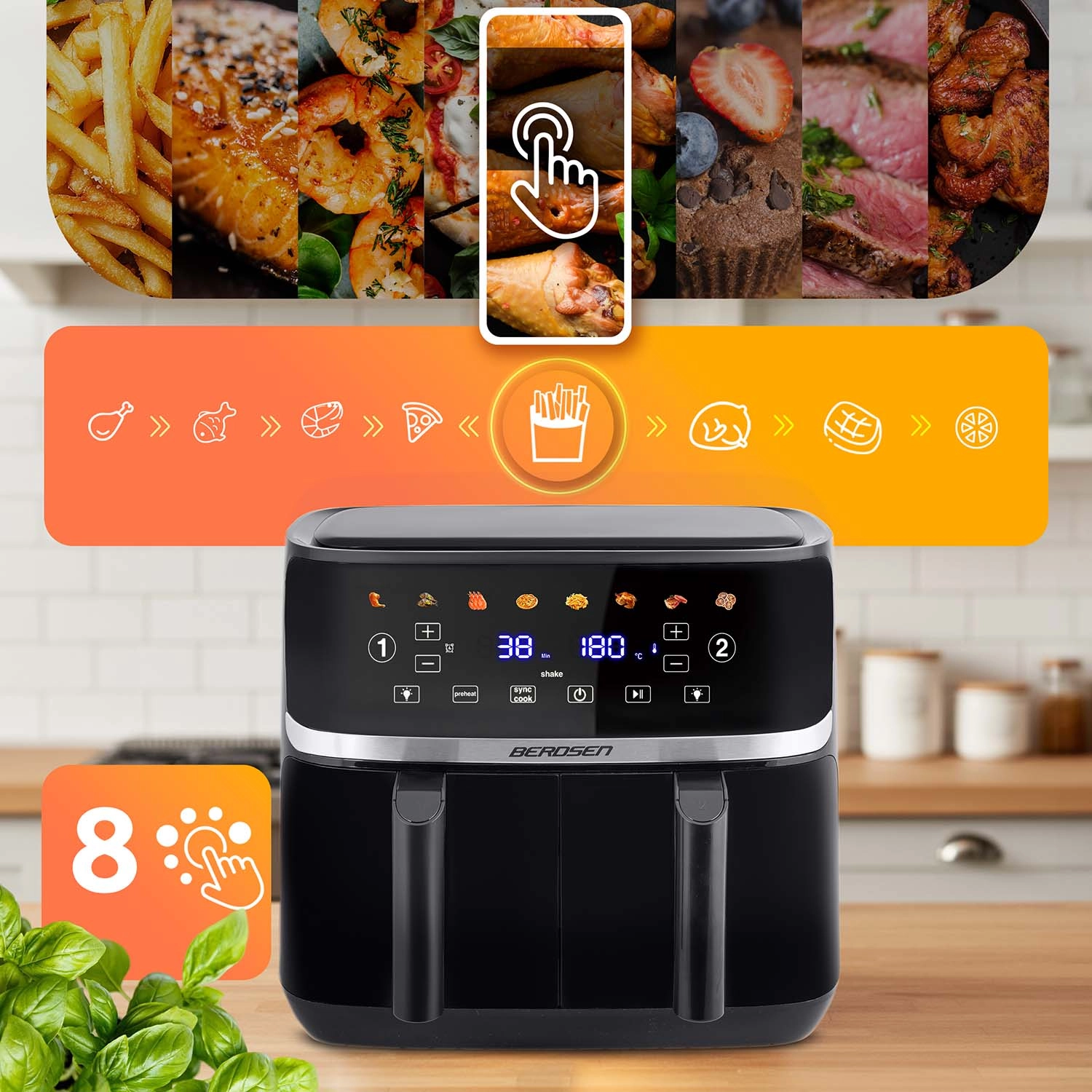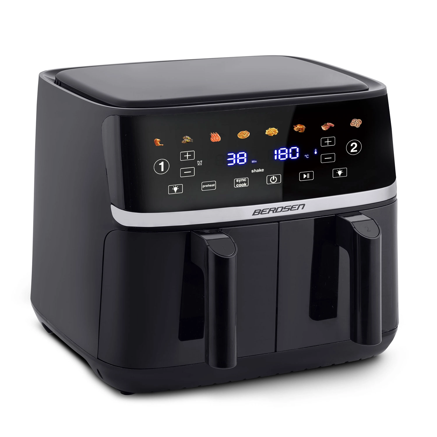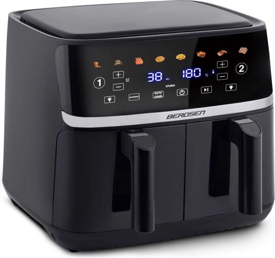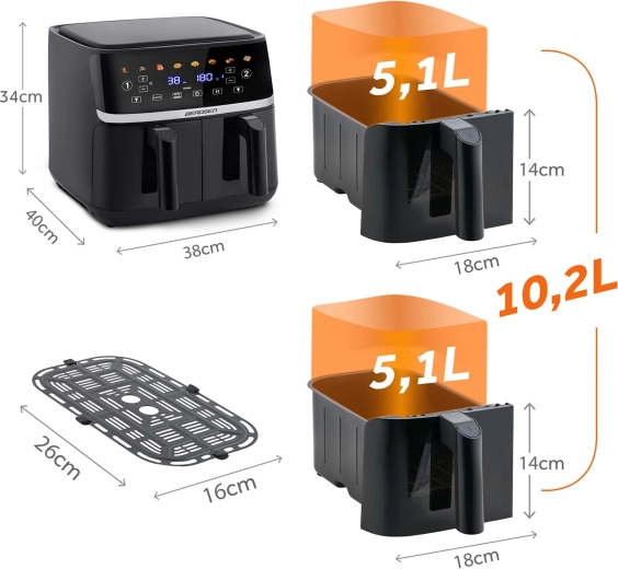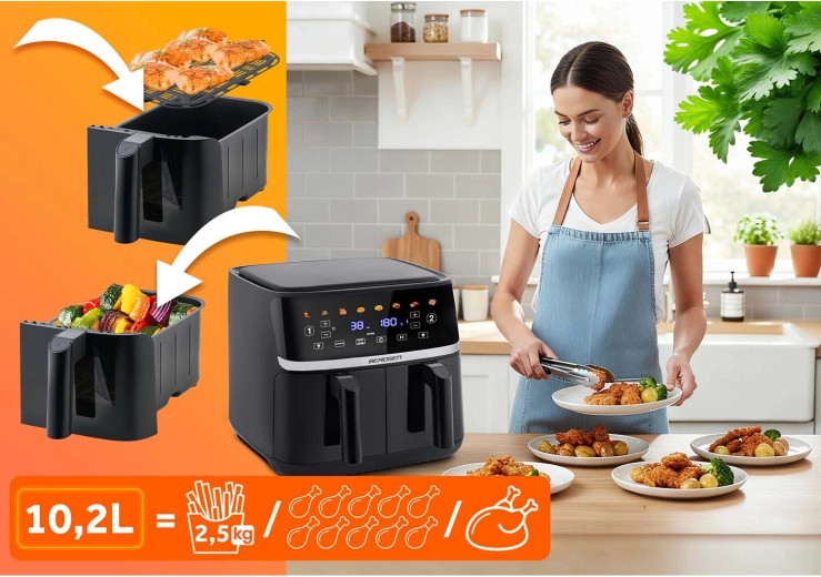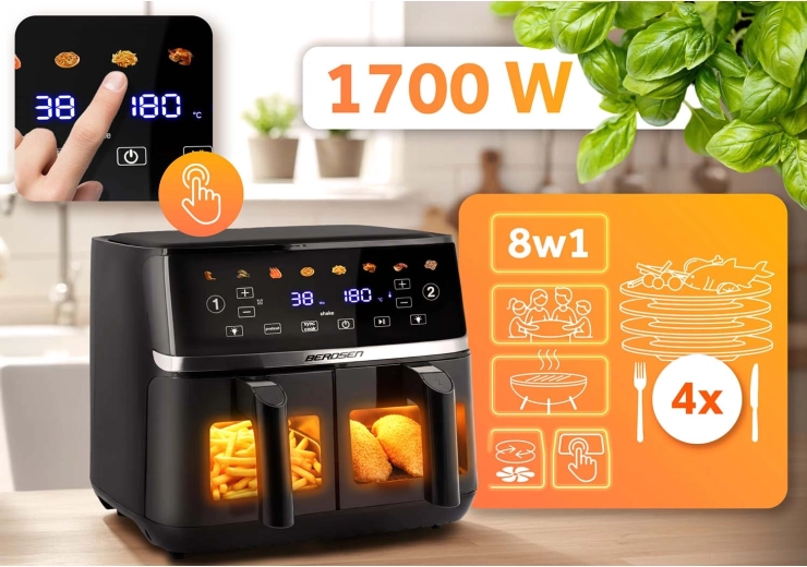 Fedezze fel a kényelmesebb és egészségesebb főzést a BERDSEN forrólevegős fritőzzel, amelynek űrtartalma 10,2 l, valamint kettős kamrával rendelkezik (2 × 5,1 l). A 1700 W teljesítménynek, a 8 automatikus programnak és az érintésvezérlésnek köszönhetően ropogós hasábburgonyát, szaftos húsokat és zöldségeket készíthet akár 90%-kal kevesebb zsiradékkal. A praktikus ablakok LED háttérvilágítással lehetővé teszik a sütés folyamatának követését a fiókok kinyitása nélkül, míg az előmelegítés, az időzített indítás és a forgatásra figyelmeztető jelzés igazán egyszerűvé teszik a főzést.